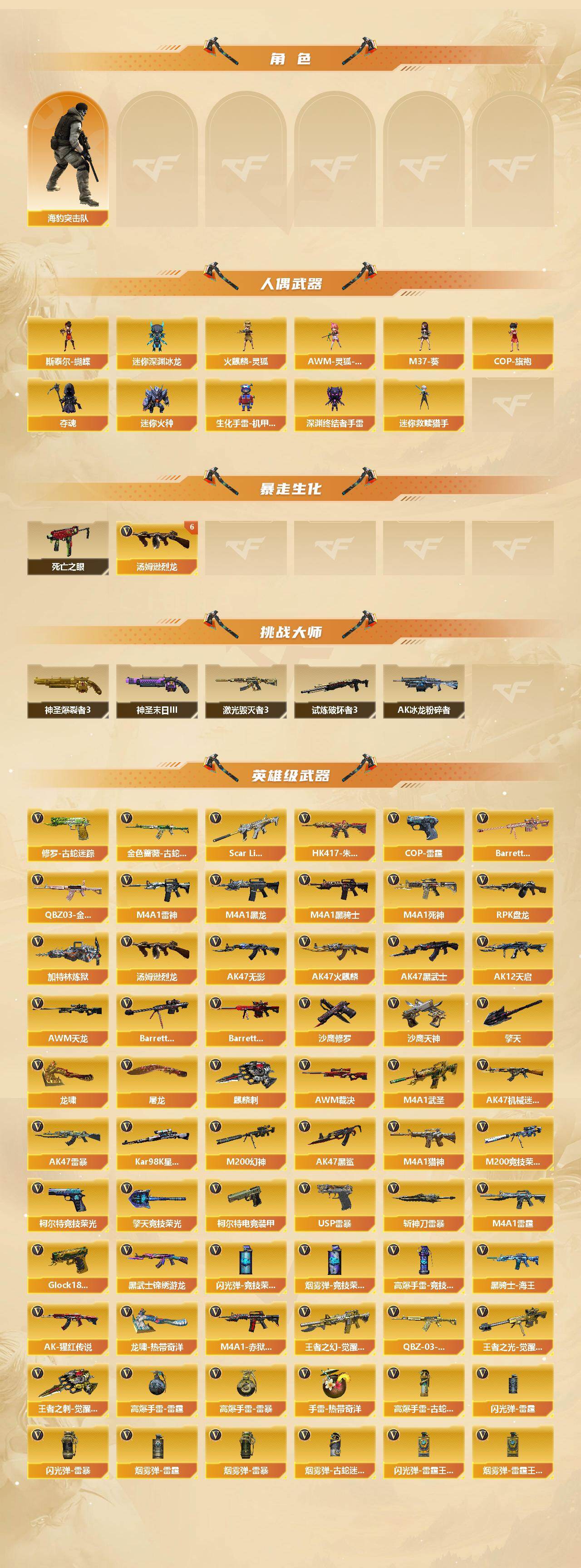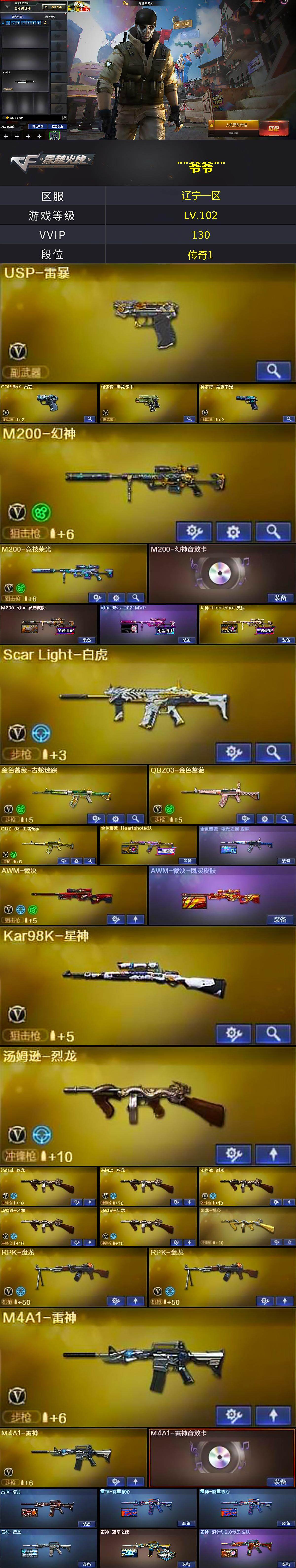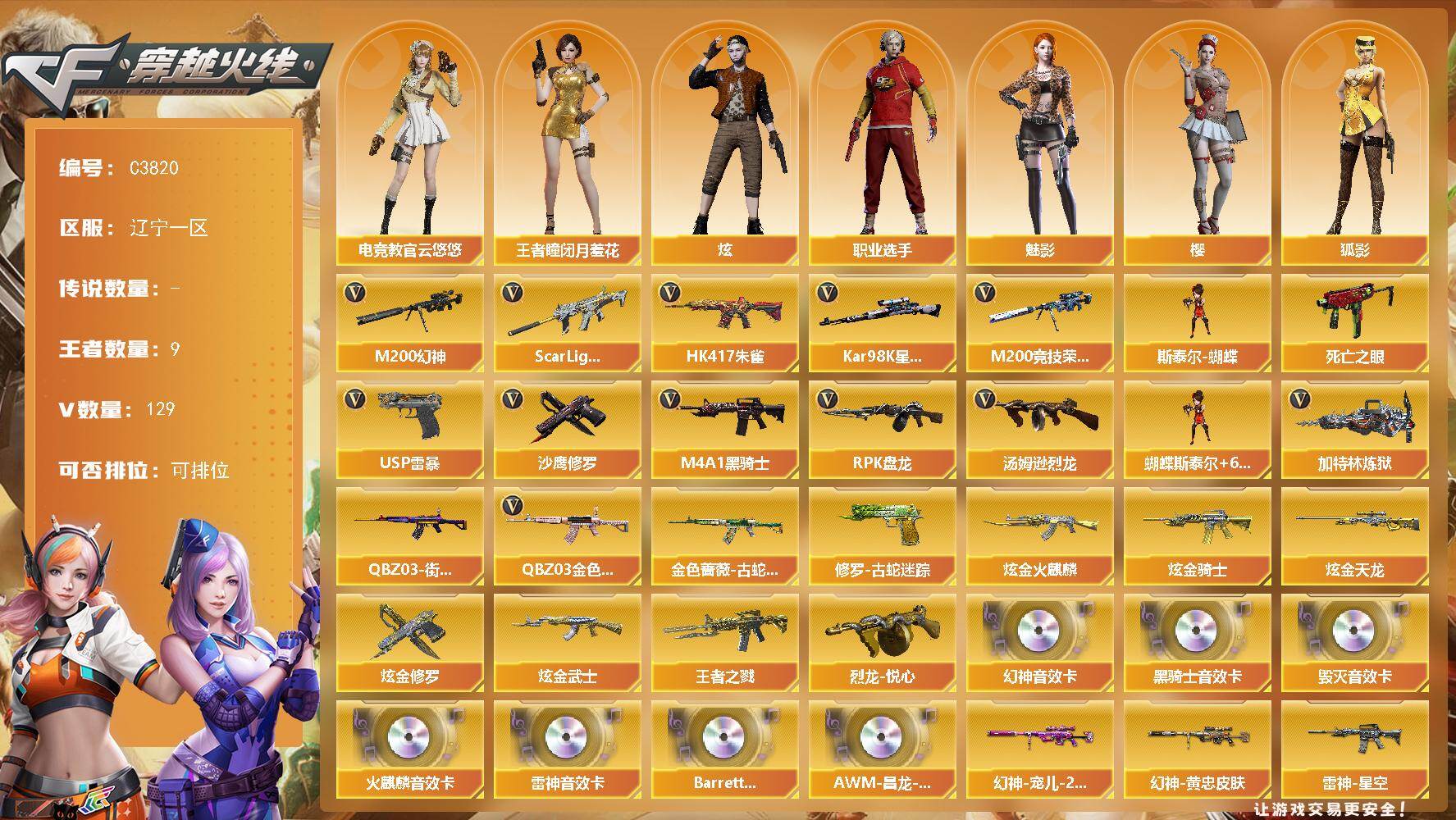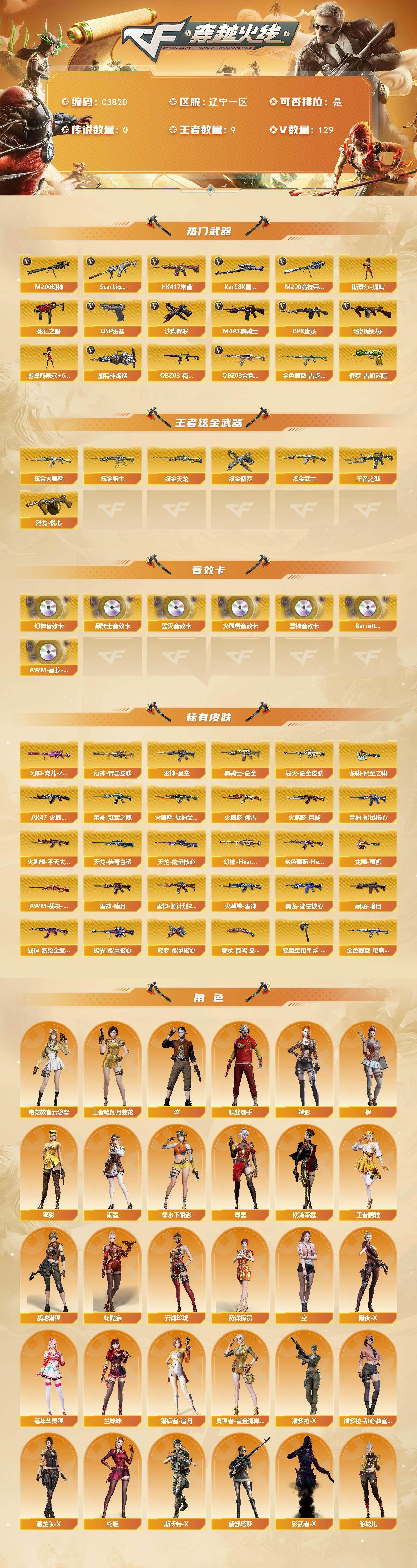 【306161】【306161】【C3820】辽宁一区-129V-9王者-5炫金【热门武器】:QBZ03-金色蔷薇,Scar Light-白虎,HK417-朱