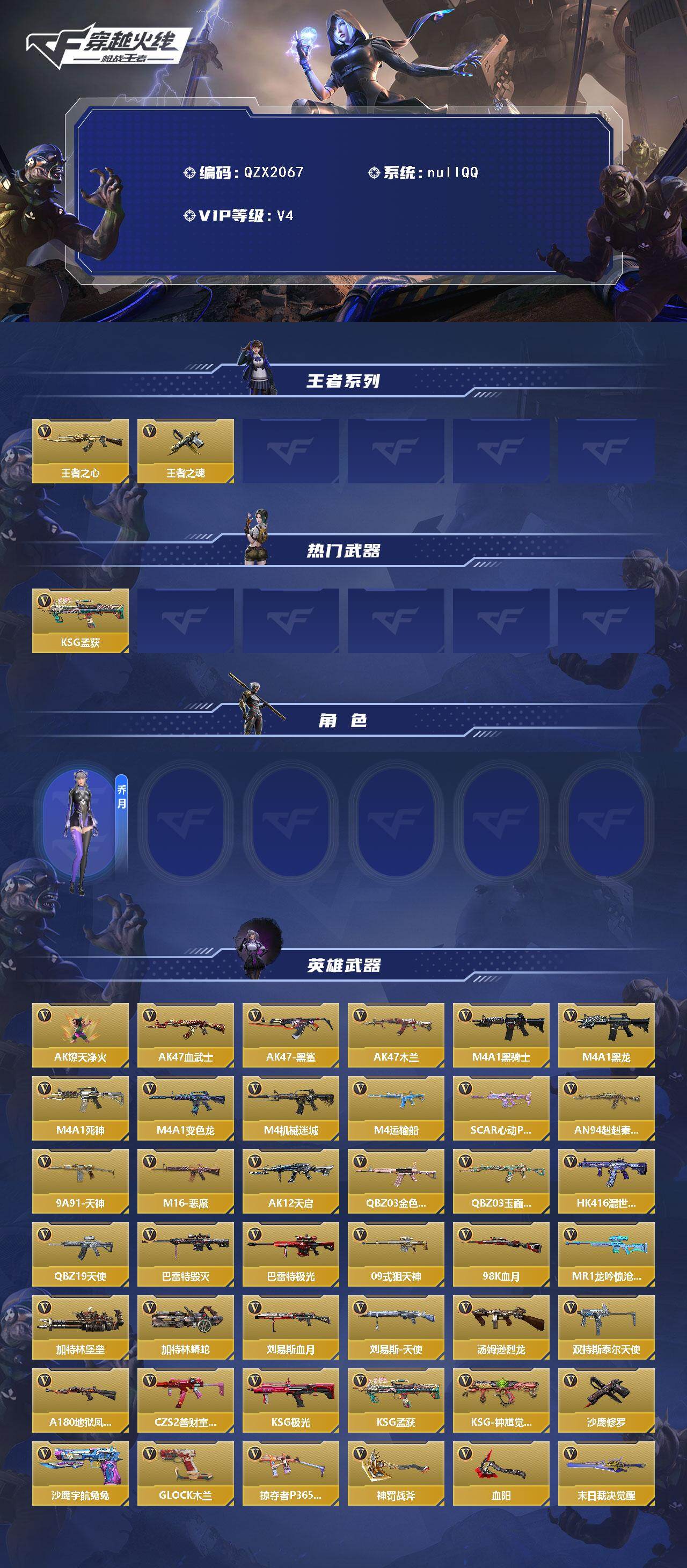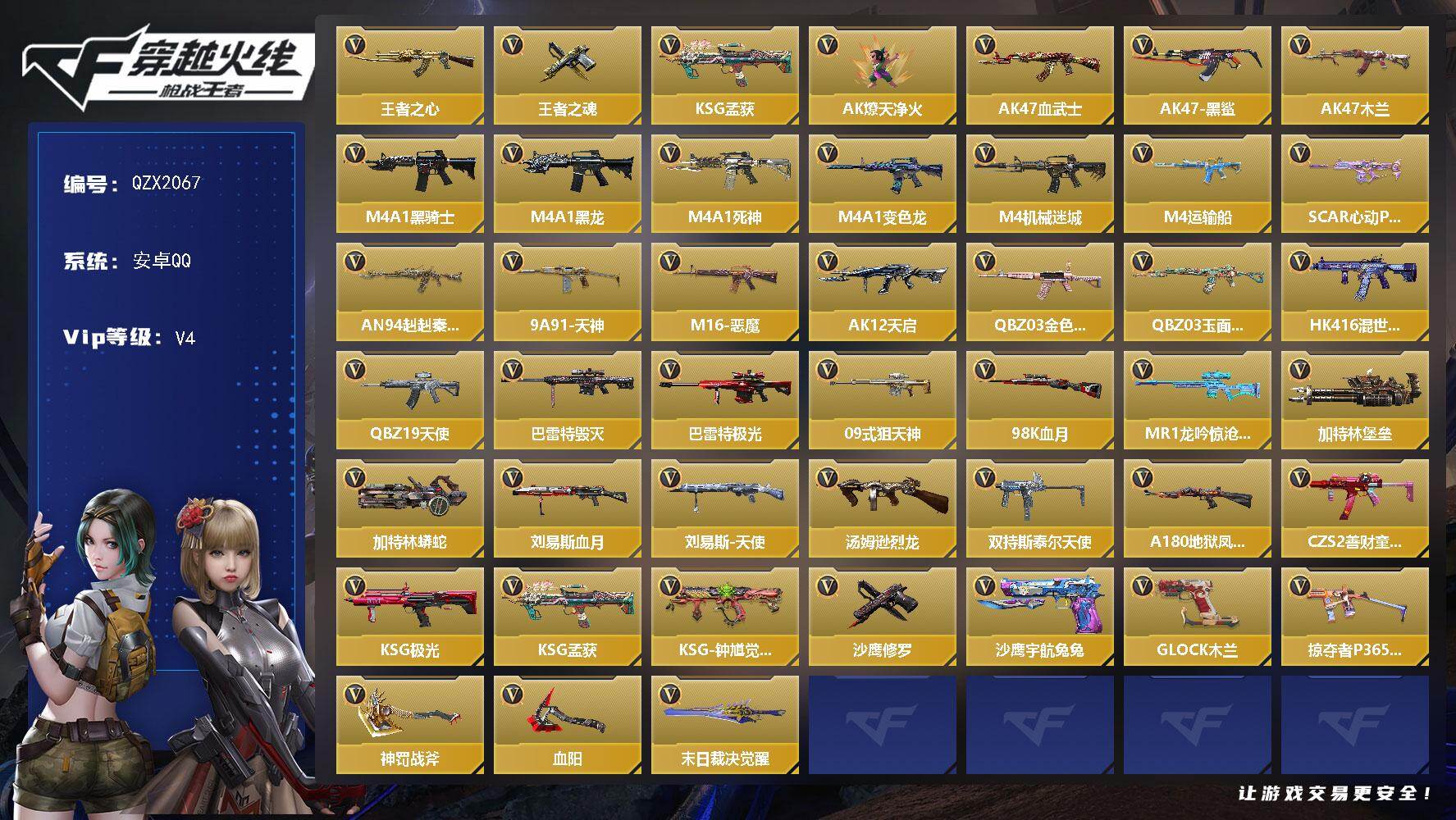 【306554】【QZX2067】VIP4/85V/王者之心/王者之魂/KSG-孟获/乔月/AK47-燎天净火/AK47-血武士/AK47-黑鲨/AK47-木兰/黑骑士/M4A1-黑龙/M4A1-死神/M4A1-变色龙/M4A1-机械迷城/M4A1-运输船/SCAR-心动PICK/AN94-赳赳秦师/9A91-天神/M16-恶魔/AK12-天启/QBZ03-金色蔷薇/QBZ03-玉面羞花/HK4