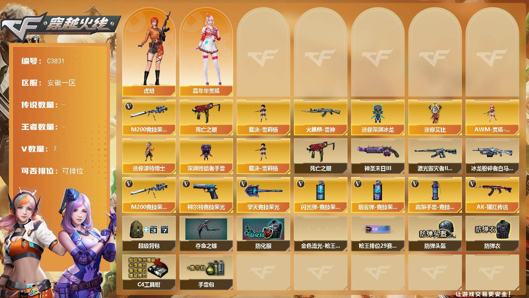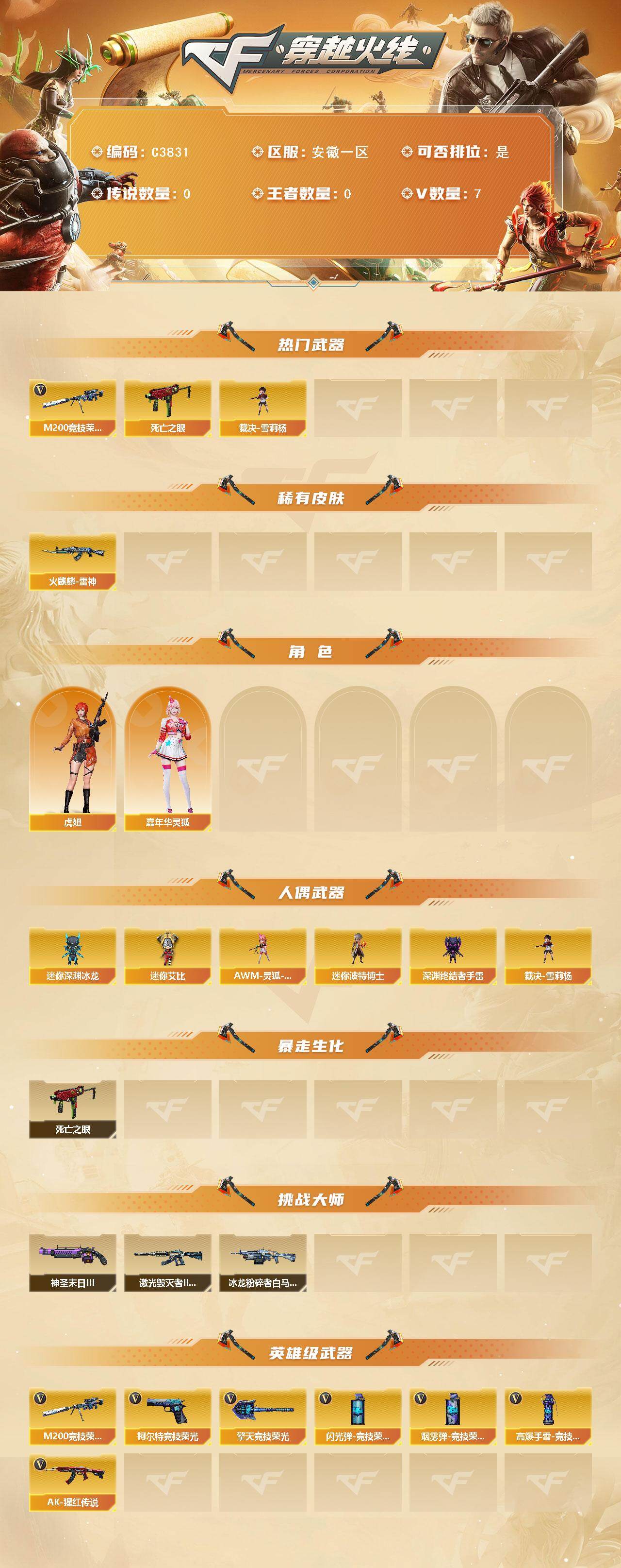 【306986】【306986】【C3831】安徽一区-7V-0王者-0炫金【热门武器】:M200-竞技荣光,死亡之眼,裁决-雪莉杨【皮肤】:火麒麟-雷神【角