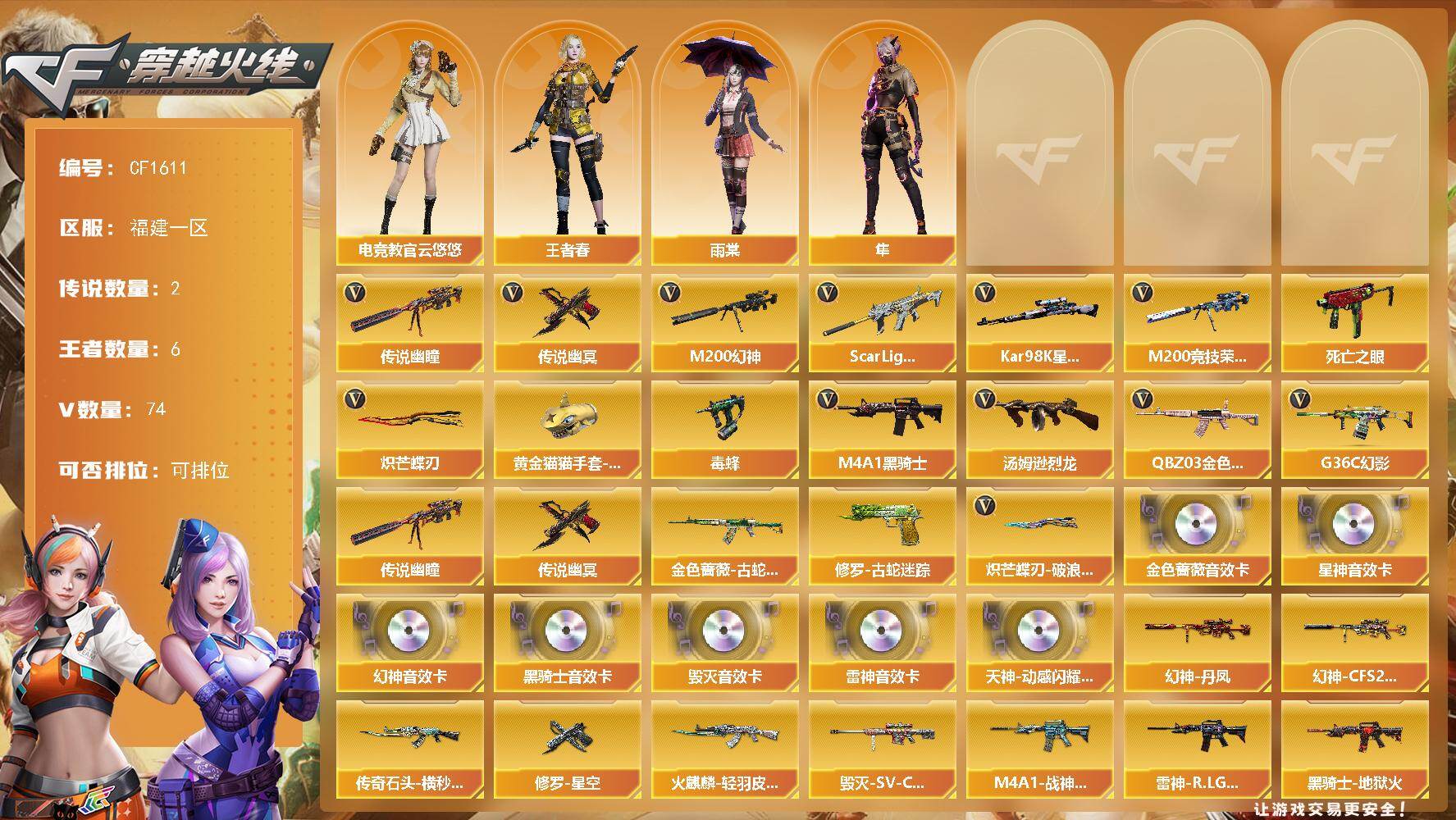 【421758】【421758】【CF1611】【商品标题】:福建一区-74V-6王者-0炫金【幻神三件套】【幻神8皮】【星神三件套】【金色蔷薇三件套】【毒蜂