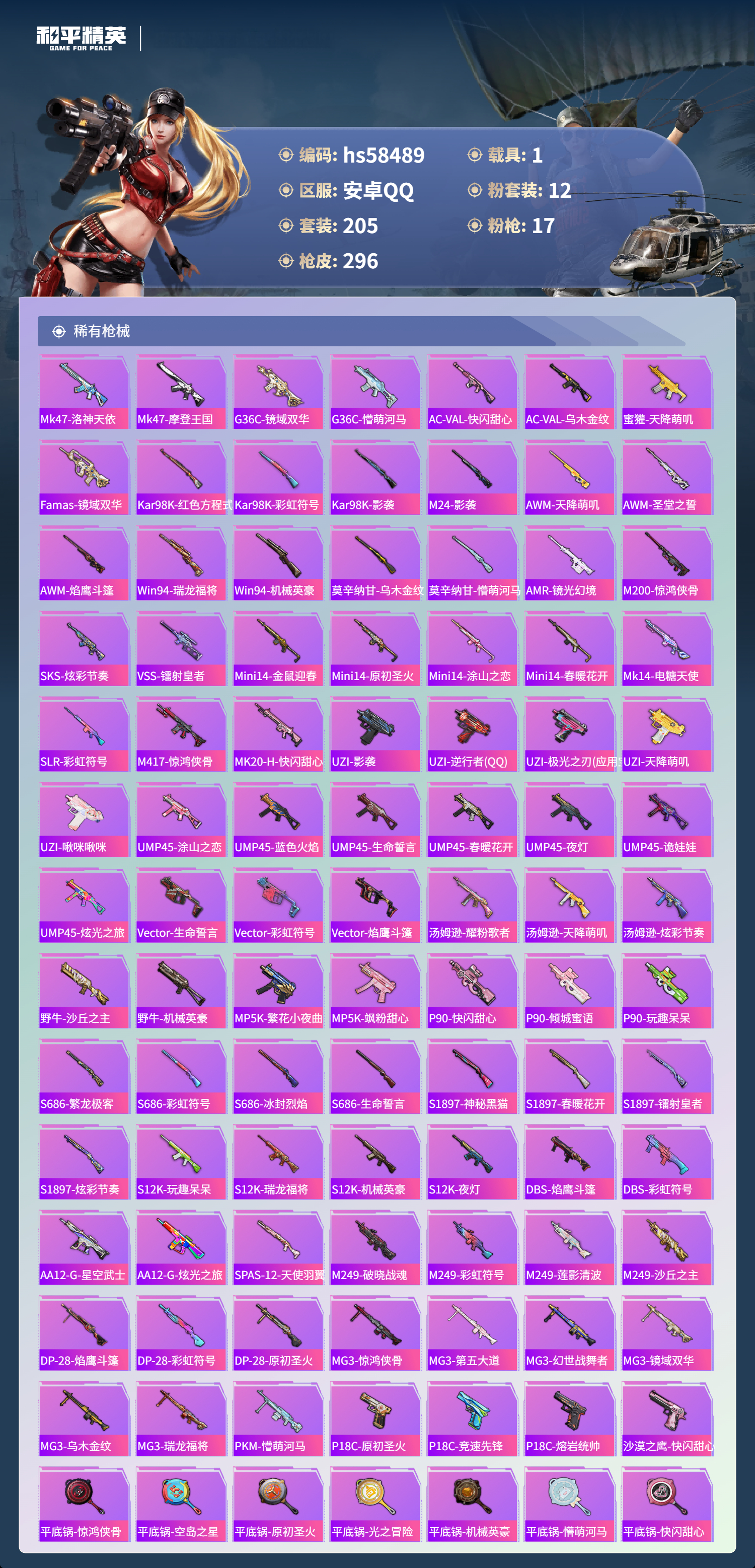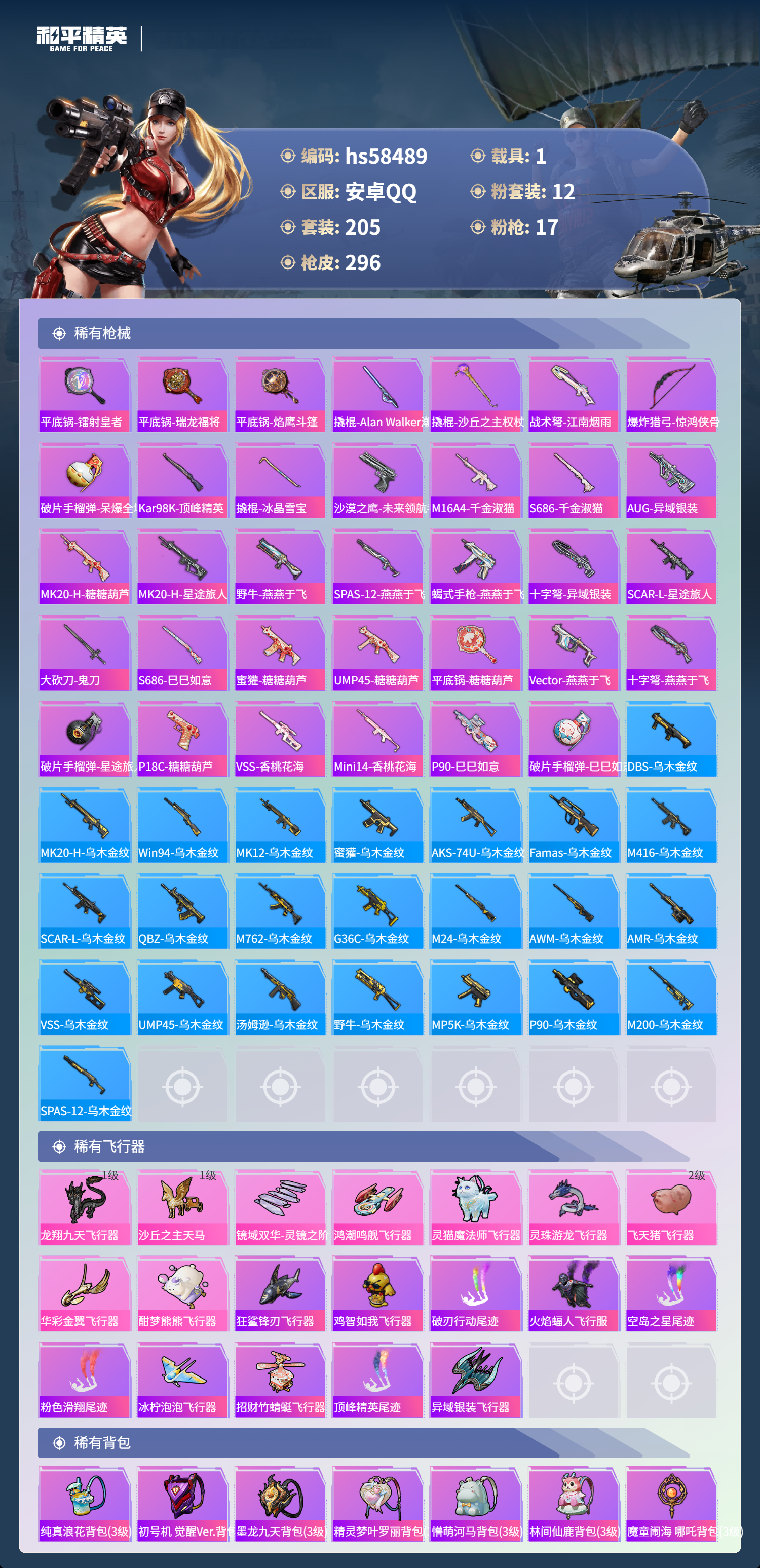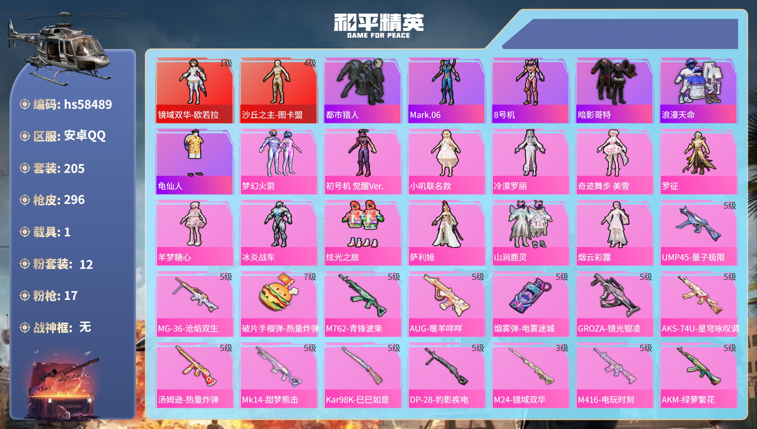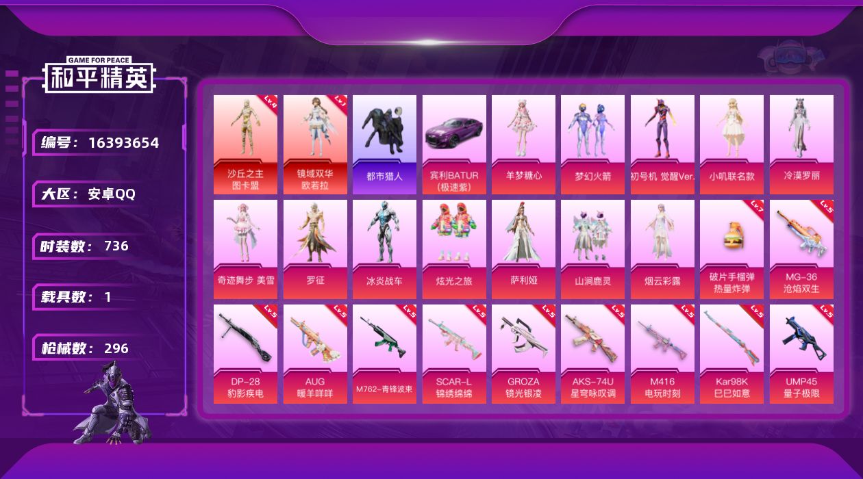 【421759】【不可二次】【安卓QQ】龟仙人 AKM-绿萝繁花 大橘为重 M762-青锋波束 漫步者 P90-沙丘之主 都市猎人 小叽联名款 机械英豪 极速红龙 镜域双华-欧若拉 M416-电玩时刻 沙丘之主-图卡盟 UMP45-量子极限 MK47-林间仙鹿 GROZA-林间仙鹿 山涧鹿灵 瑞龙福将 浪漫天命 团圆交子 软萌银虎 M24-镜域双华 M762-瑞龙福将 海洋之心 龙翔九天飞行器