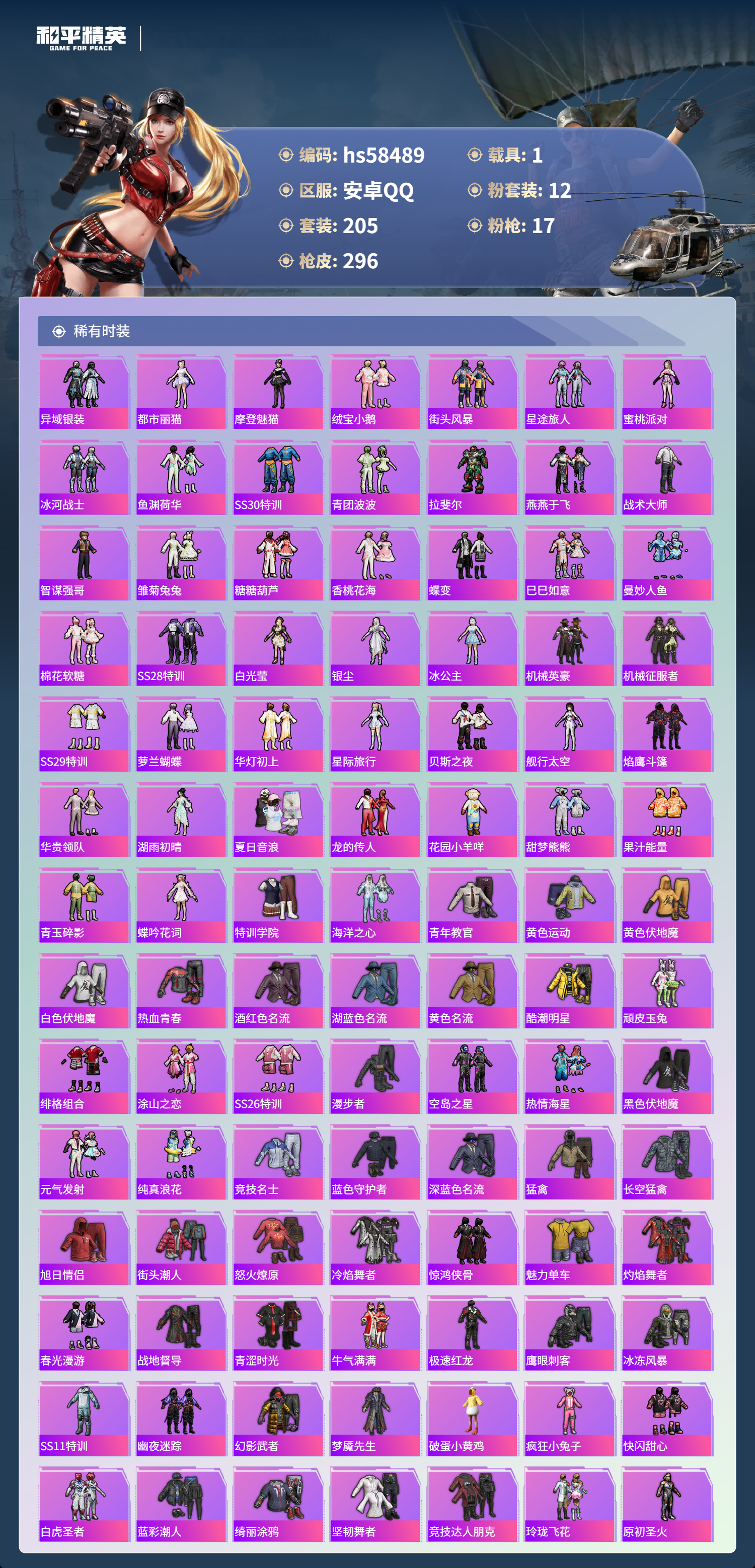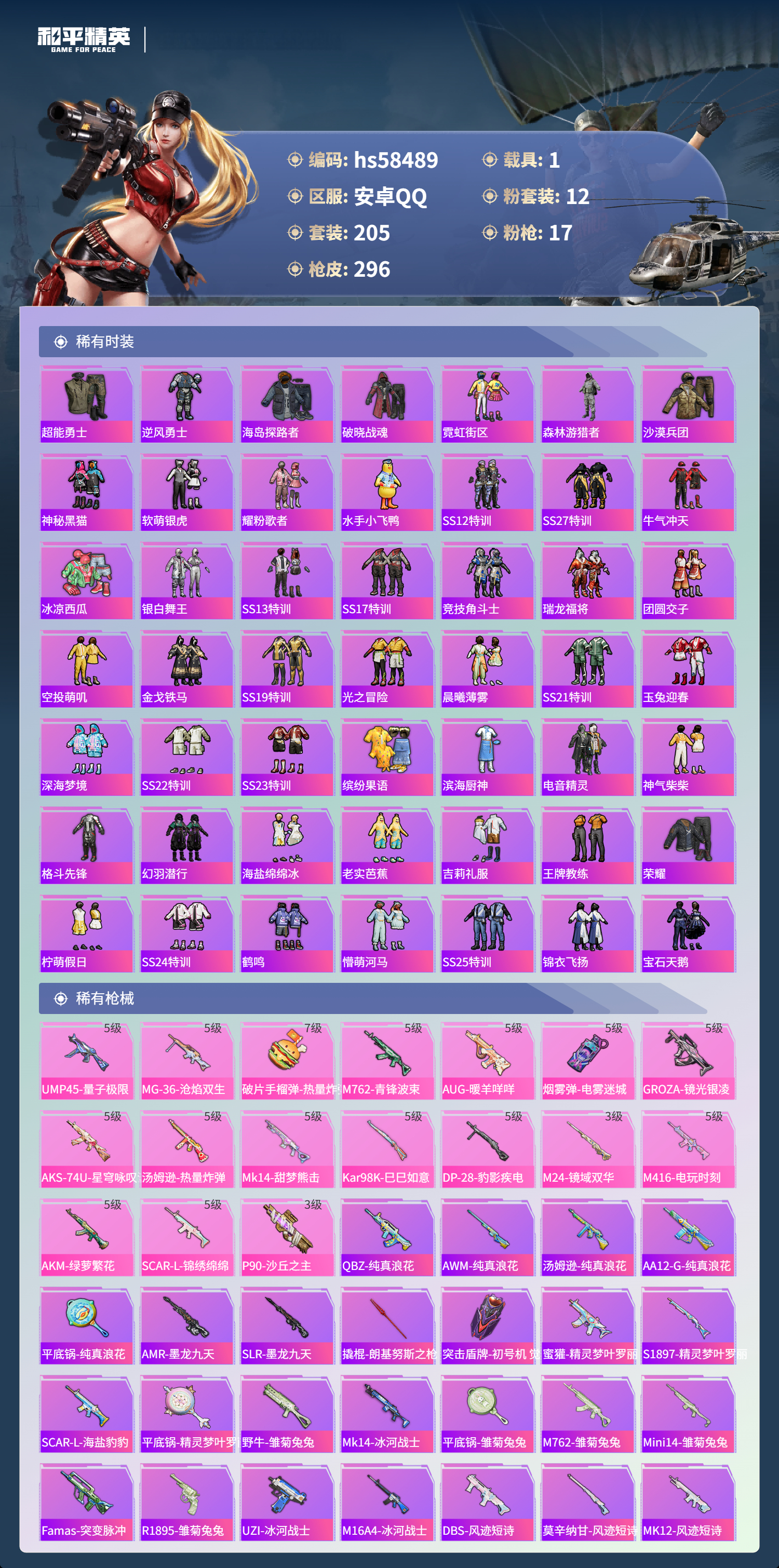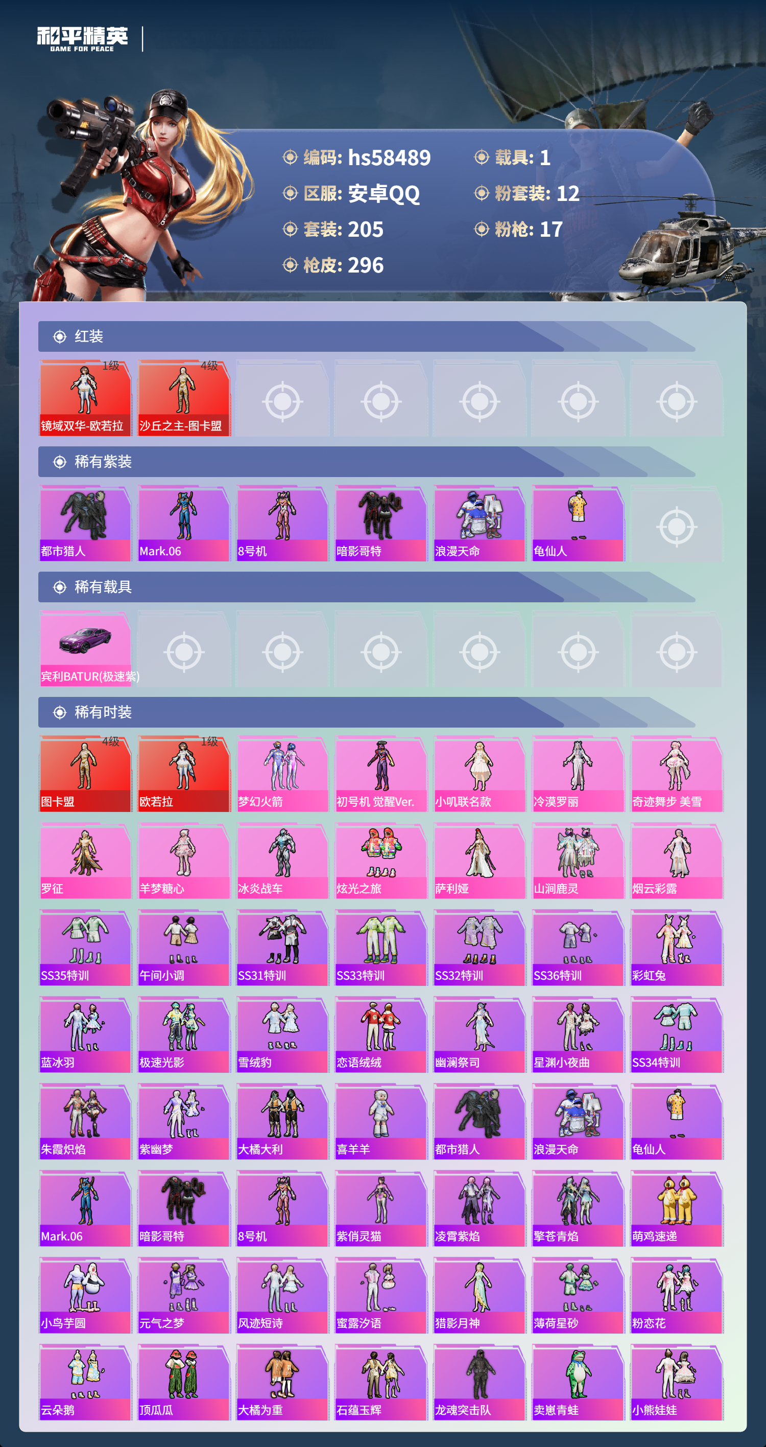 【421759】【不可二次】【安卓QQ】龟仙人 AKM-绿萝繁花 大橘为重 M762-青锋波束 漫步者 P90-沙丘之主 都市猎人 小叽联名款 机械英豪 极速红龙 镜域双华-欧若拉 M416-电玩时刻 沙丘之主-图卡盟 UMP45-量子极限 MK47-林间仙鹿 GROZA-林间仙鹿 山涧鹿灵 瑞龙福将 浪漫天命 团圆交子 软萌银虎 M24-镜域双华 M762-瑞龙福将 海洋之心 龙翔九天飞行器