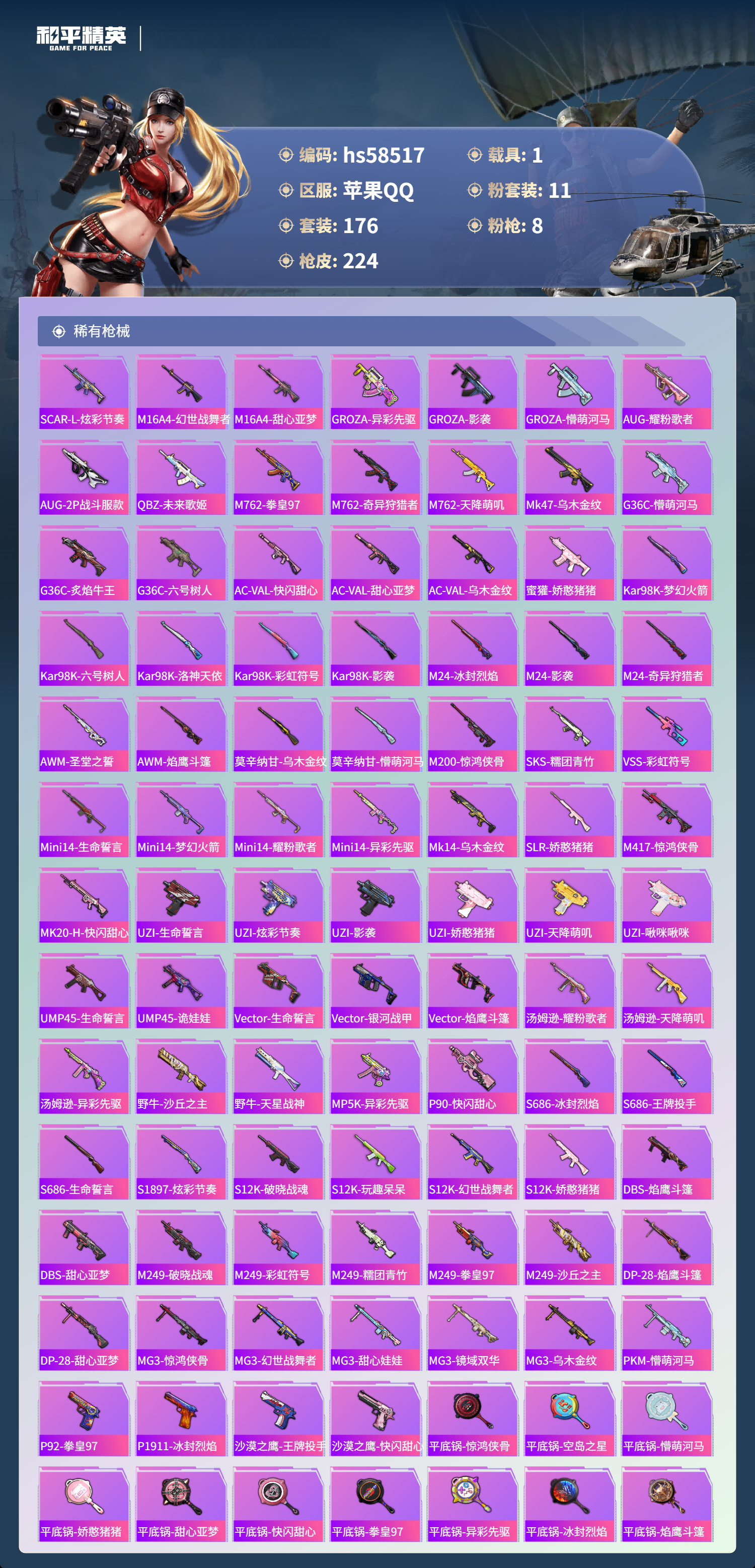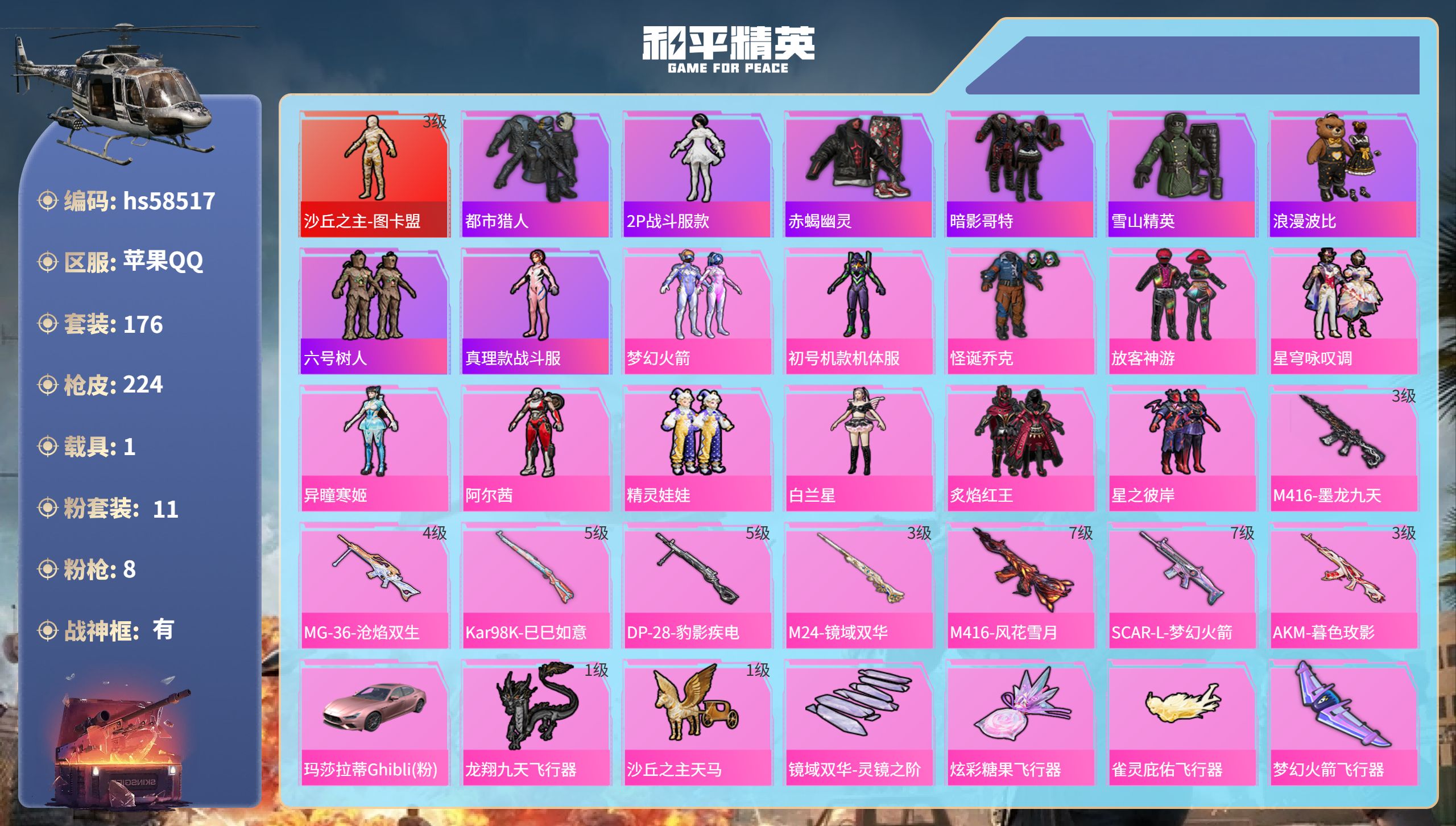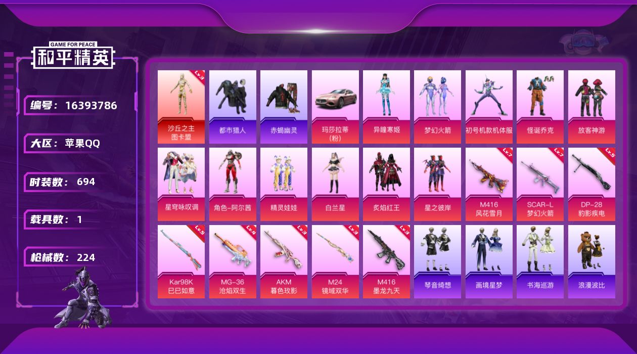 【421770】【不可二次】【苹果QQ】漫步者 都市猎人 炙焰红王 M24-奇异狩猎者 赤蝎幽灵 M762-奇异狩猎者 沙丘之主-图卡盟 放客神游 星之彼岸 M416-仓鼠灰灰 浪漫波比 梦幻火箭飞行器 SCAR-L-梦幻火箭 M24-镜域双华 SS1特训 怪诞乔克 SCAR-L梦幻火箭 狂沙舞者 龙翔九天飞行器 M416-墨龙九天 精灵娃娃 M416-风花雪月 梦幻火箭 六号树人 玛莎拉蒂粉色