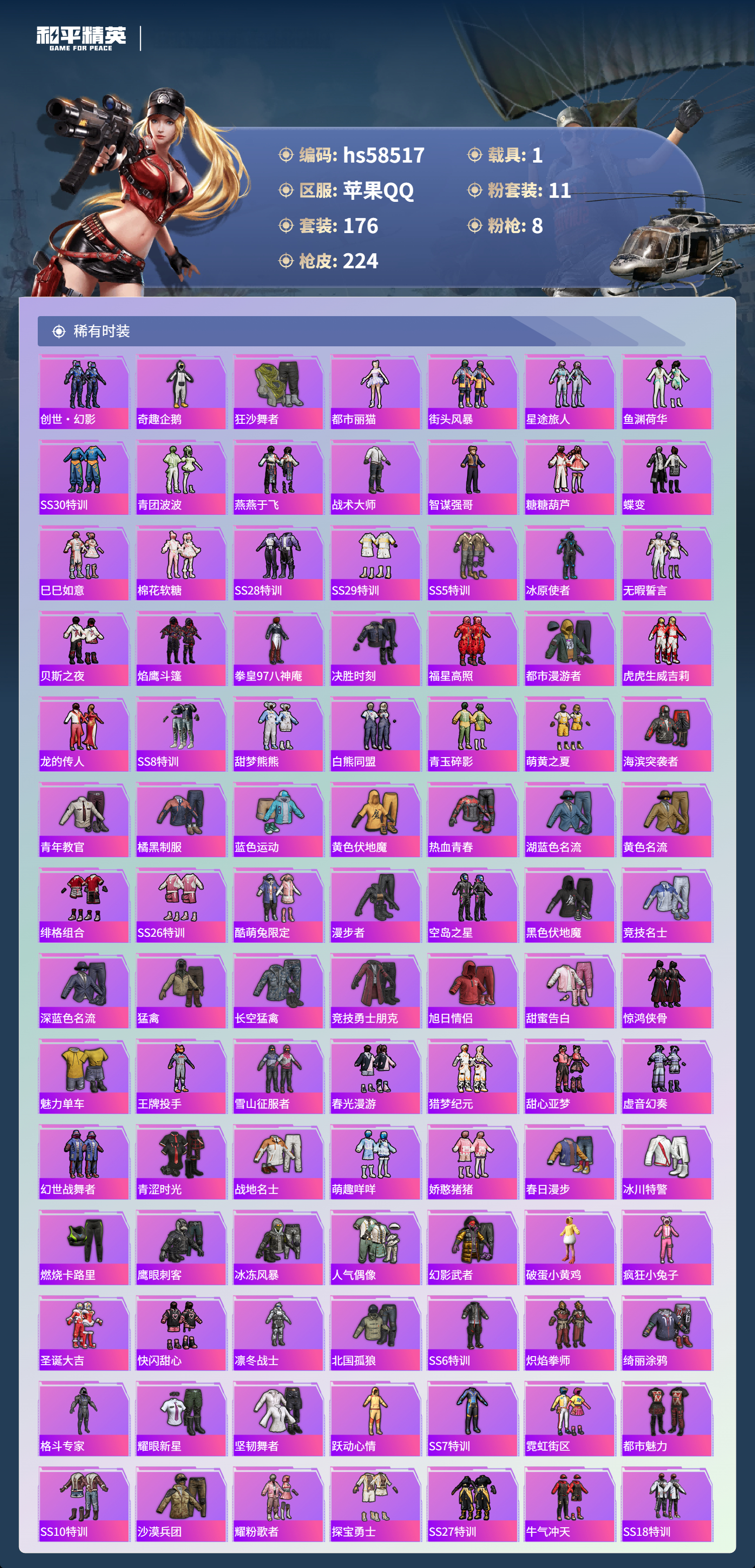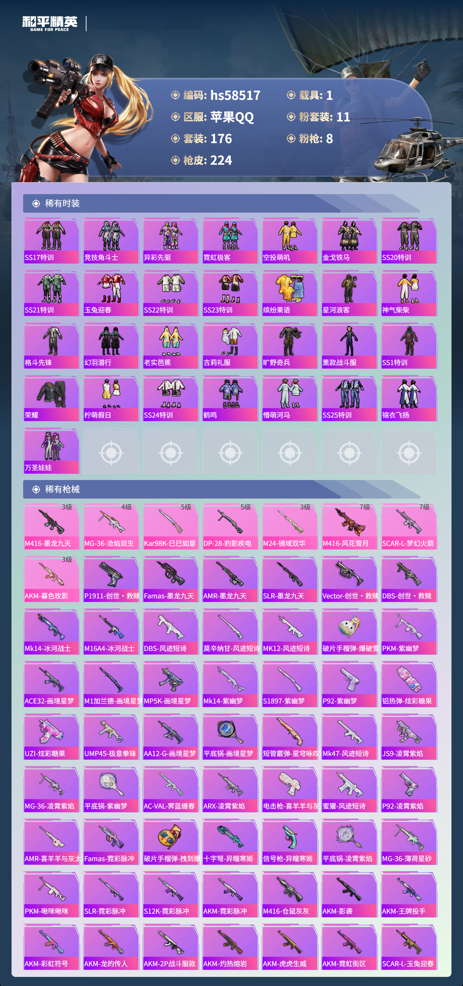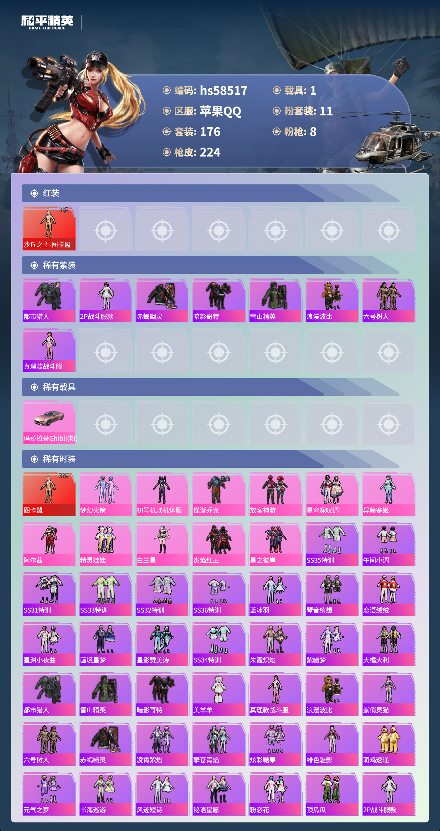 【421770】【不可二次】【苹果QQ】漫步者 都市猎人 炙焰红王 M24-奇异狩猎者 赤蝎幽灵 M762-奇异狩猎者 沙丘之主-图卡盟 放客神游 星之彼岸 M416-仓鼠灰灰 浪漫波比 梦幻火箭飞行器 SCAR-L-梦幻火箭 M24-镜域双华 SS1特训 怪诞乔克 SCAR-L梦幻火箭 狂沙舞者 龙翔九天飞行器 M416-墨龙九天 精灵娃娃 M416-风花雪月 梦幻火箭 六号树人 玛莎拉蒂粉色
