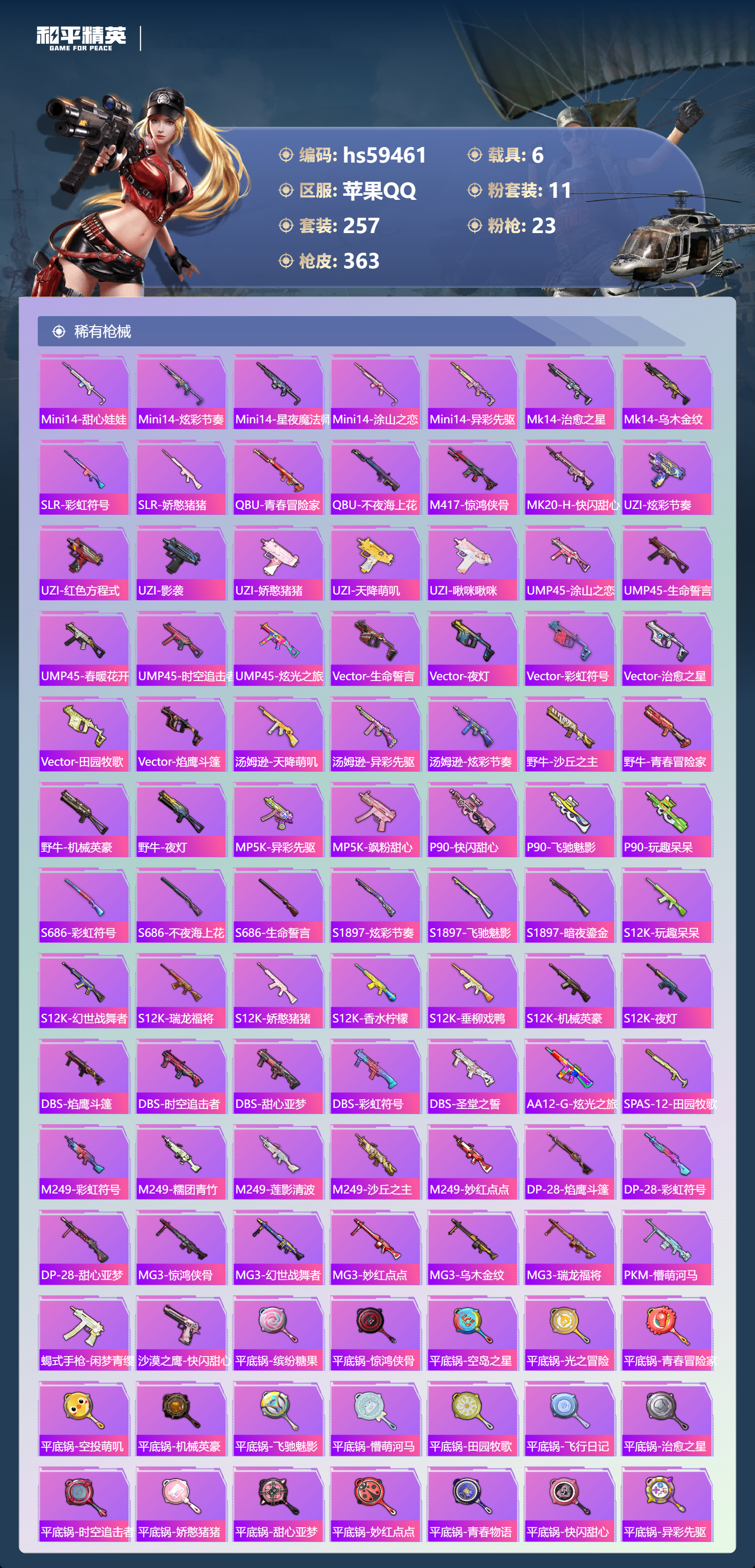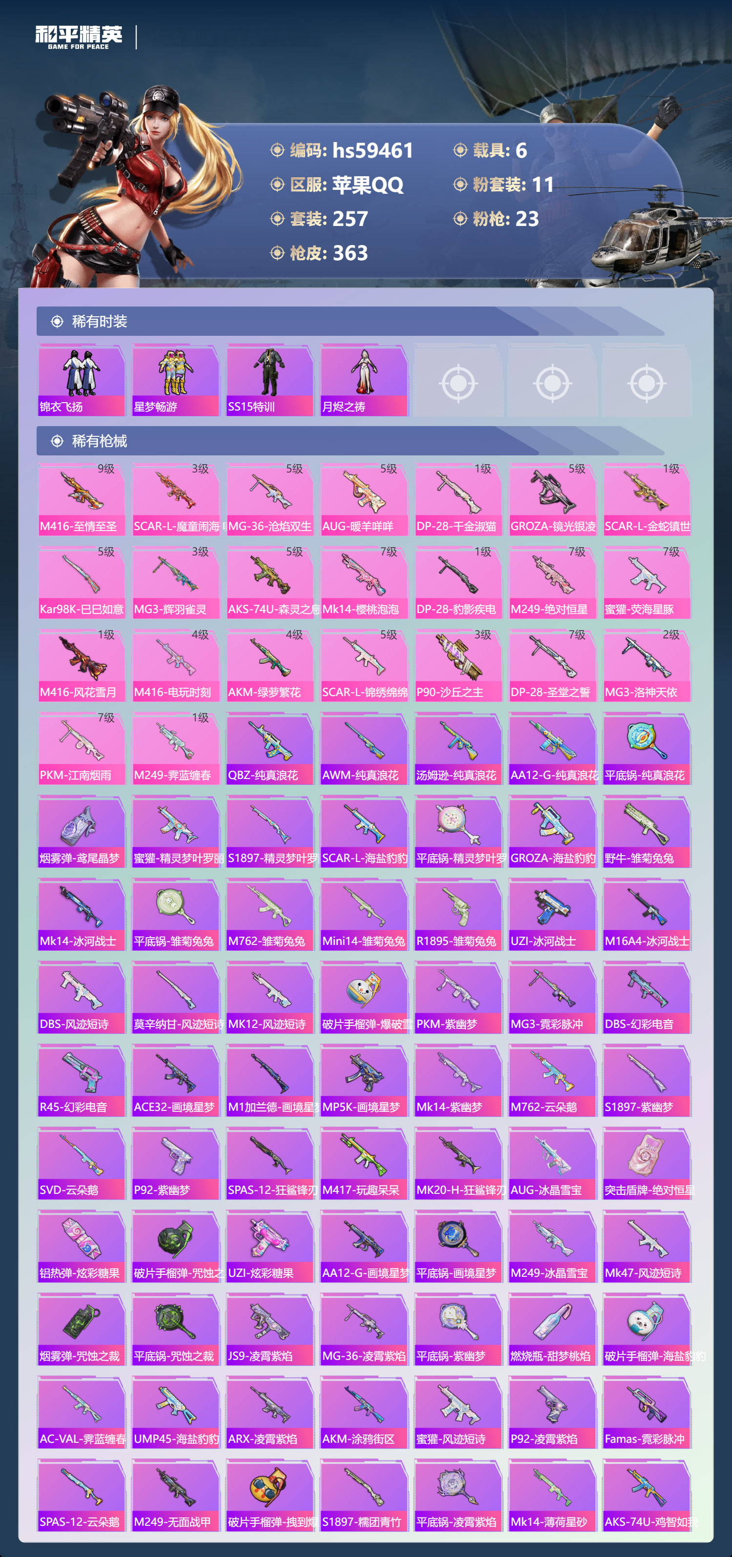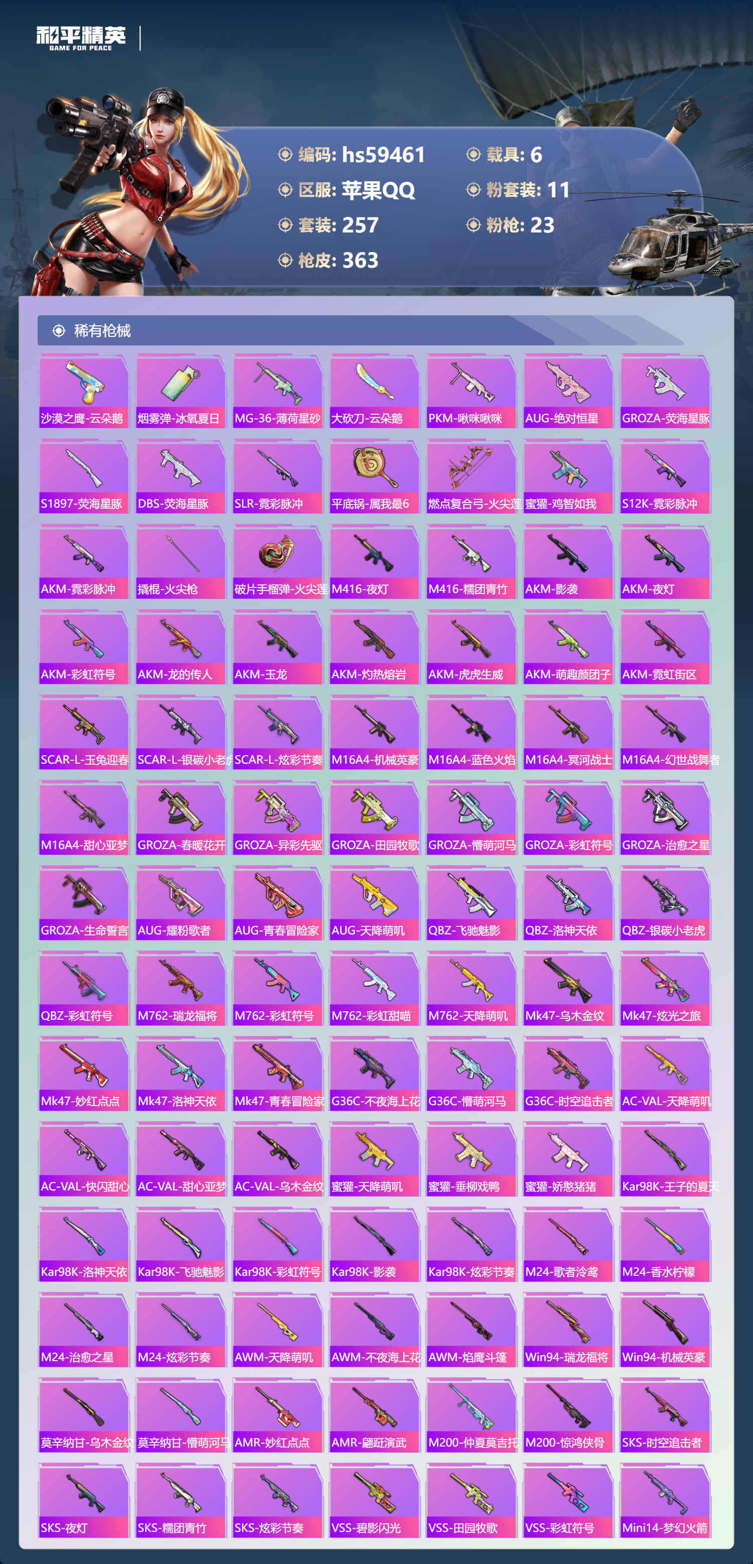 【422600】【可二次】【苹果QQ】龟仙人 AKM-绿萝繁花 木乃伊 大橘为重 P90-沙丘之主 都市猎人 PKM-江南烟雨 机械英豪 M416-电玩时刻 沙丘之主-图卡盟 巡查衣 M416-至情至圣 浪漫假日 M24-香水柠檬 魔童闹海-哪吒 瑞龙福将 醒狮腾龙 团圆交子 兰博SVJ绿色 DP-28-圣堂之誓 奇异狩猎者 M762-瑞龙福将 MG3-洛神天依 SCAR-L-锦绣绵绵 白月香洋