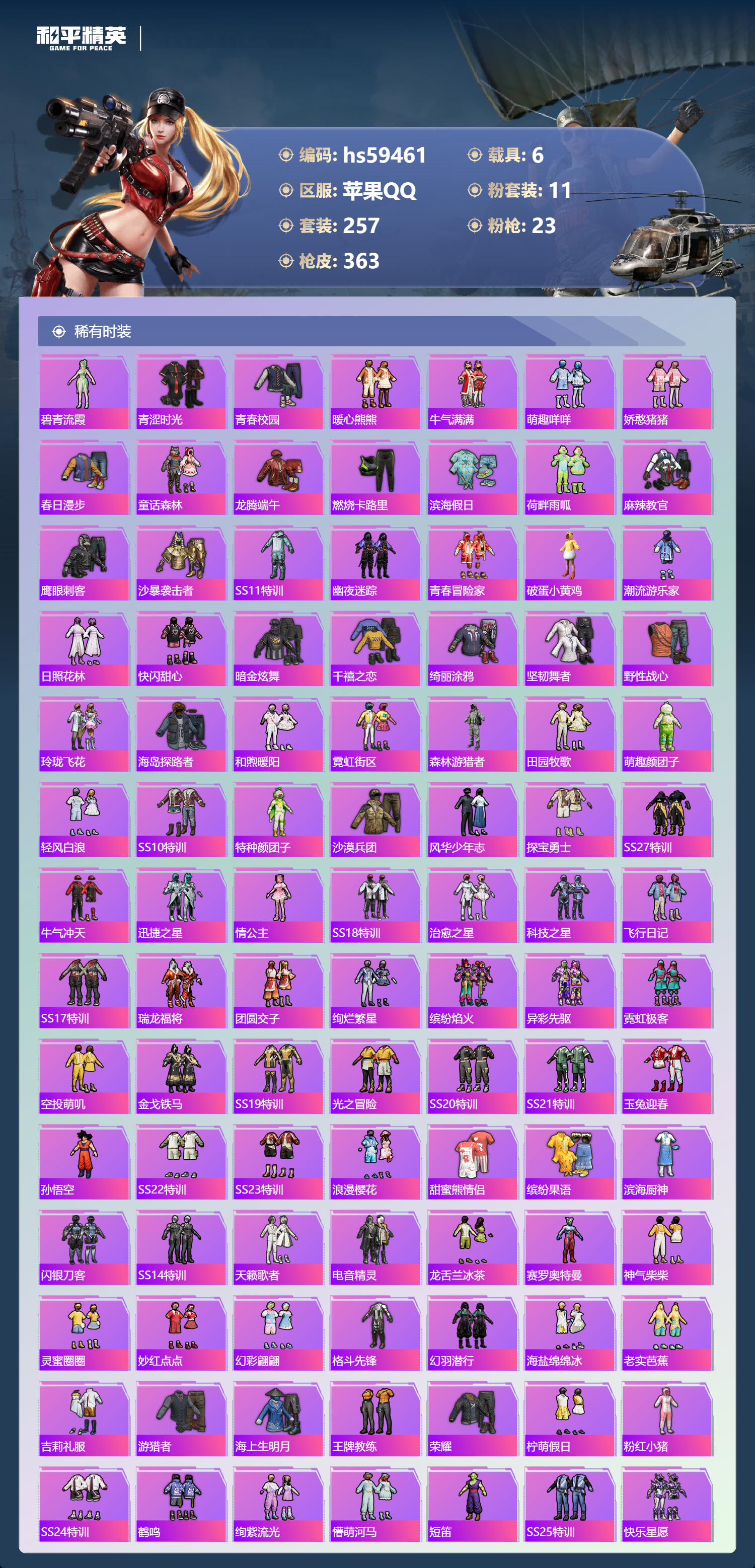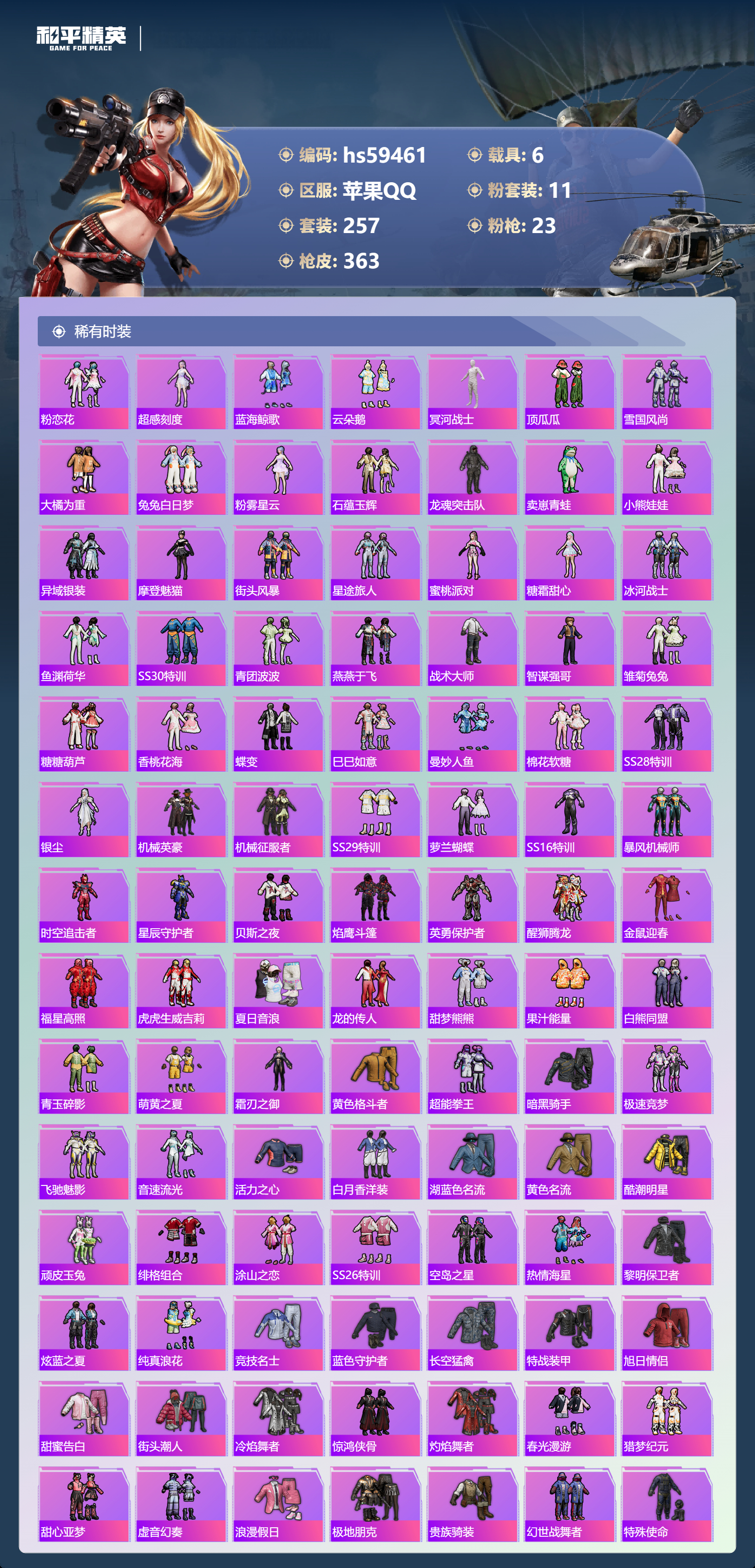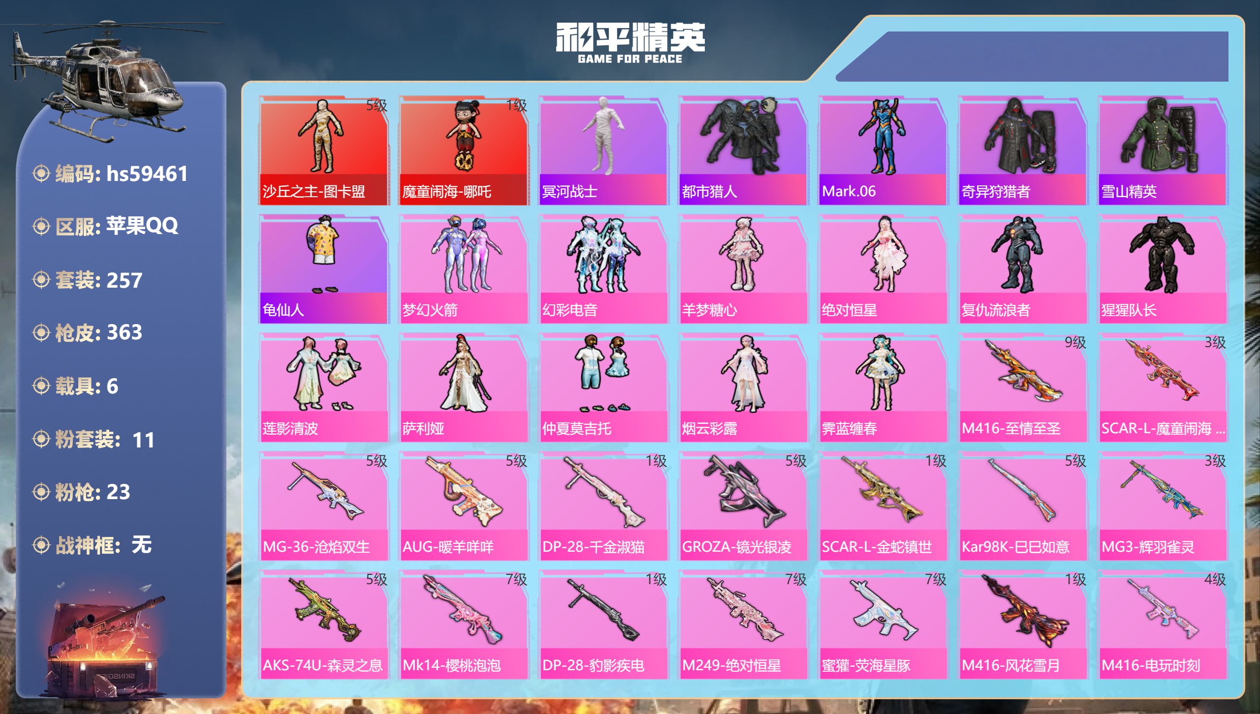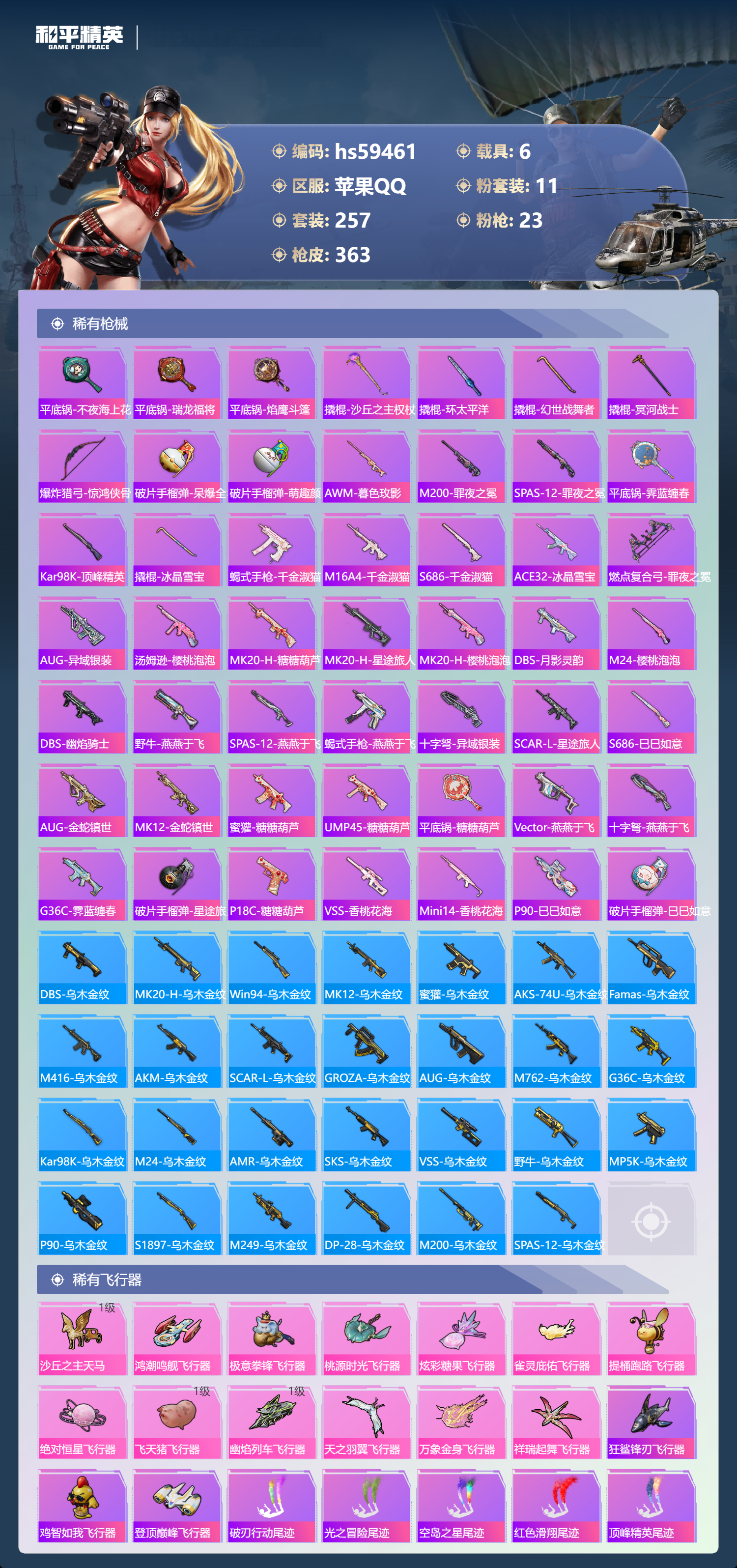 【422600】【可二次】【苹果QQ】龟仙人 AKM-绿萝繁花 木乃伊 大橘为重 P90-沙丘之主 都市猎人 PKM-江南烟雨 机械英豪 M416-电玩时刻 沙丘之主-图卡盟 巡查衣 M416-至情至圣 浪漫假日 M24-香水柠檬 魔童闹海-哪吒 瑞龙福将 醒狮腾龙 团圆交子 兰博SVJ绿色 DP-28-圣堂之誓 奇异狩猎者 M762-瑞龙福将 MG3-洛神天依 SCAR-L-锦绣绵绵 白月香洋