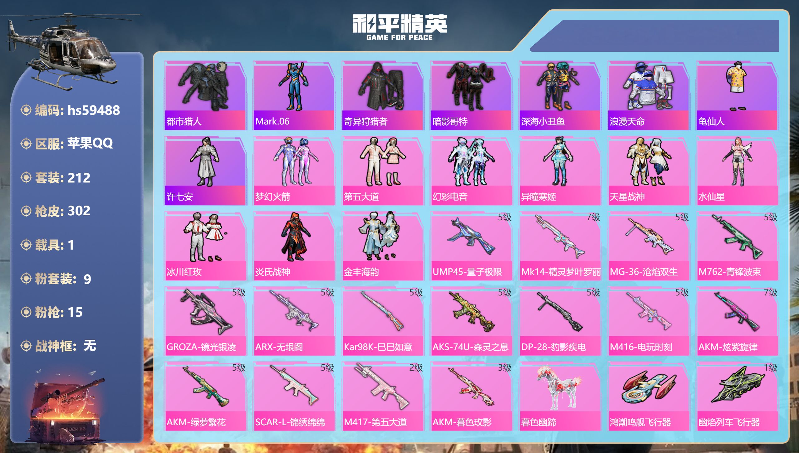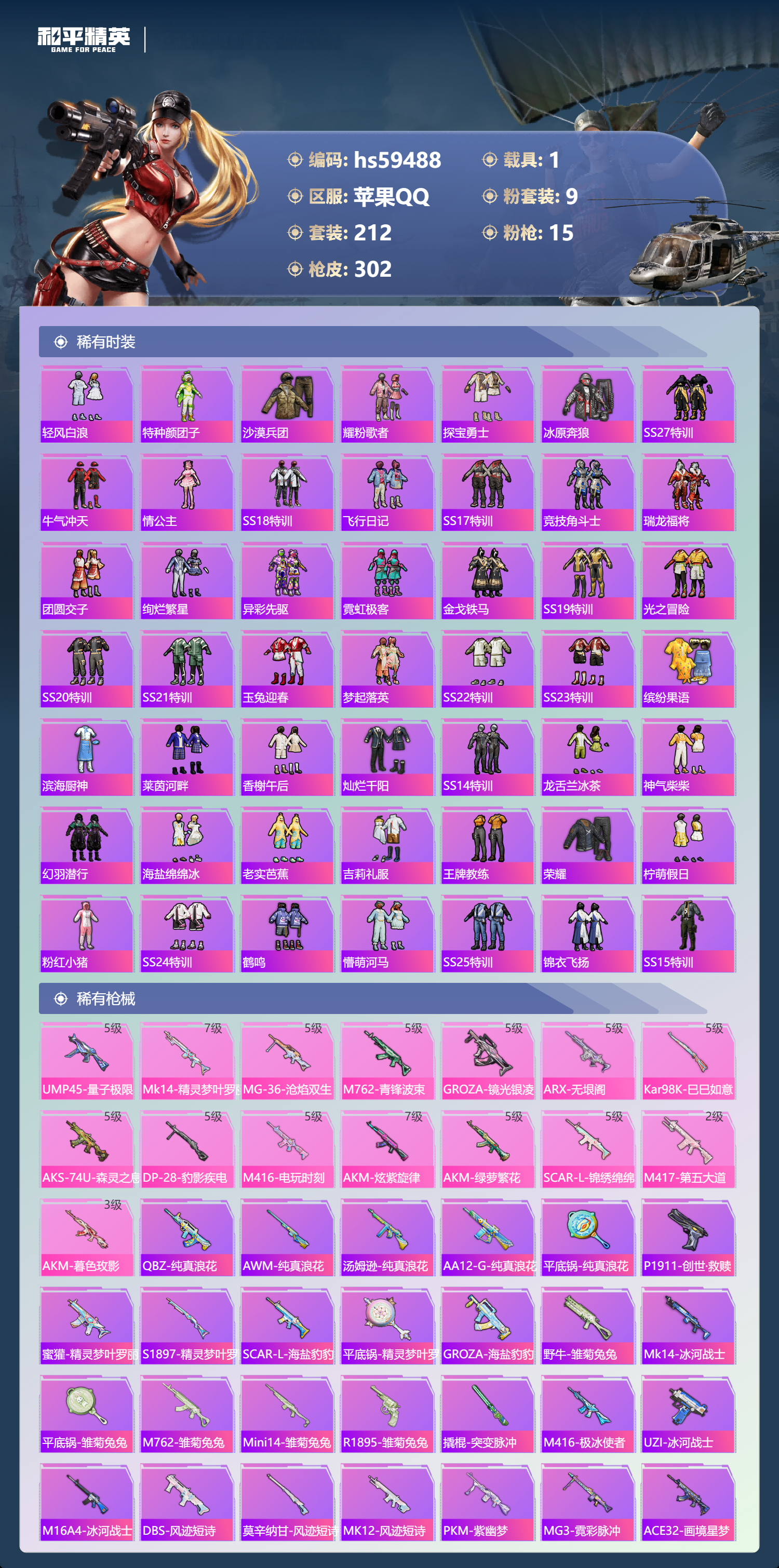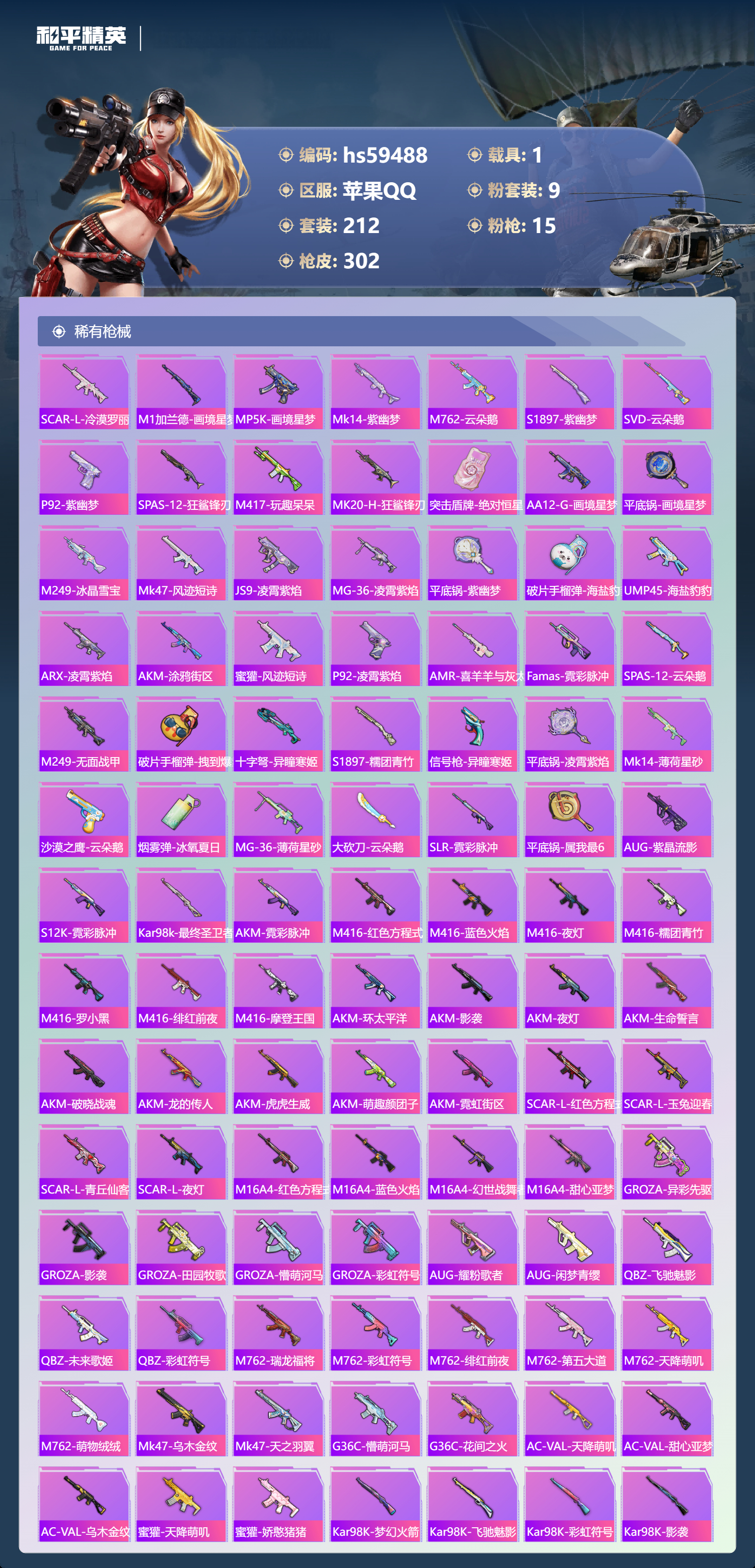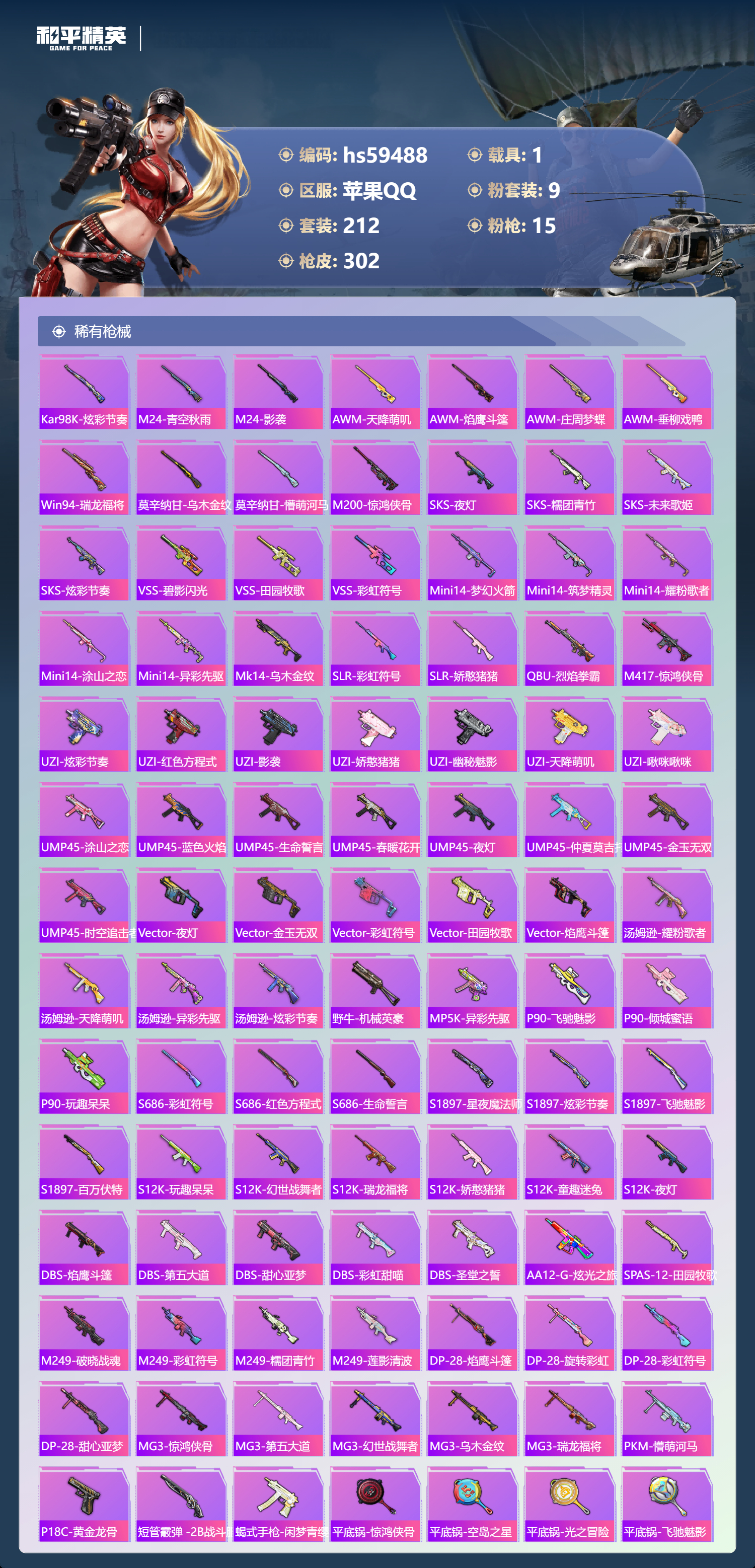 【422632】【不可二次】【苹果QQ】龟仙人 AKM-绿萝繁花 MK14-精灵梦叶罗丽 M762-青锋波束 漫步者 都市猎人 梦起落英 M416-电玩时刻 UMP45-量子极限 深海小丑鱼 瑞龙福将 浪漫天命 激萌罗小黑 团圆交子 奇异狩猎者 M762-瑞龙福将 M417射手步枪 狂沙舞者 SCAR-L-锦绣绵绵 AKM-炫紫旋律 梦幻火箭 粉红小猪 天之羽翼飞行器 M417-第五大道 暗影哥特