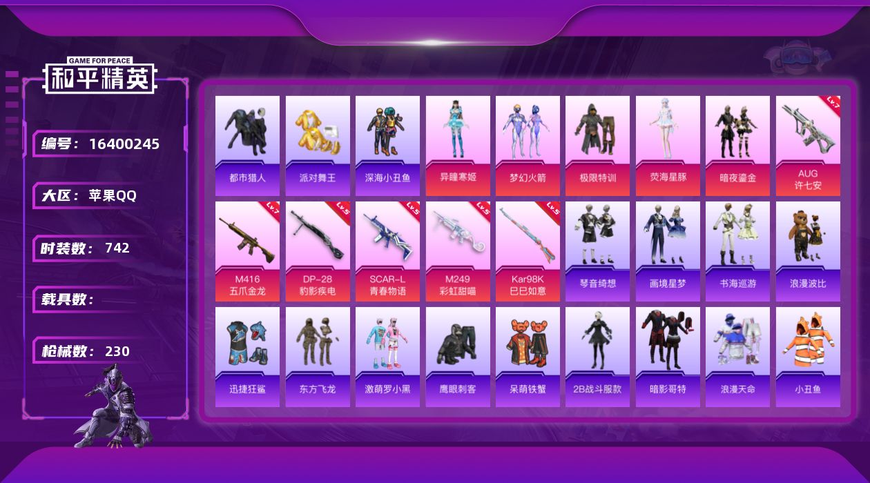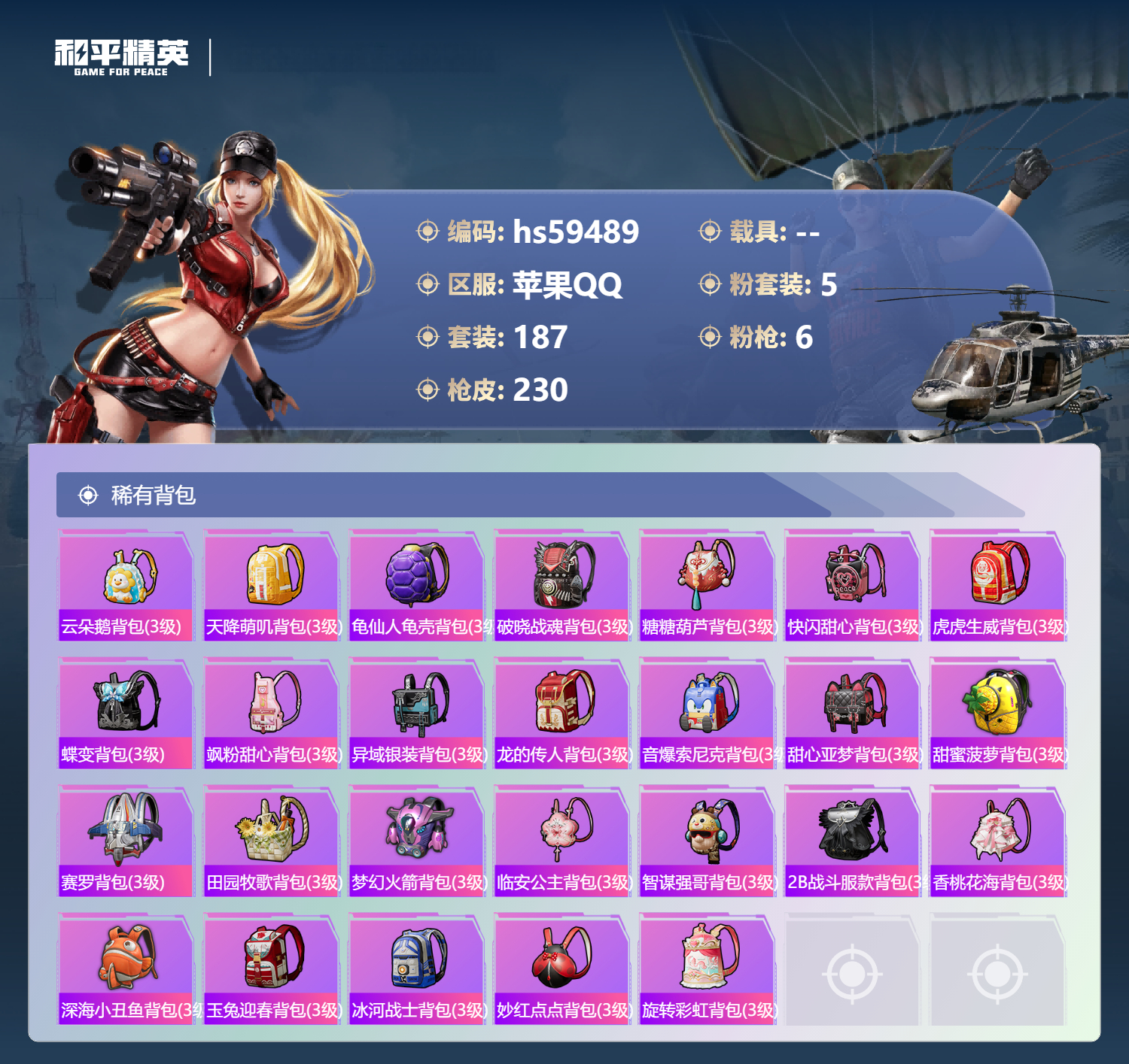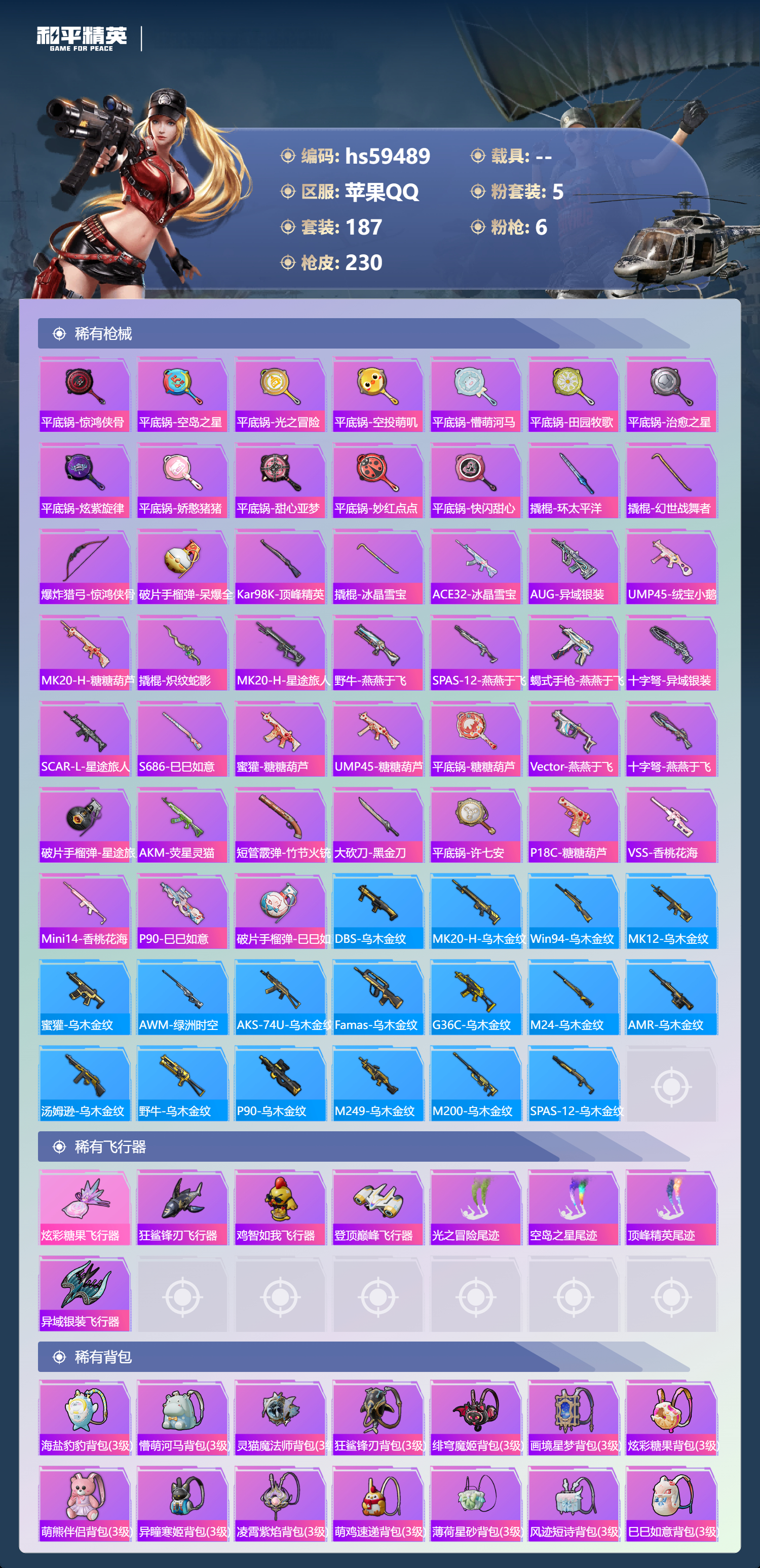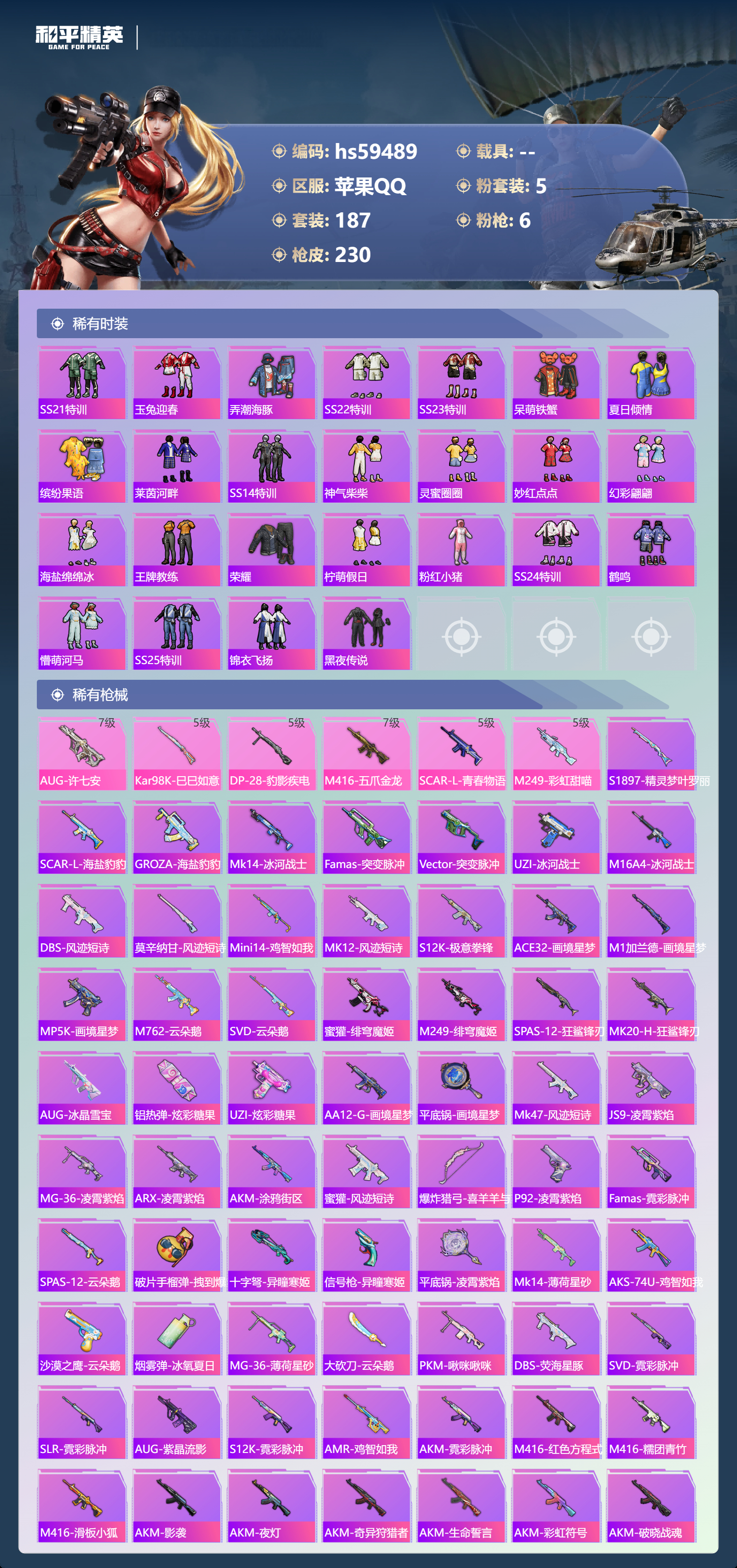 【422634】【不可二次】【苹果QQ】龟仙人 水银刺客 M416-五爪金龙 漫步者 都市猎人 迅捷狂鲨 东方飞龙 极限特训 狂沙舞者 西部牛仔 M249-彩虹甜喵 梦幻火箭 粉红小猪 深海小丑鱼 浪漫波比 派对舞王 浪漫天命 SCAR-L-青春物语 暗影哥特 激萌罗小黑 AKM-奇异狩猎者