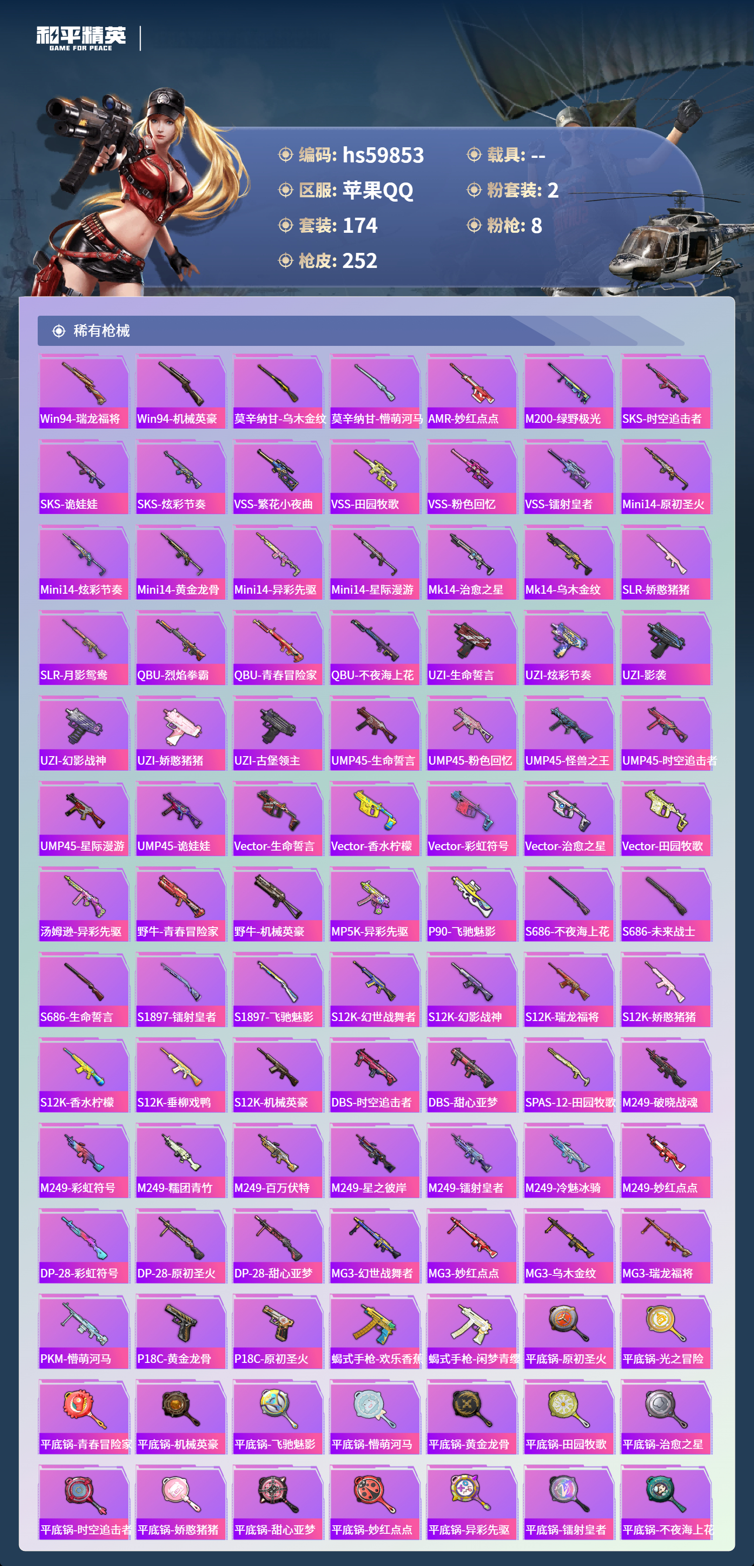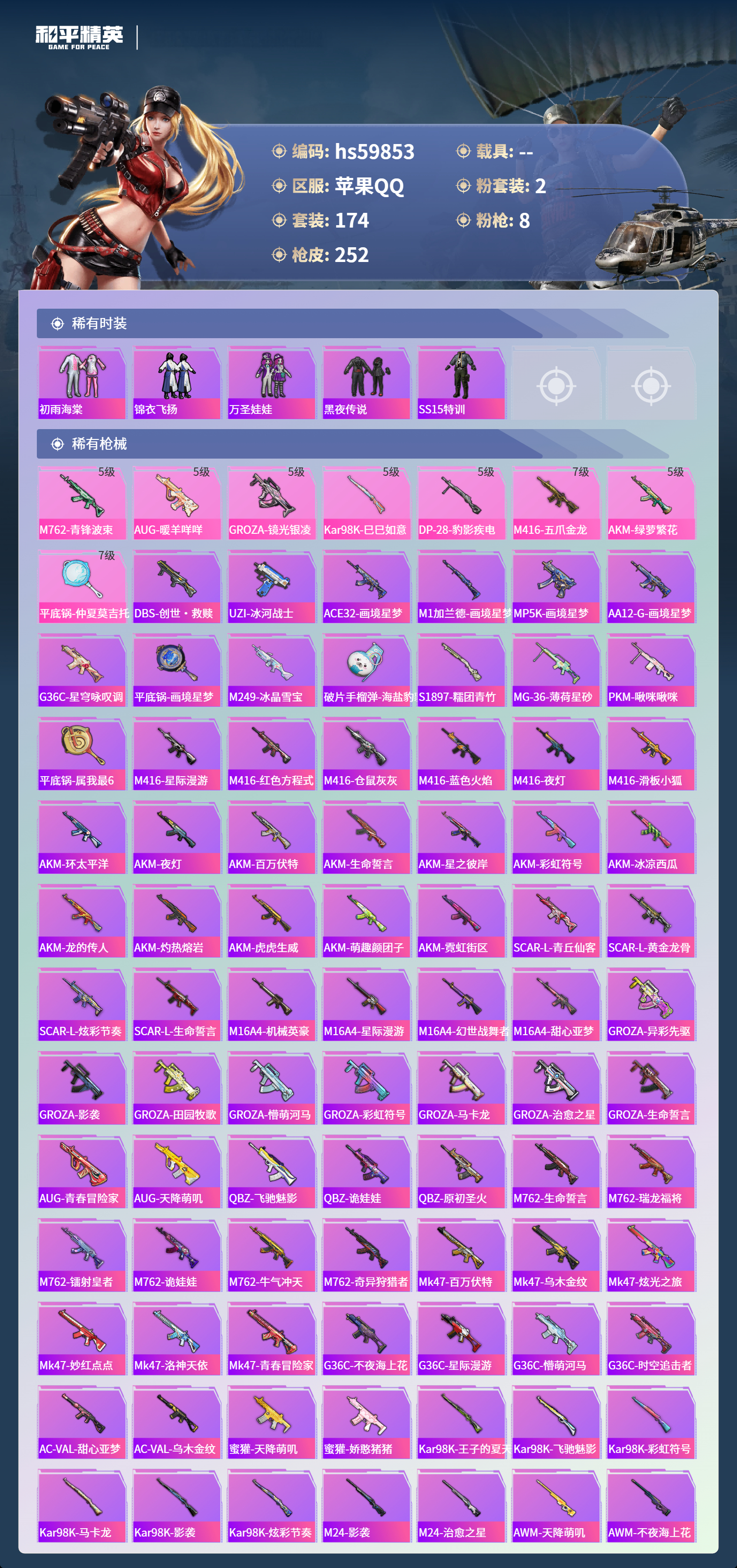 【423236】【可二次】【苹果QQ】AKM-绿萝繁花 SS1特训 M762-青锋波束 M416-五爪金龙 漫步者 M416-星际漫游 奇异狩猎者 M762-瑞龙福将 机械英豪 狂沙舞者 极速红龙 平底锅-仲夏莫吉托 金羽特工 忍者信条 葫芦兄弟 M762-奇异狩猎者 M416-仓鼠灰灰 AKM-百万伏特 瑞龙福将 风华少年志 雪山精英 团圆交子