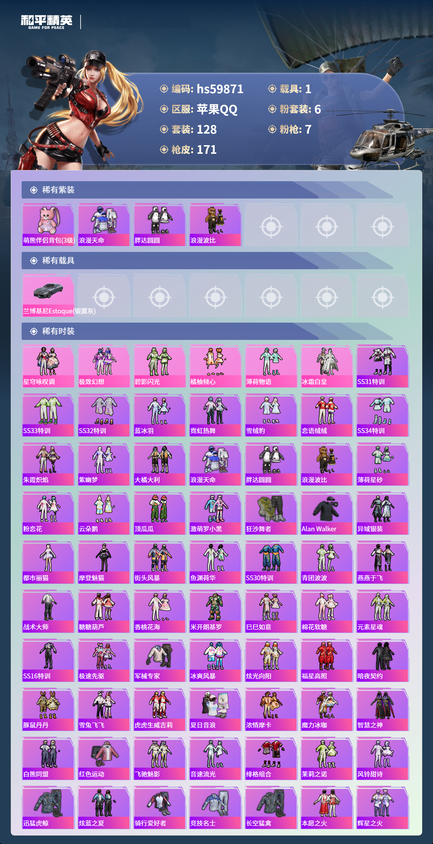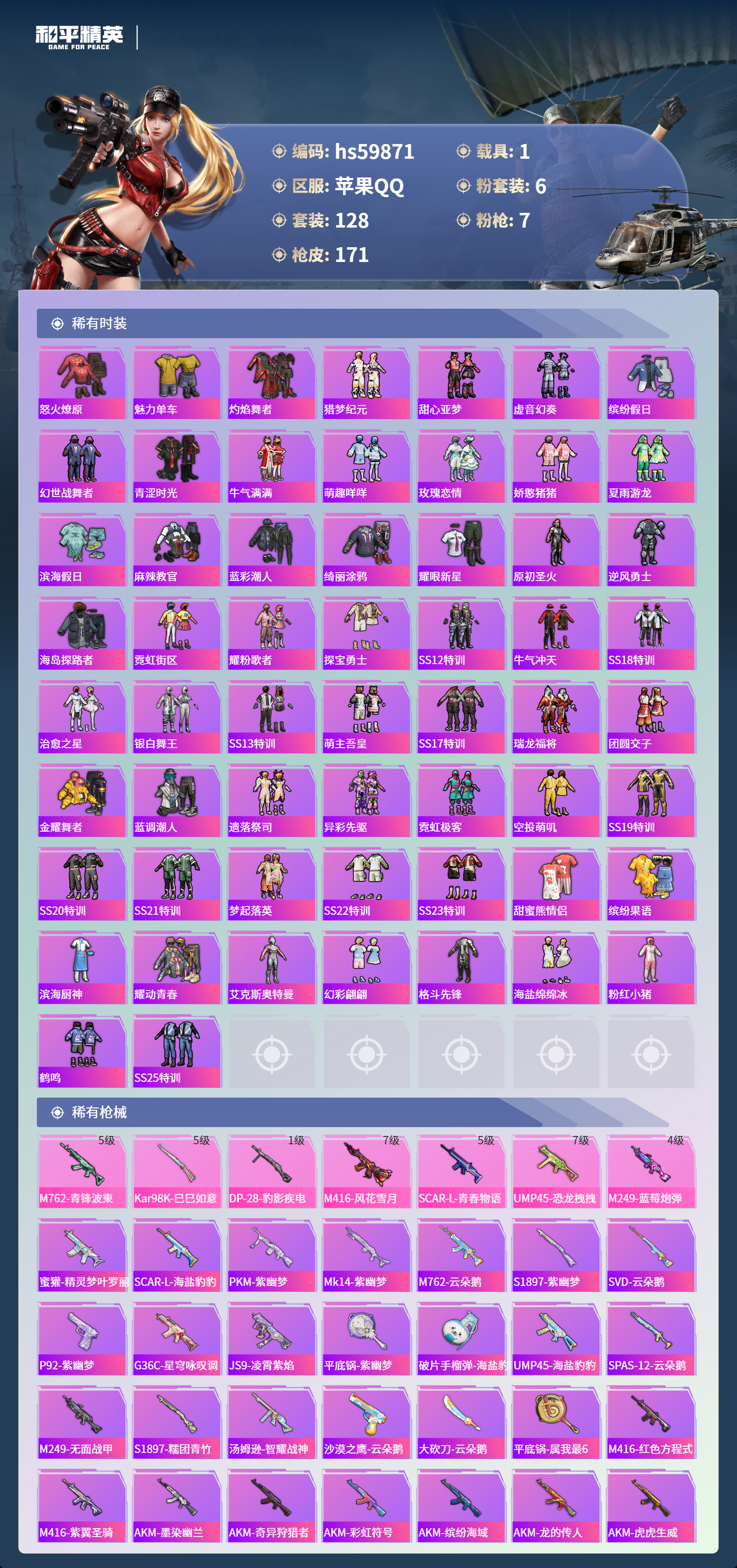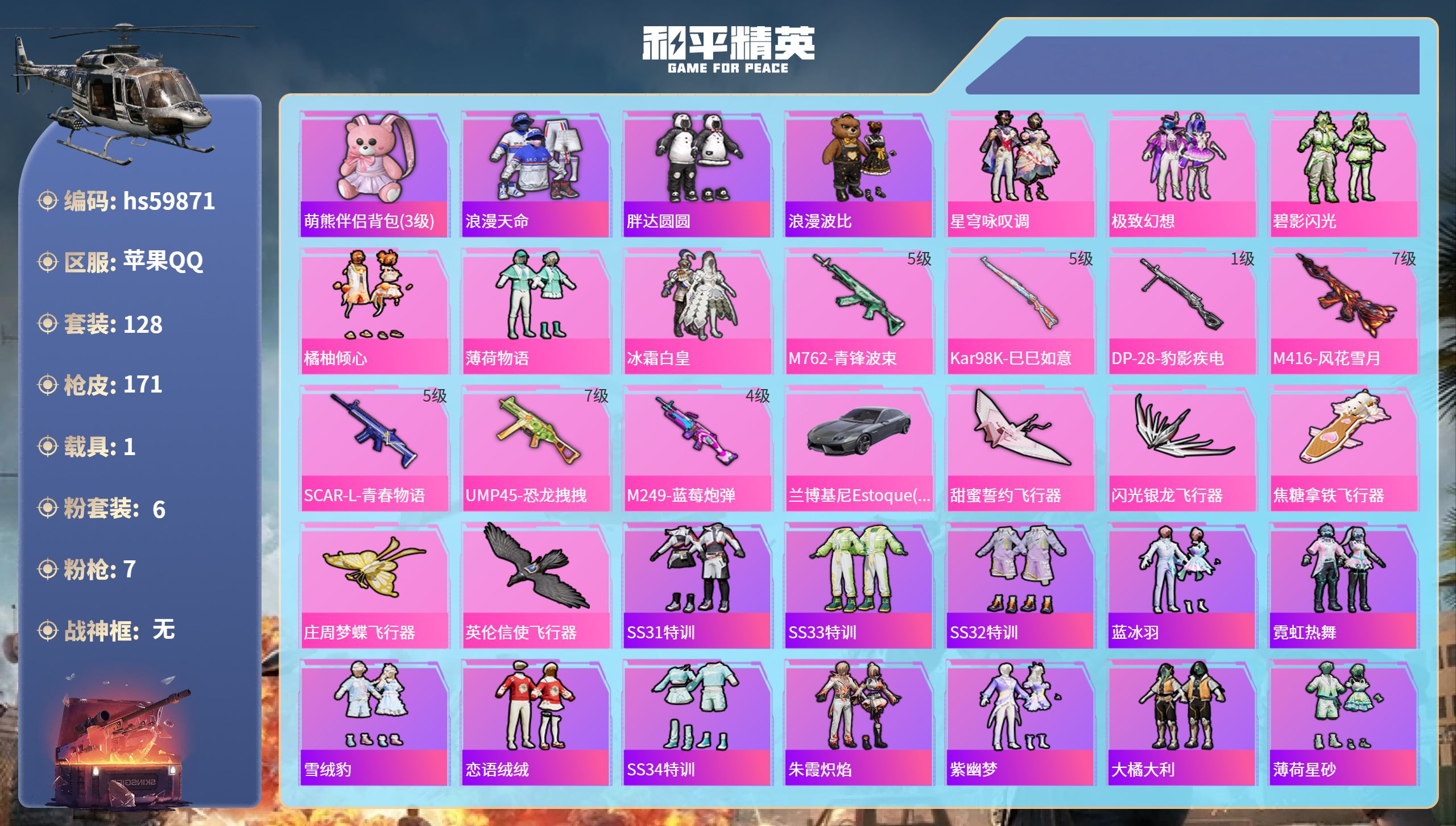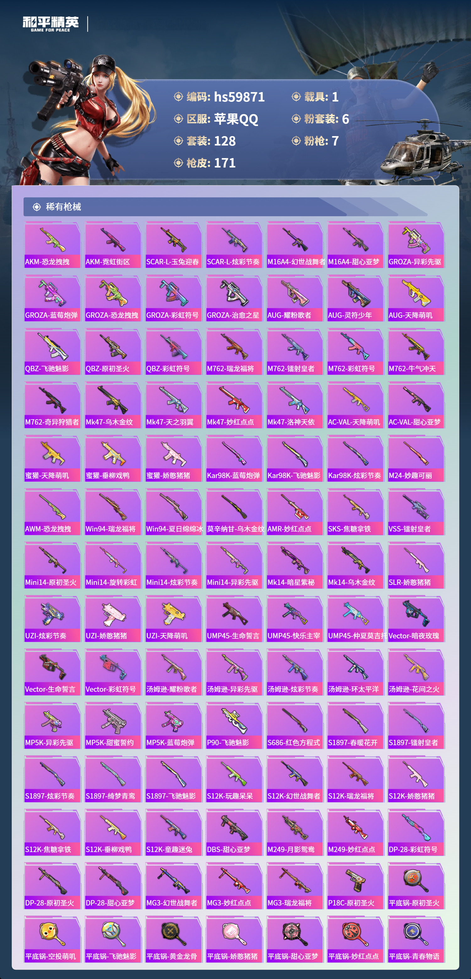 【423274】【可二次】【苹果QQ】M762-青锋波束 焦糖拿铁飞行器 UMP45-恐龙拽拽 豚鼠丹丹 甜蜜誓约飞行器 梦起落英 M762-奇异狩猎者 庄周梦蝶飞行器 浪漫波比 碧影闪光 瑞龙福将 浪漫天命 激萌罗小黑 胖达圆圆 团圆交子 AKM-奇异狩猎者 暗夜契约 M762-瑞龙福将 极致幻想 兰博轿车灰色 狂沙舞者 M416-风花雪月 AKM-缤纷海域 M249-蓝莓炮弹 粉红小猪 薄荷
