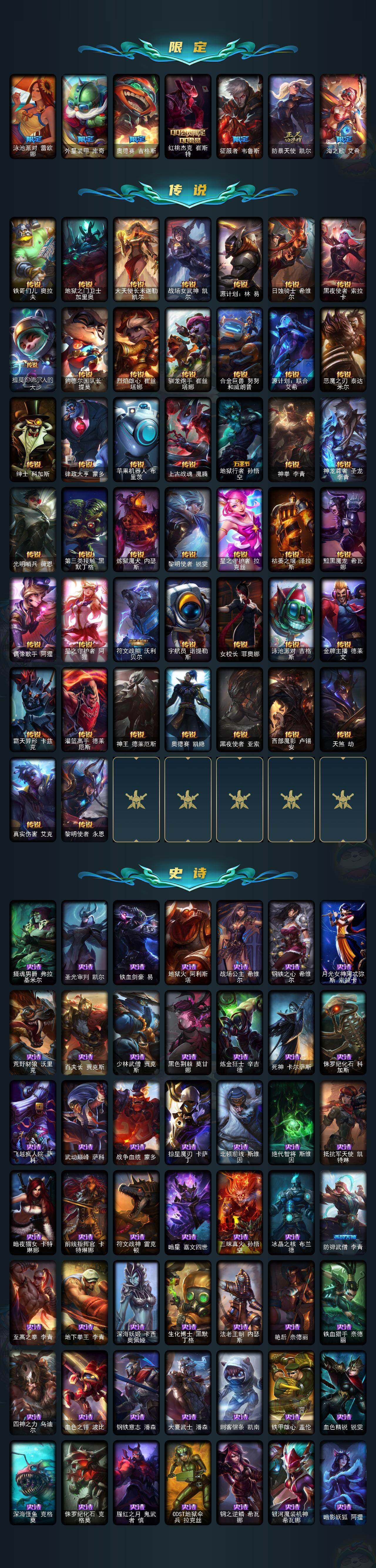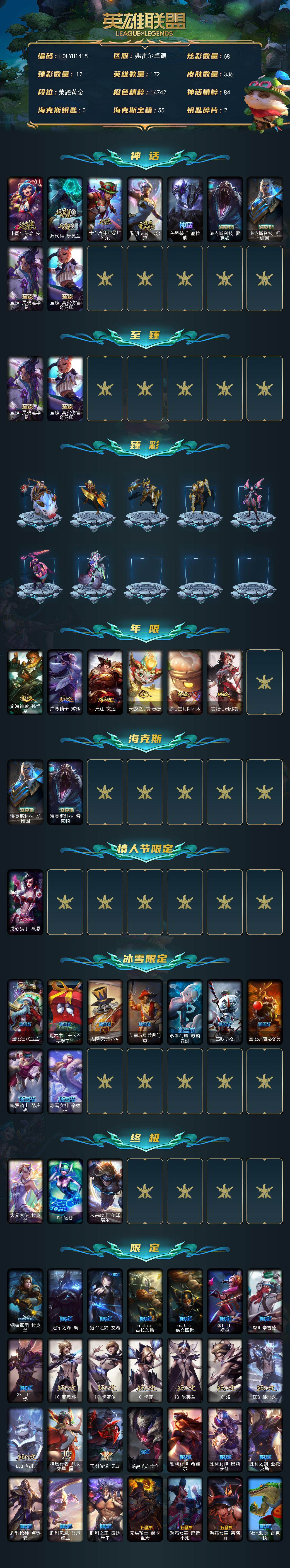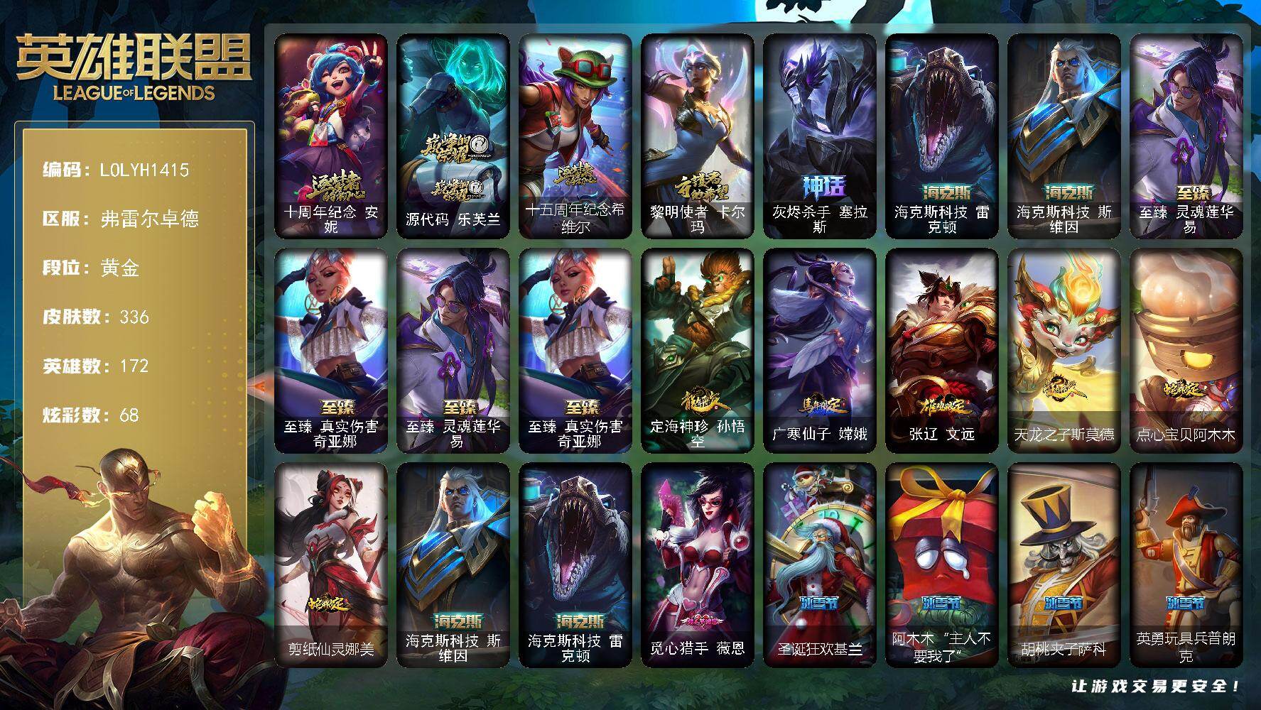 【472483】【LOLYH1415】172英雄/336皮肤/3终极/9神话/52限定/12臻彩/68炫彩/44传说/80史诗/黄金/十周年纪念安妮/源代码乐芙兰/十五周年纪念希维尔/黎明使者卡尔玛/灰烬杀手塞拉斯/海克斯科技雷克顿/海克斯科技斯维因/至臻真实伤害奇亚娜/至臻灵魂莲华易/天龙之子卡莎飞龙乘云/无畏骑士瑟庄妮赤子初心/征服者韦鲁斯炫金/冠军之血希瓦娜凯旋圣装/冠军之隐劫凯旋圣装/弹