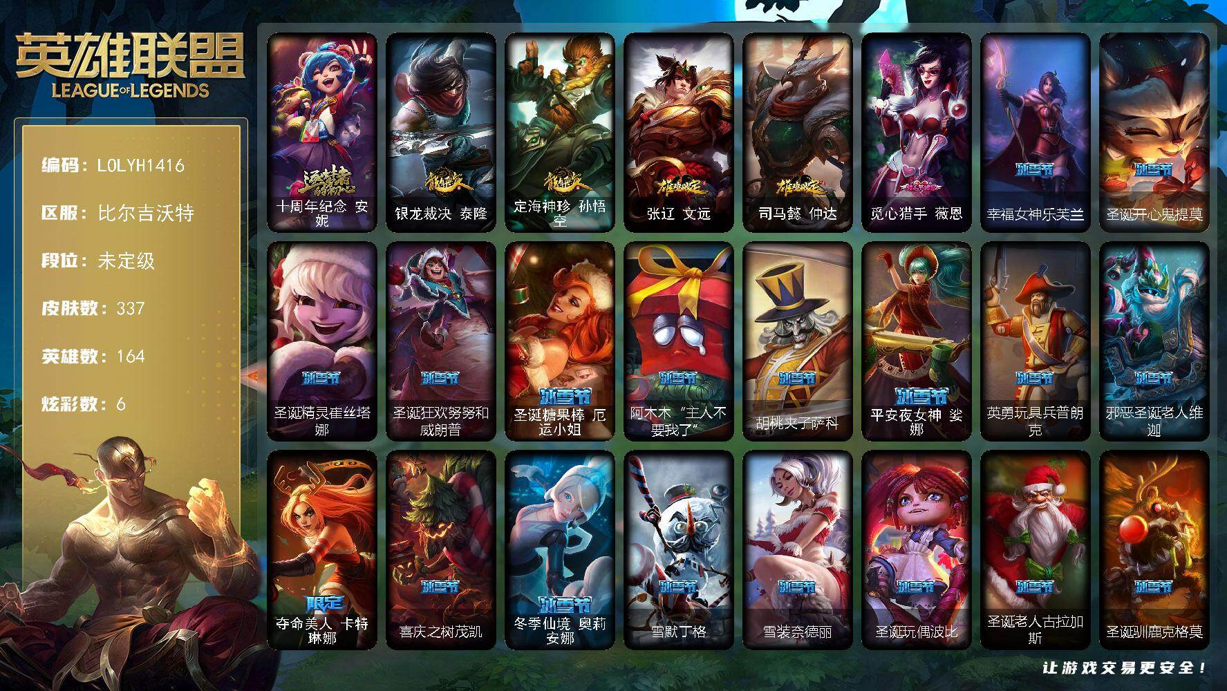 【472485】【LOLYH1416】164英雄/337皮肤/1神话/68限定/2臻彩/6炫彩/20传说/88史诗/未定级/十周年纪念安妮/冠军之刃锐雯2016凯旋圣装/星之吞噬者莫甘娜热情之末/银龙裁决泰隆/定海神针孙悟空/张辽文远/司马懿仲达/觅心猎手薇恩/幸福女神乐芙兰/圣诞开心鬼提莫/圣诞精灵崔丝塔娜/圣诞狂欢努努和威朗普/圣诞糖果棒厄运小姐/阿木木:“主人不要我了”/胡桃夹子萨科/平安
