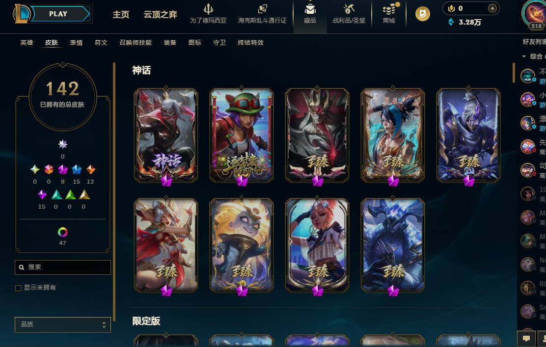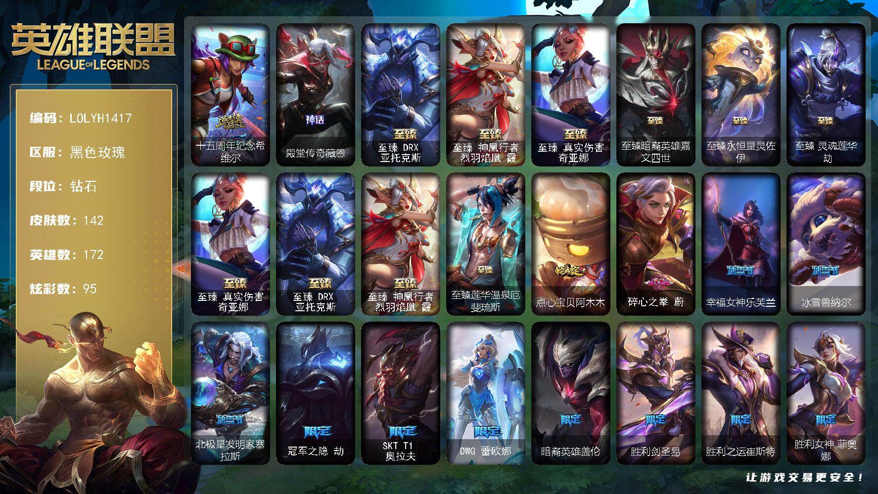 【472486】【LOLYH1417】172英雄/142皮肤/9神话/15限定/12臻彩/95炫彩/12传说/15史诗/钻石账号等级:218/十五周年纪念希维尔/殿堂传奇薇恩/至臻真实伤害奇亚娜/至臻DRX亚托克斯/至臻神凰行者烈羽焰凰霞/至臻暗裔英雄嘉文四世/至臻永恒星灵佐伊/至臻灵魂莲华劫/至臻莲华温泉厄斐琉斯/玉剑传说翼剑仙珠光/泳池派对辛德拉荔枝枝连击/幻灵战斗兔锐雯梦幻强袭/海之歌艾希