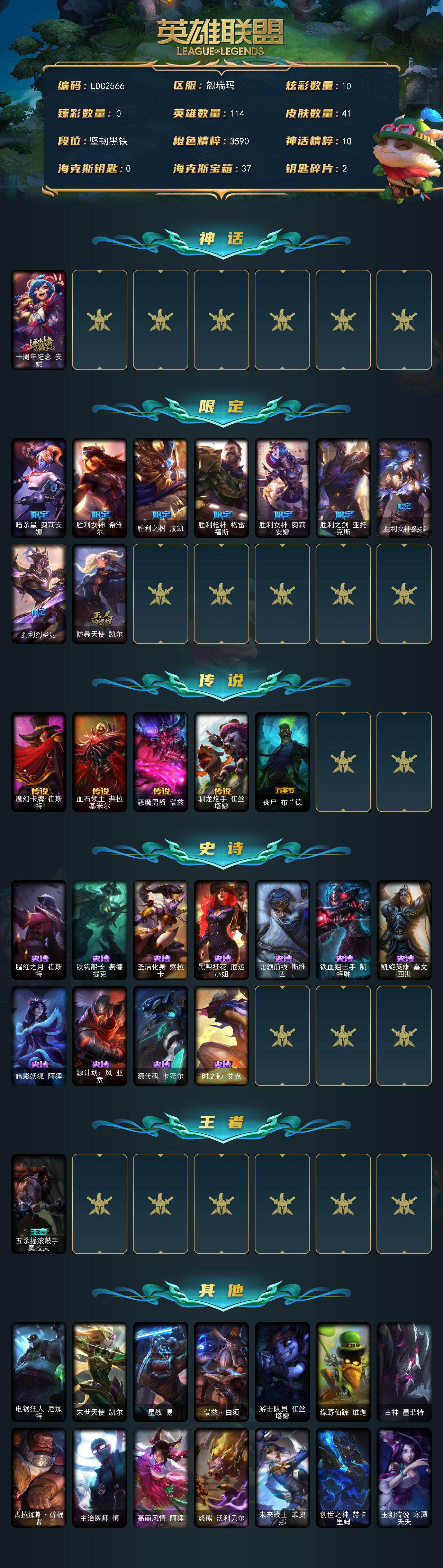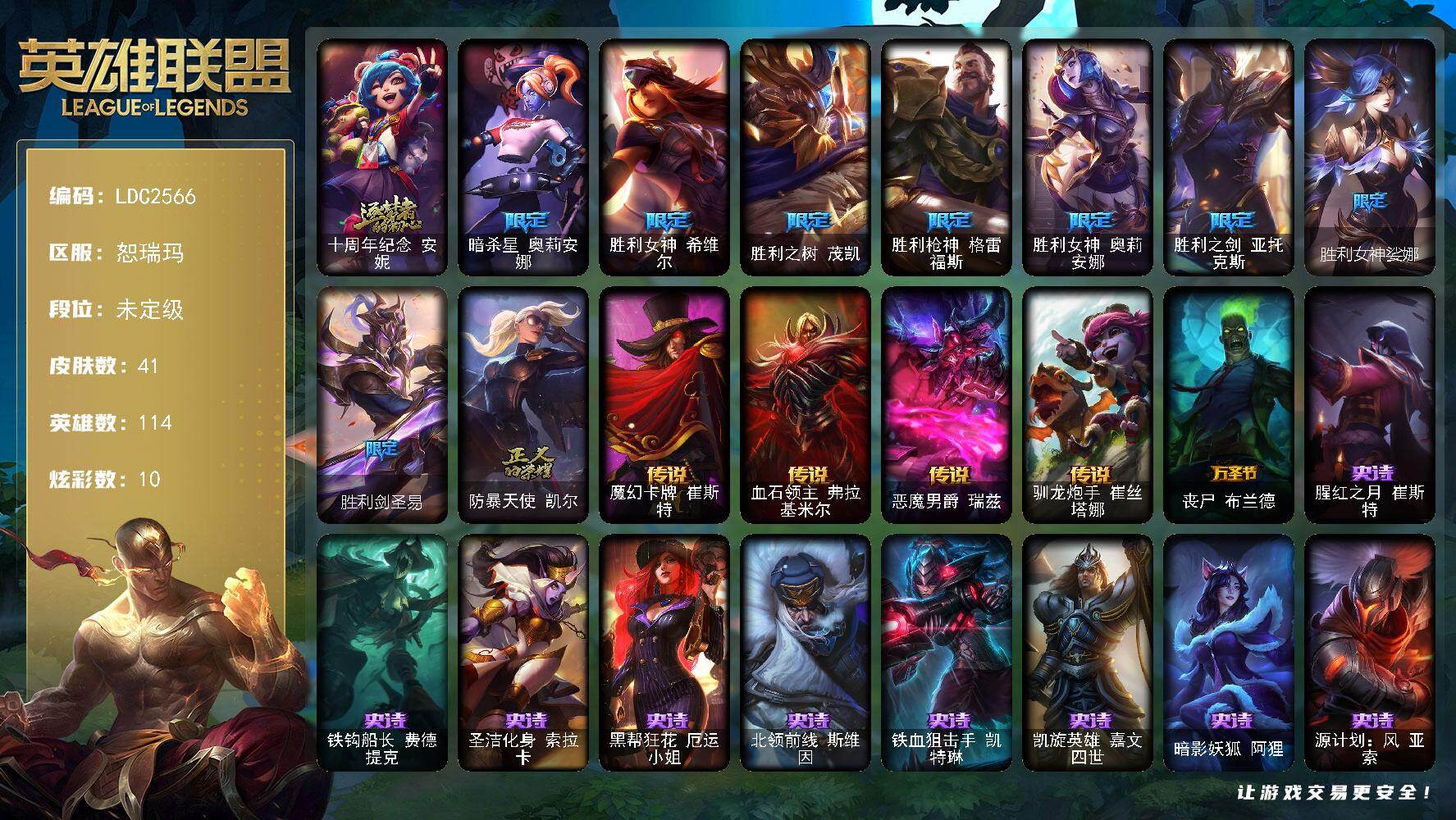 【472598】【LDC2566】114英雄/41皮肤/1神话/9限定/10炫彩/5传说/11史诗/未定级/十周年纪念安妮/暗杀星奥莉安娜/胜利女神希维尔/胜利之树茂凯/胜利枪神格雷福斯/胜利女神奥莉安娜/胜利之剑亚托克斯/胜利女神娑娜/胜利剑圣易/防暴天使凯尔/魔幻卡牌崔斯特/血石领主弗拉基米尔/恶魔男爵瑞兹/驯龙炮手崔丝塔娜/丧尸布兰德/腥红之月崔斯特/铁钩船长费德提克/圣洁化身索拉卡/黑帮