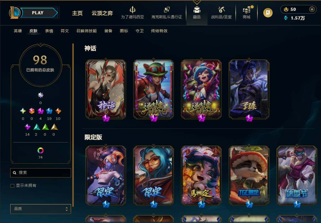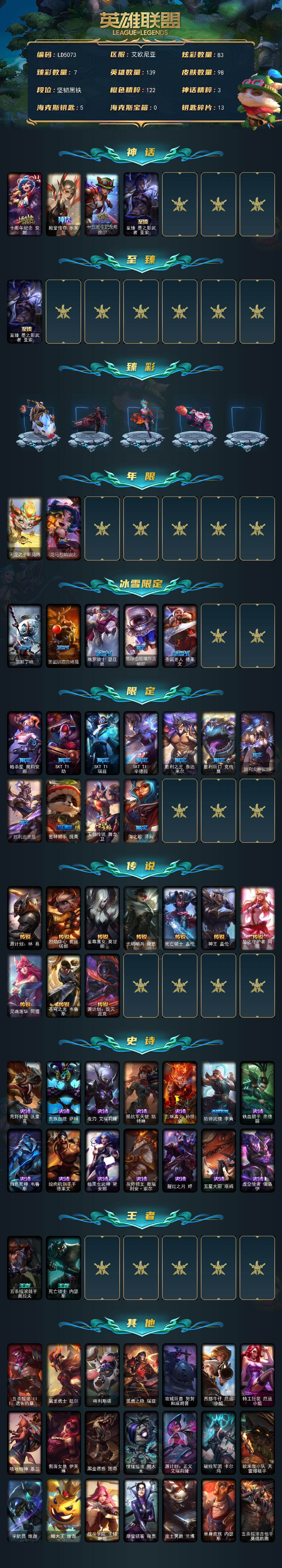 【472655】【LD5073】139英雄/98皮肤/4神话/19限定/7臻彩/83炫彩/10传说/14史诗/未定级账号等级:327/十周年纪念安妮/殿堂传奇乐芙兰/十五周年纪念希维尔/至臻墨之影武者亚索/无畏骑士瑟庄妮赤子初心/西部天使赛娜贝利尔之怠/灵魂莲华锐雯流火/可爱可爱粉红红布里茨/殿堂传奇乐芙兰登神/春晖神女艾希玉露金风/这货不是银狐库奇/天龙之子斯莫德/龙马烈焰波比/雪默丁格/圣诞