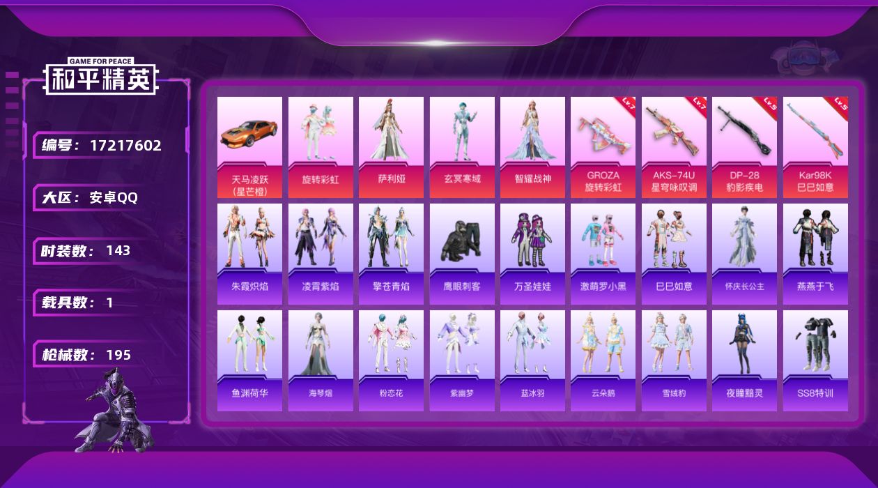 【498311】[17217602]【as35】安卓 手Q-4粉装-4特效枪-1载具-2粉色飞行器-58352热力值-8王牌印记-143套装-195枪皮【粉色套装】:粉装-旋转彩虹,角色-萨利娅,角色-玄冥寒域,角色-智耀战神【粉色枪皮等级】:GROZA-旋转彩虹(七级),AKS-74U-星穹咏叹调(七级),Kar98K-巳巳如意(五级),DP-28-豹影疾电(五级)【粉色载具】:天马凌跃(星芒
