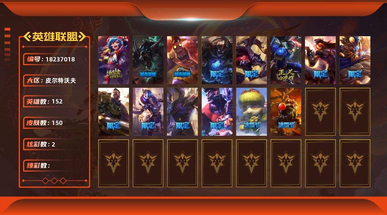 【636610】[18237018]未定级段位-152英雄-150皮肤-2炫彩-0终极-1神话-15限定-20传说-45史诗【神话皮肤】:十周年纪念安妮【冰雪限定】:圣诞开心鬼提莫,圣诞驯鹿克格莫【限定皮肤】:暗杀星蒙多,胜利女神希维尔,胜利之树茂凯,胜利枪神格雷福斯,胜利女神奥莉安娜,胜利之剑亚托克斯,鬼影森森茂凯,机械迷城加里奥,蒙多蒙多,暗影沃里克,勇者阿狸,都铎王朝图奇,防暴天使凯尔【传