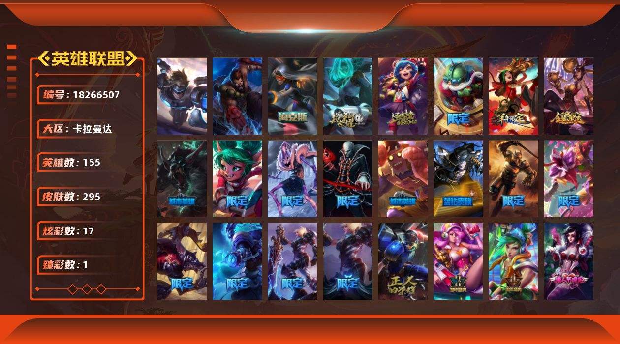 【640417】[18266507]未定级段位-155英雄-295皮肤-17炫彩-2终极-3神话-65限定-33传说-70史诗【珍稀头像】:女巫头头像【热门头像】:卡特琳娜的匕首头像【神话皮肤】:十周年纪念安妮,源代码乐芙兰【海克斯皮肤】:新创战纪希维尔【臻彩皮肤】:红莲之刃锐雯【年限皮肤】:神龙烈焰金克丝,烈焰美人薇恩【情人节限定】:觅心猎手薇恩【冰雪限定】:幸福女神乐芙兰,冰雪风暴希维尔,圣