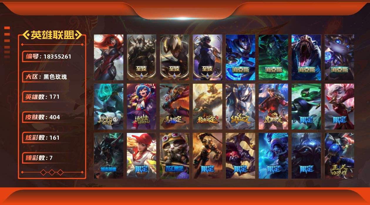 【651739】[18355261]未定级段位-171英雄-404皮肤-161炫彩-1终极-10神话-59限定-41传说-88史诗【热门头像】:爱情之歌头像【神话皮肤】:十周年纪念安妮,源代码乐芙兰,神凰行者瑞羽圣凰艾尼维亚【至臻皮肤】:至臻黑夜使者李青,至臻真实伤害赛娜,至臻腥红之月亚托克斯【海克斯皮肤】:海克斯科技雷克顿,海克斯科技嘉文四世,摄魂使者薇恩,海克斯科技波比【臻彩皮肤】:天龙之子