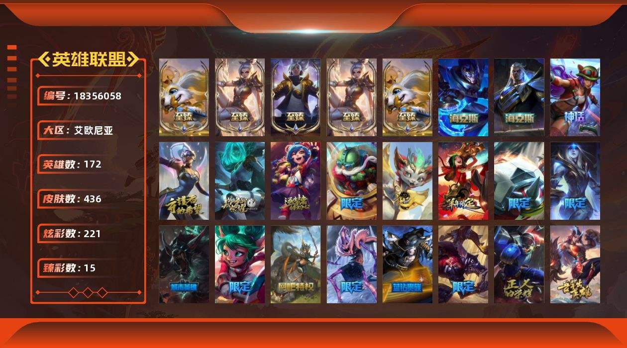 【651941】[18356058]未定级段位-172英雄-436皮肤-221炫彩-0终极-12神话-49限定-43传说-89史诗【珍稀头像】:星守阿狸头像【热门头像】:爱情之歌头像【神话皮肤】:十周年纪念安妮,源代码乐芙兰,十五周年纪念希维尔,神凰行者瑞羽圣凰艾尼维亚,黎明使者卡尔玛【至臻皮肤】:至臻玉剑传说武剑仙锐雯,至臻玉剑传说武剑仙(2022),至臻绒毛菲兹,至臻绒毛菲兹(2022),至