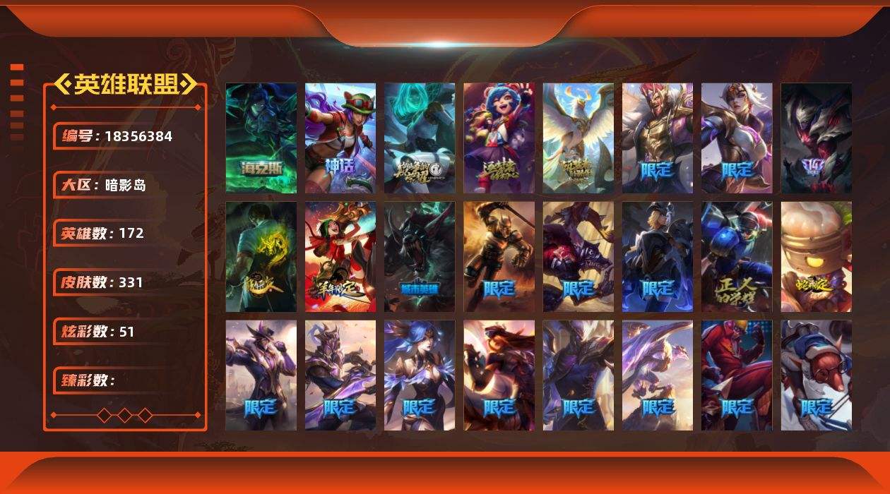 【652026】[18356384]5神话 25限定 28传说 84史诗 331皮肤 51炫彩 172英雄 可二次 可修改实名 【海克斯】摄魂 薇恩【赛季限定皮】胜利行刑官 德莱文,胜利凤凰 艾尼维亚,胜利女神-菲奥娜,胜利之运 崔斯特,胜利剑圣 易,胜利女神 娑娜,胜利女神 希维尔,胜利之剑 亚托克斯【冠军限定系列】S13 T1 李青,S3 SKT T1 李青,S4 SSW 图奇【冰雪节限定】