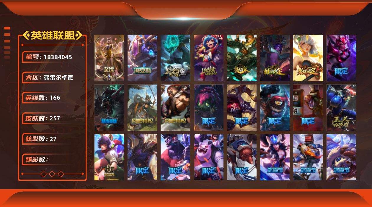 【655403】[18384045]4神话 27限定 24传说 63史诗 257皮肤 27炫彩 166英雄 可二次 可修改实名 【至臻】至臻 K/DA 阿狸【海克斯】海克斯 克格莫【赛季限定皮】胜利之剑 亚托克斯【冠军限定系列】S2 暗杀星 蒙多,S2 暗杀星 努努,S4 SSW 图奇【冰雪节限定】冰雪风暴 希维尔,冰雪节 辛吉德,冰雪兽 纳尔,胡桃夹子 萨科,平安夜女神 娑娜【泳池派对】泳池派