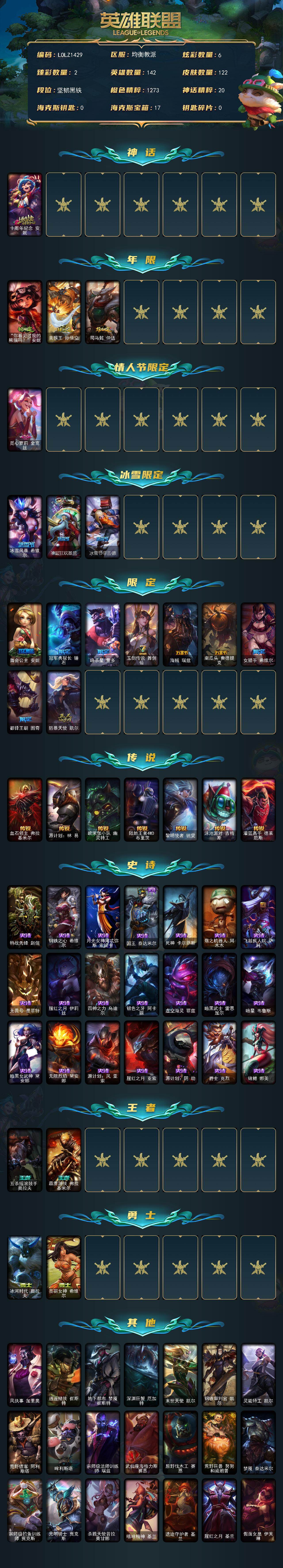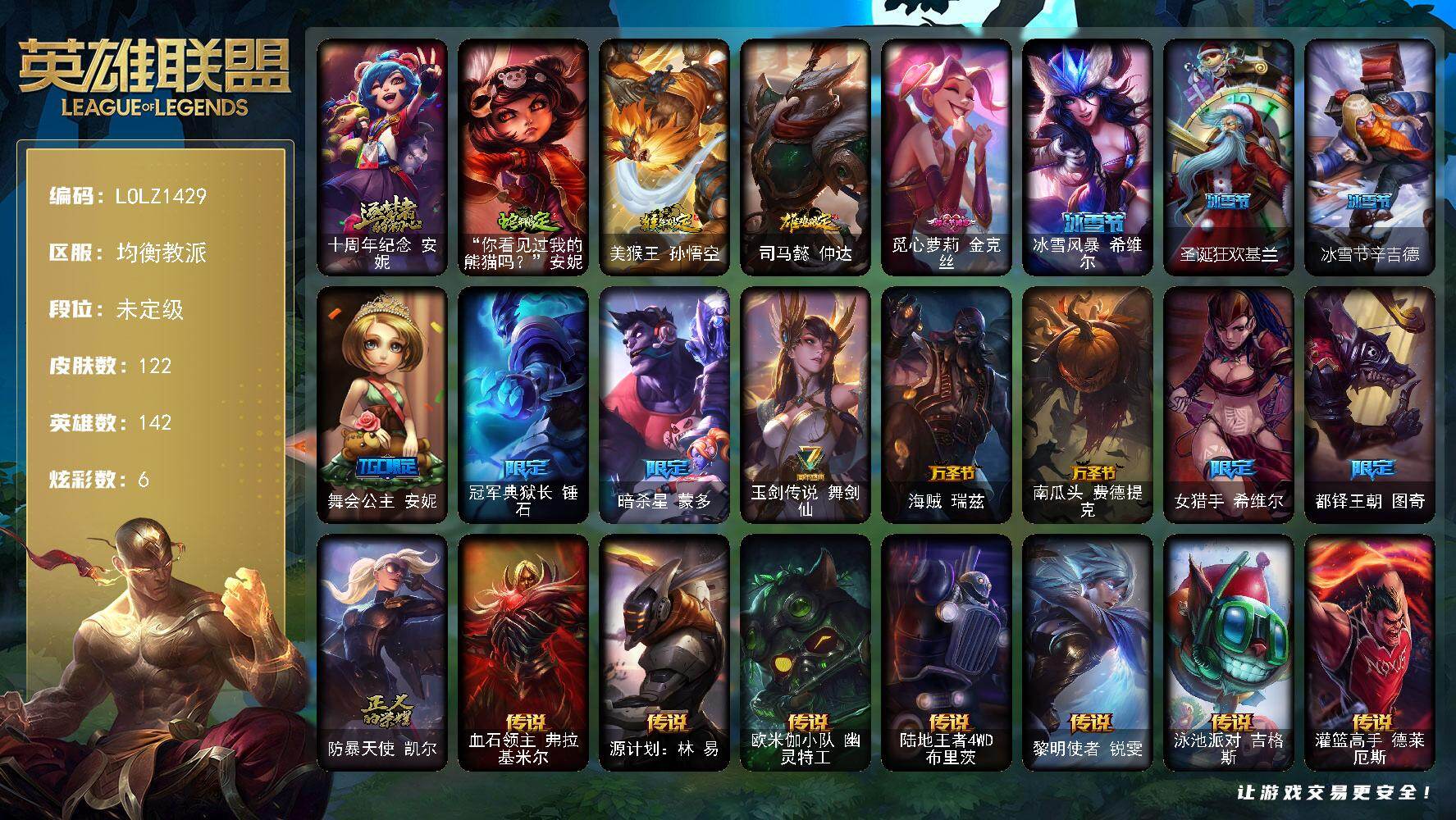 【655766】【LOLZ1429】142英雄/122皮肤/1神话/16限定/2臻彩/6炫彩/7传说/21史诗/未定级账号等级:124/十周年纪念安妮/星之守护者娑娜未来之光/魔女阿卡丽虚荣/“你看见过我的熊猫吗?”安妮/美猴王孙悟空/司马懿仲达/觅心萝莉金克丝/冰雪风暴希维尔/圣诞狂欢基兰/冰雪节辛吉德/舞会公主安妮/冠军典狱长锤石/暗杀星蒙多/玉剑传说舞剑仙/海贼瑞兹/南瓜头费德提克/女猎手
