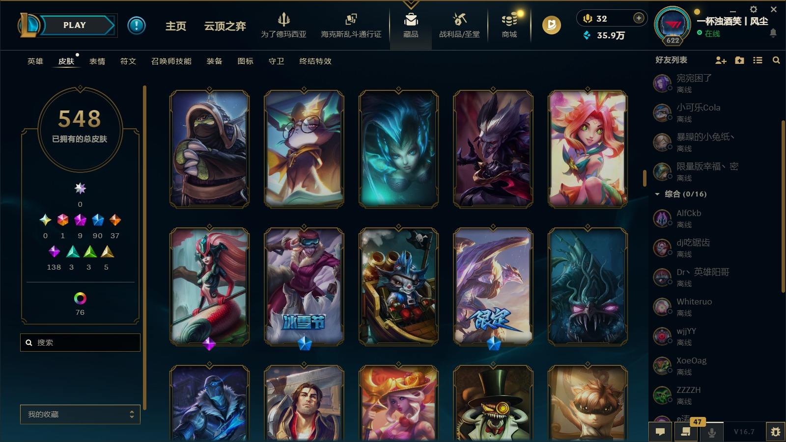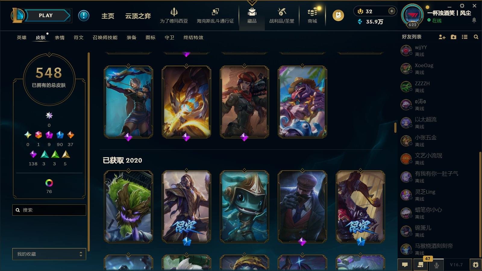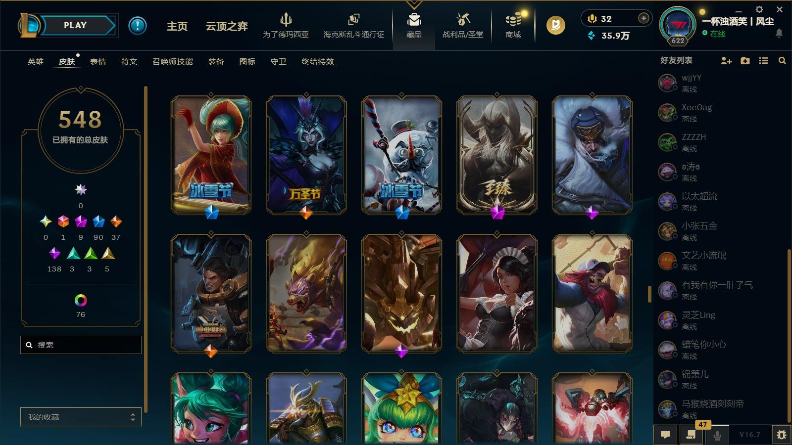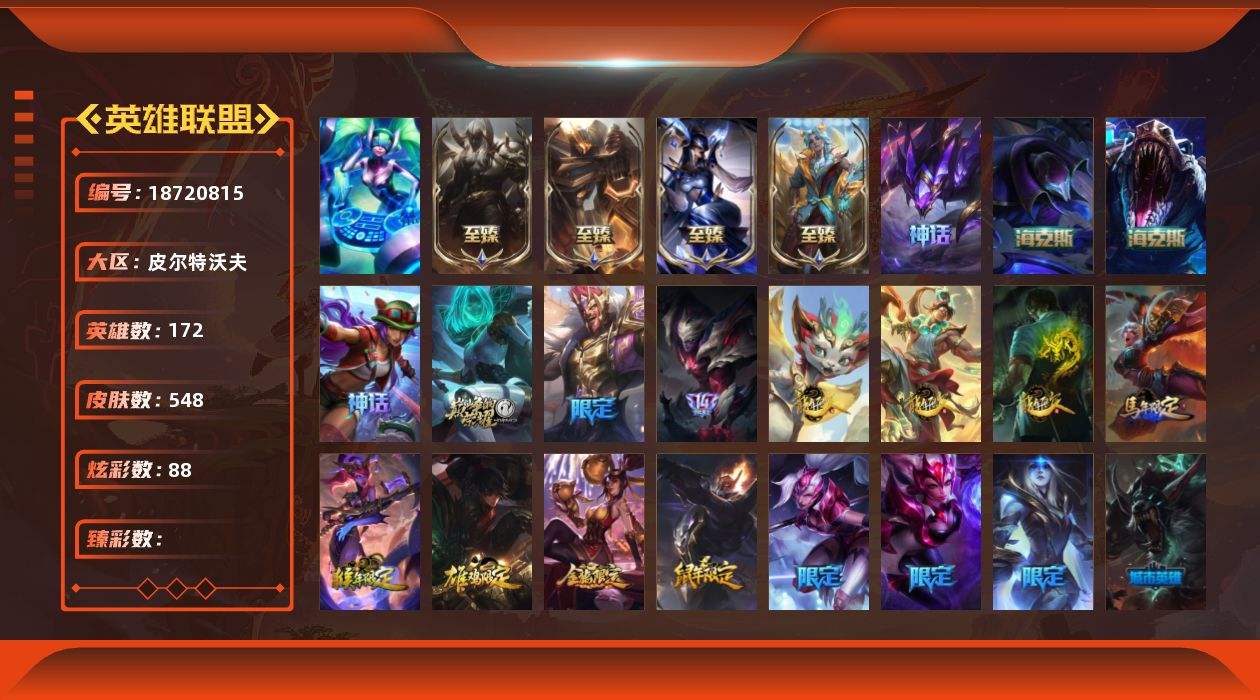 【676384】[18720815]1终极 9神话 91限定 39传说 138史诗 548皮肤 88炫彩 172英雄 可二次 可修改实名 【至臻】至臻 天龙之子 伊泽瑞尔,至臻 腥红之月 亚托克斯,至臻 王国机神玄武 盖伦,至臻 青花瓷 丽桑卓,水晶掠夺者 卡兹克【海克斯】海克斯 魔腾,海克斯 雷克顿【限定】玉剑传说 舞龙卫,战熊骑士 瑟庄妮,钢铁军团 拉克丝,创星之灵 璐璐【情人节限定】觅心猎