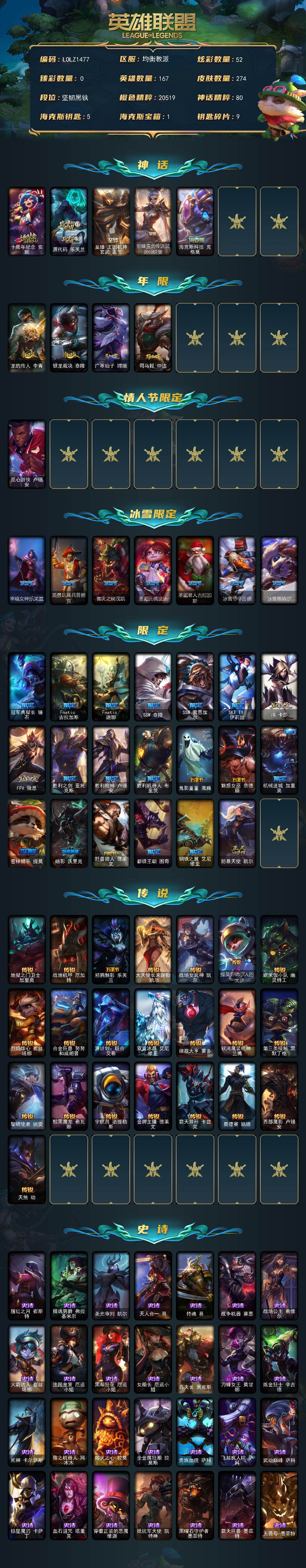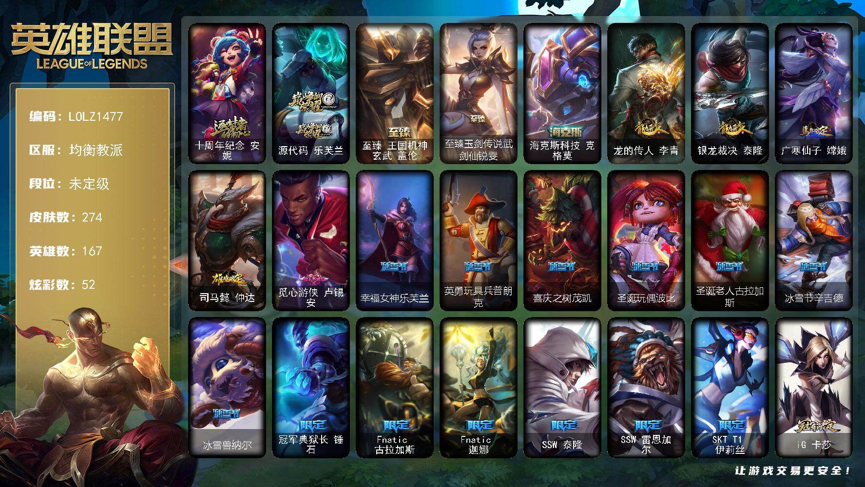 【677355】【LOLZ1477】167英雄/274皮肤/5神话/32限定/52炫彩/22传说/78史诗/未定级/十周年纪念安妮/源代码乐芙兰/至臻王者机甲玄武盖伦/至臻玉剑传说武剑仙/海克斯科技克格莫/龙的传人李青/银龙裁决泰隆/广寒仙子嫦娥/司马懿仲达/觅心游侠卢锡安/幸福女神乐芙兰/英勇玩具兵普朗克/喜庆之树茂凯/圣诞玩偶波比/圣诞老人古拉加斯/冰雪节辛吉德/冰雪兽纳尔/冠军典狱长锤石/