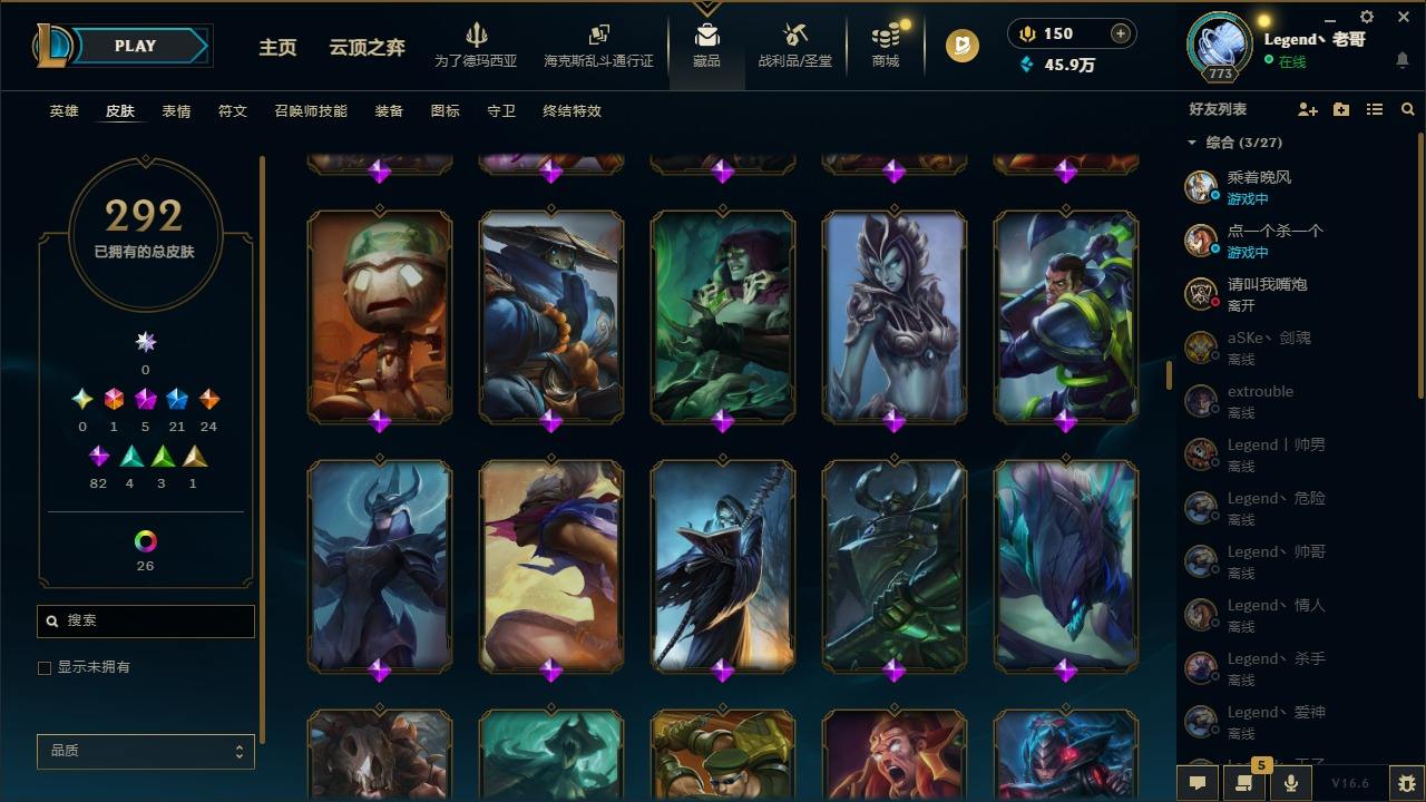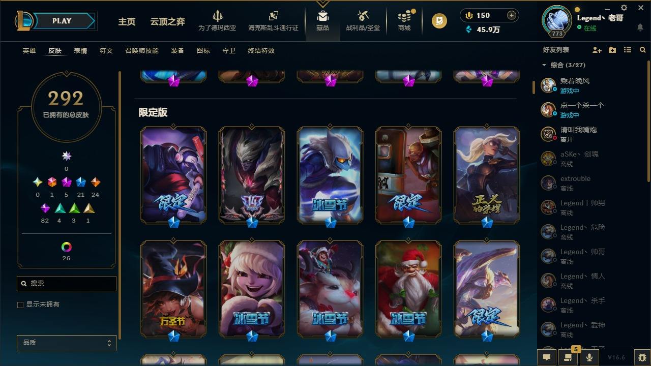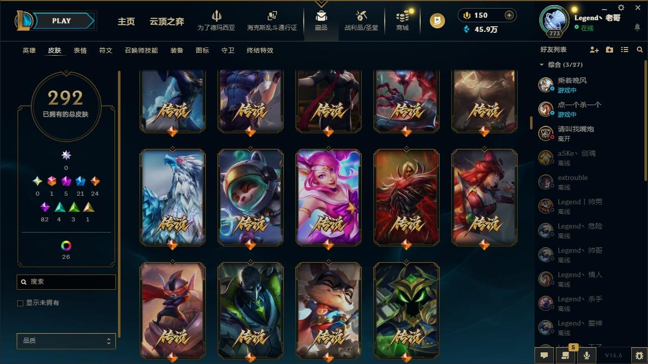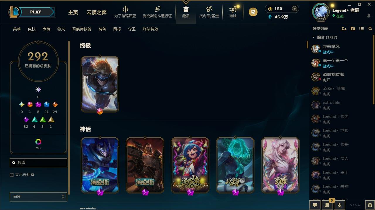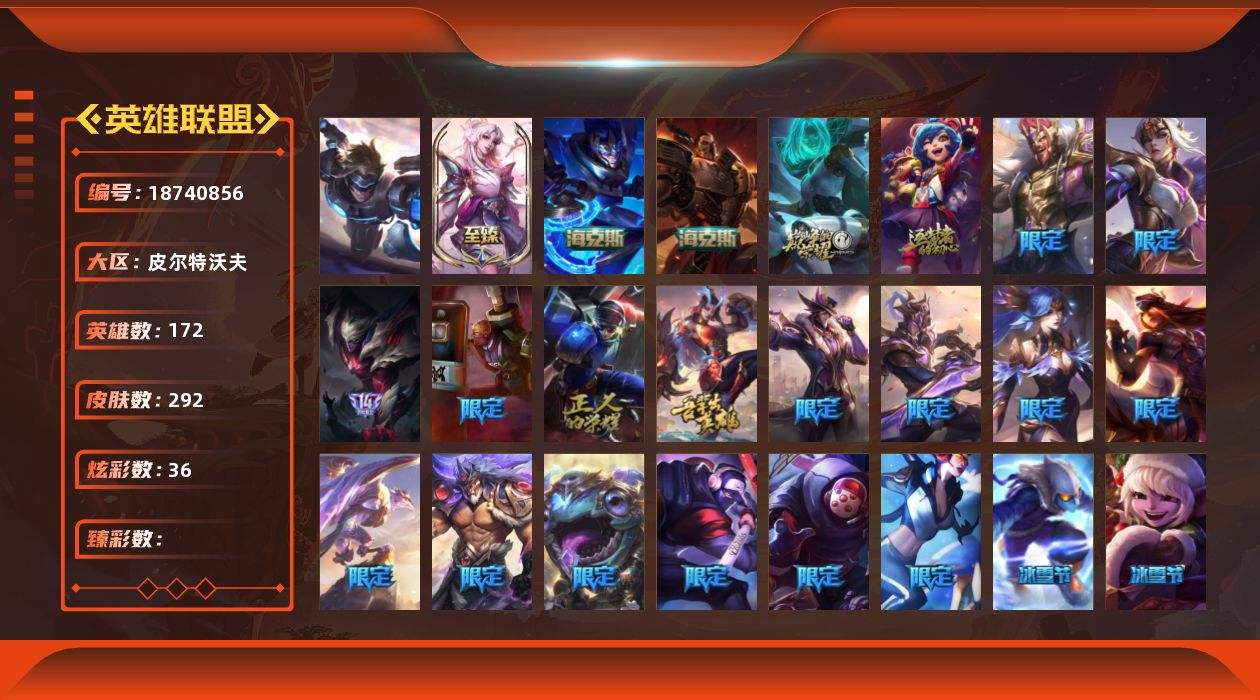 【679345】[18740856]1终极 5神话 22限定 24传说 84史诗 292皮肤 36炫彩 172英雄 可二次 可修改实名 【至臻】至臻 灵魂莲华 拉克丝【海克斯】海克斯 嘉文四世,恐惧新星 德莱厄斯【限定】玉剑传说 舞龙卫【赛季限定皮】胜利行刑官 德莱文,胜利凤凰 艾尼维亚,胜利女神-菲奥娜,胜利之运 崔斯特,胜利剑圣 易,胜利女神 娑娜,胜利巨口 克格莫,胜利之王 泰达米尔,胜利