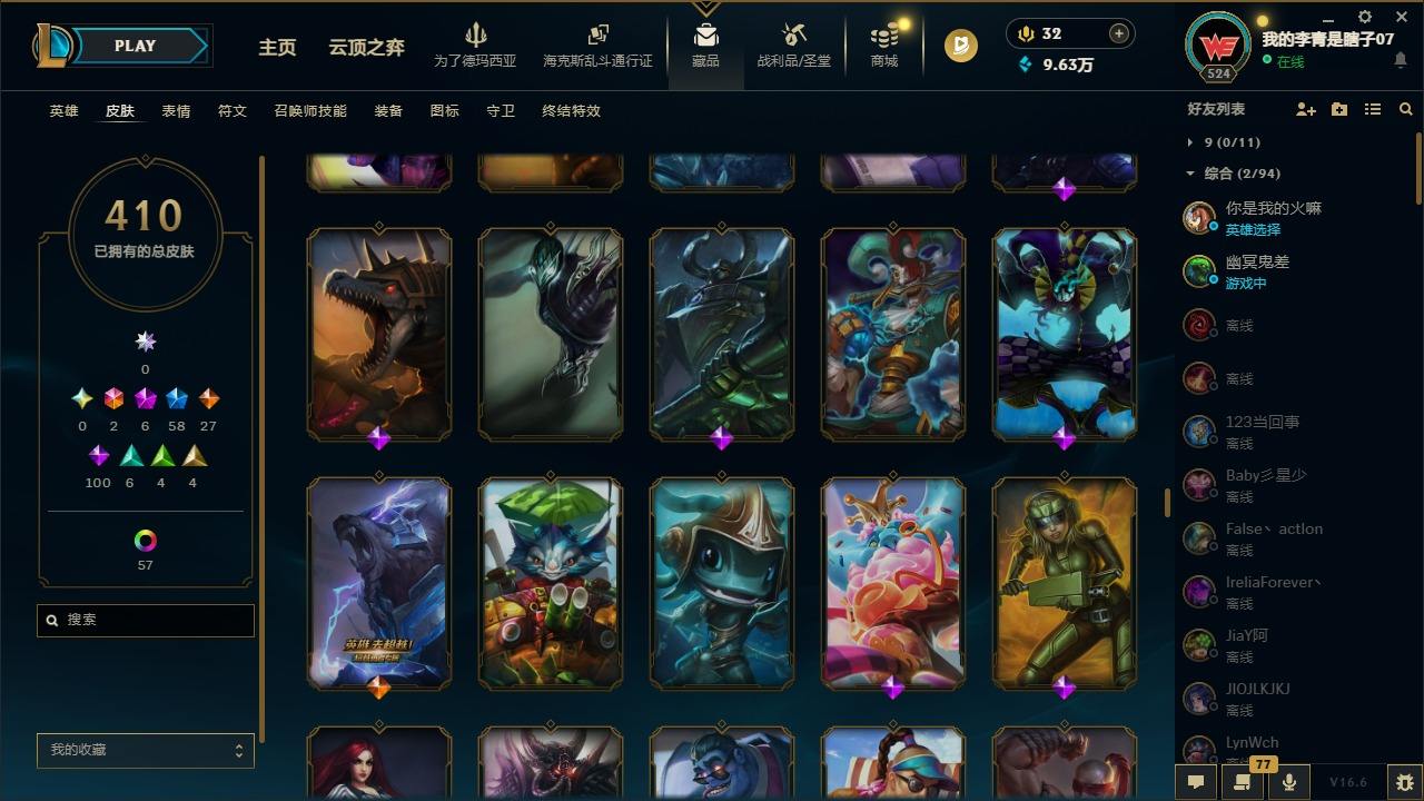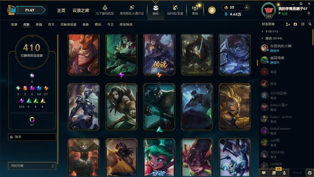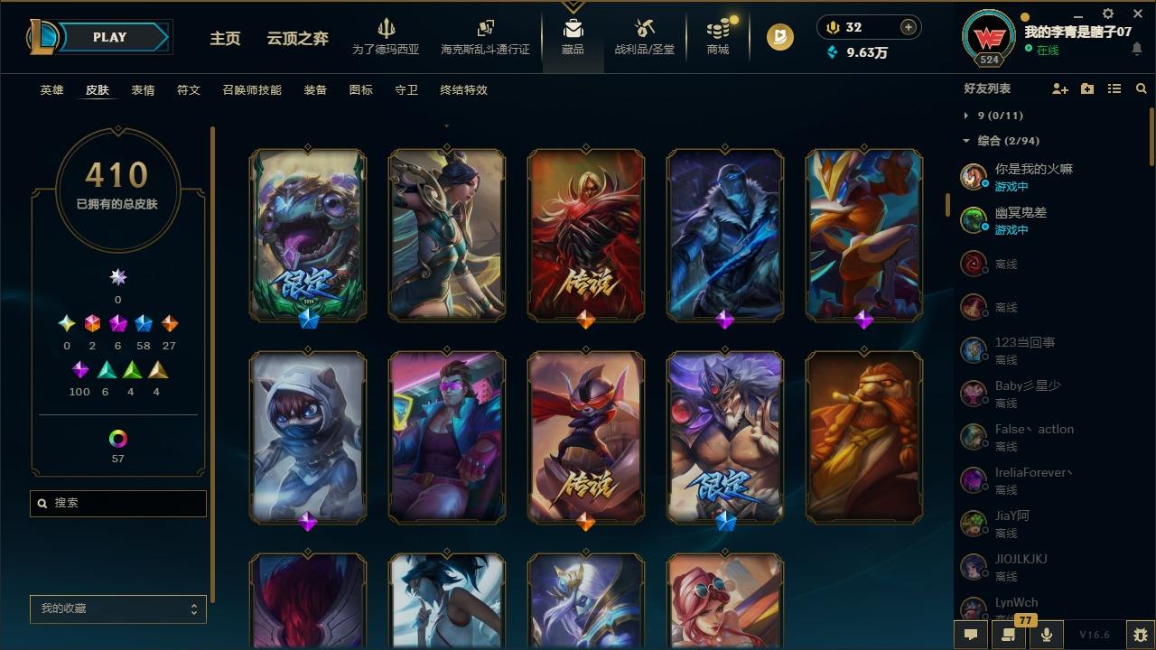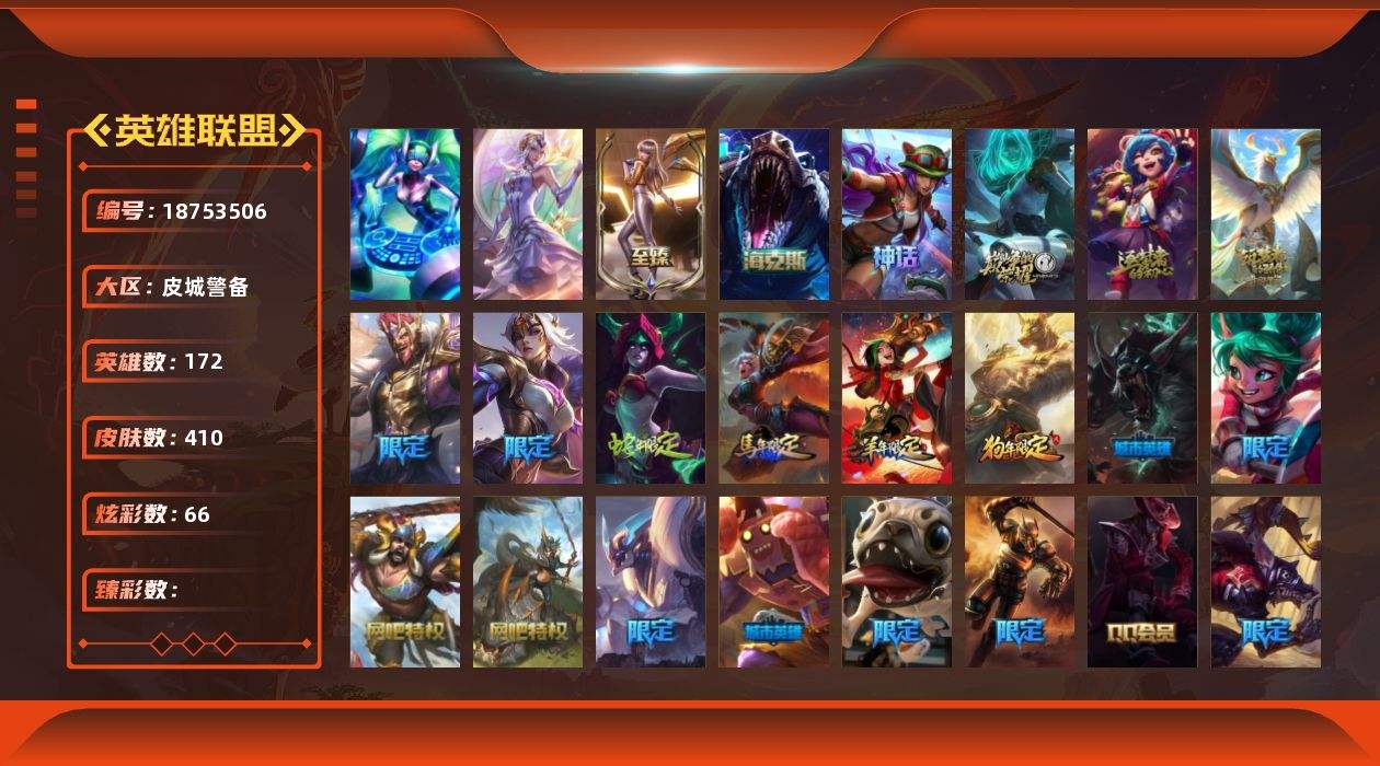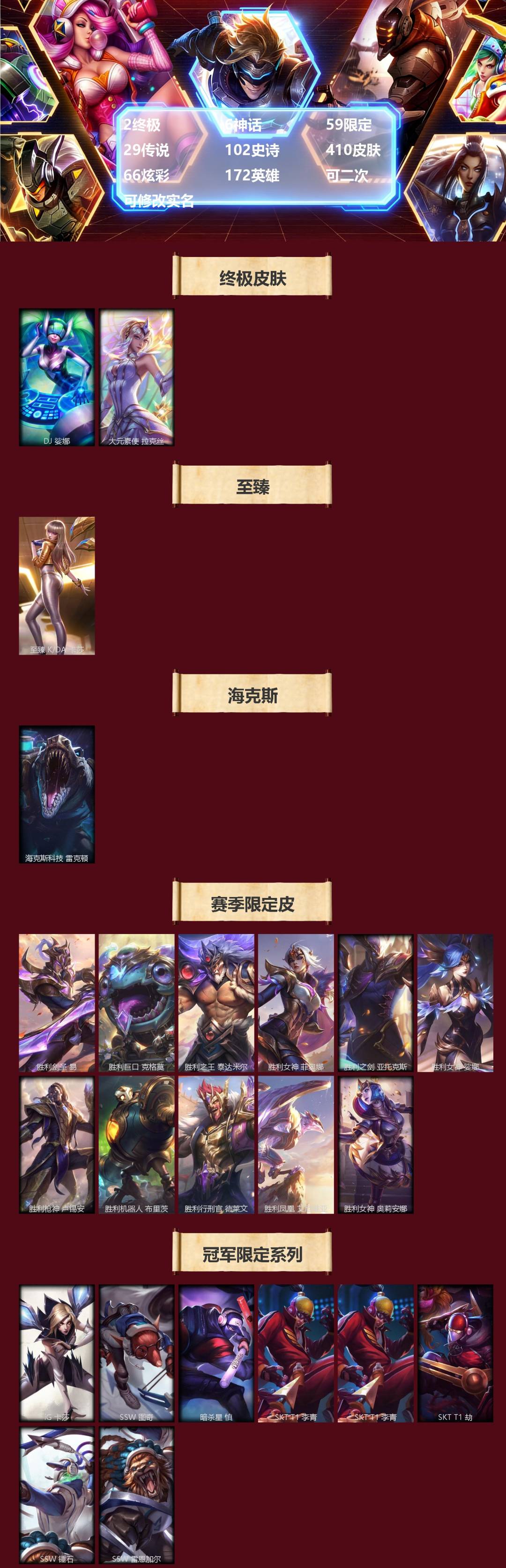 【681252】[18753506]2终极 6神话 59限定 29传说 102史诗 410皮肤 66炫彩 172英雄 可二次 可修改实名 【至臻】至臻 K/DA 卡莎 【海克斯】海克斯 雷克顿 【赛季限定皮】胜利行刑官 德莱文,胜利凤凰 艾尼维亚,胜利女神-菲奥娜,胜利剑圣 易,胜利女神 娑娜,胜利巨口 克格莫,胜利之王 泰达米尔,胜利女神 奥莉安娜,胜利之剑 亚托克斯,胜利枪神 卢锡安,胜利