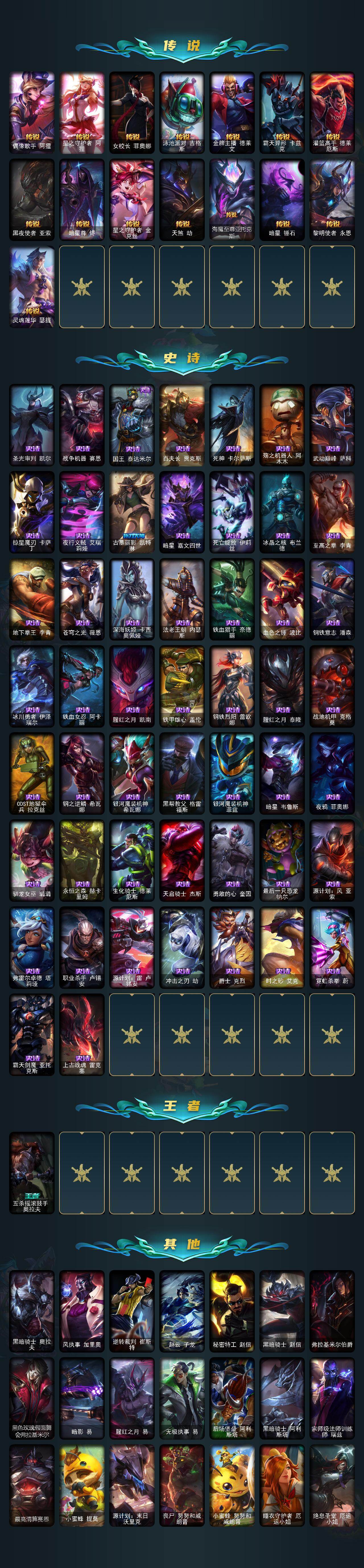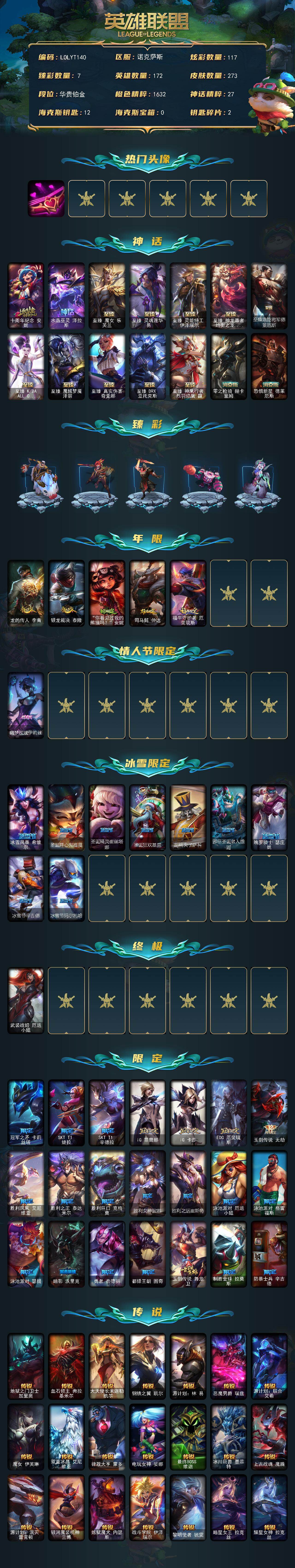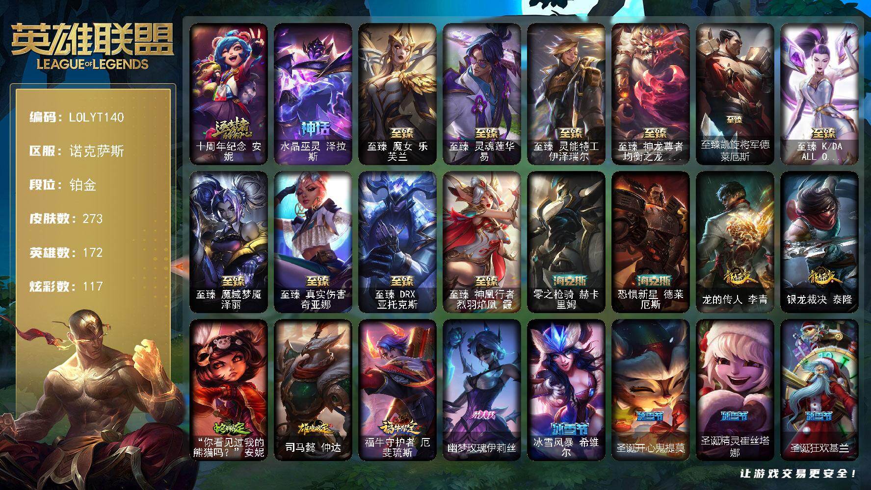 【681304】【LOLYT140】172英雄/273皮肤/1终极/14神话/36限定/7臻彩/117炫彩/36传说/51史诗/铂金/爱情之歌/十周年纪念安妮/水晶巫灵泽拉斯/至臻魔女乐芙兰/至臻灵魂莲华易/至臻灵能特工伊泽瑞尔/至臻神龙尊者均衡之龙沃利贝尔/至臻凯旋将军德莱厄斯/至臻K/DAALLOUT卡莎/至臻魔域梦魇泽丽/至臻真实伤害奇亚娜/至臻DRX亚托克斯/至臻神凰行者烈羽焰凰霞/零之