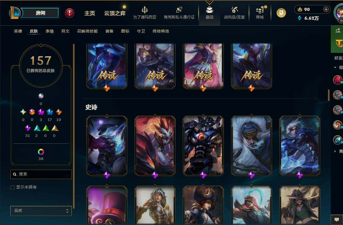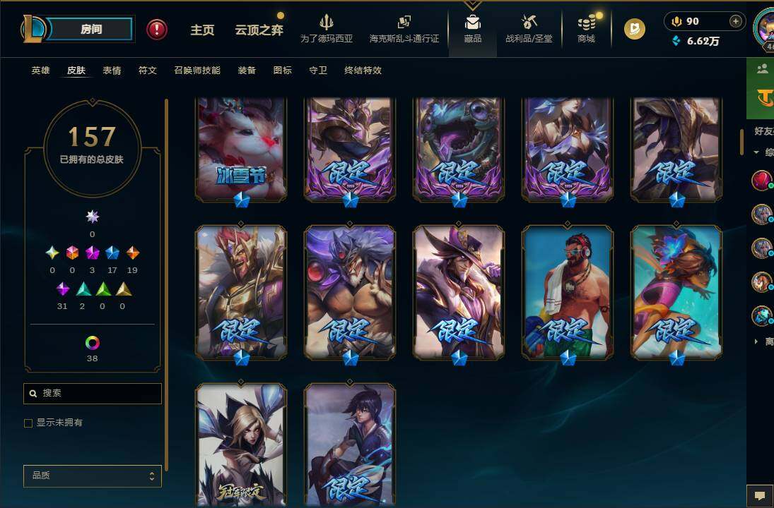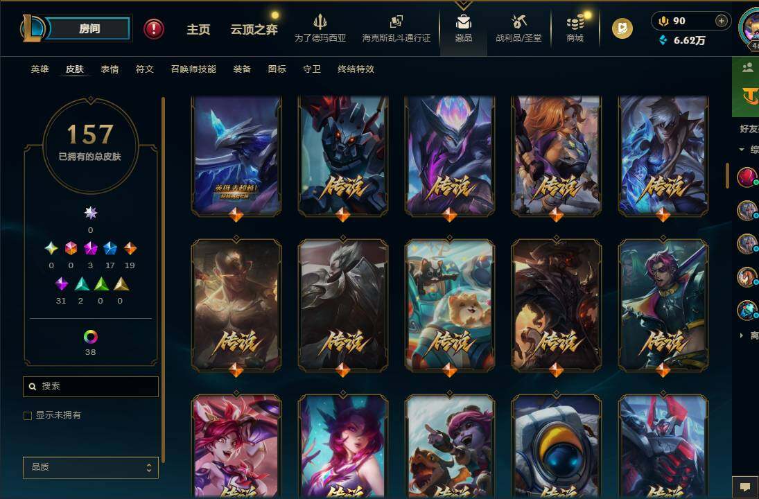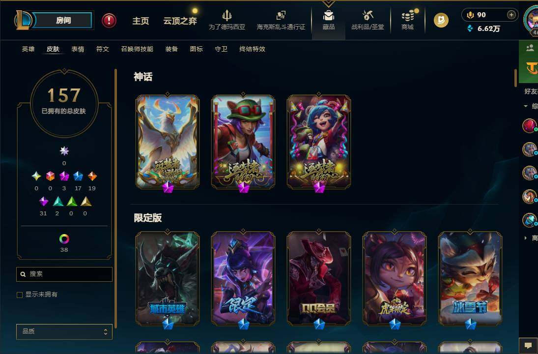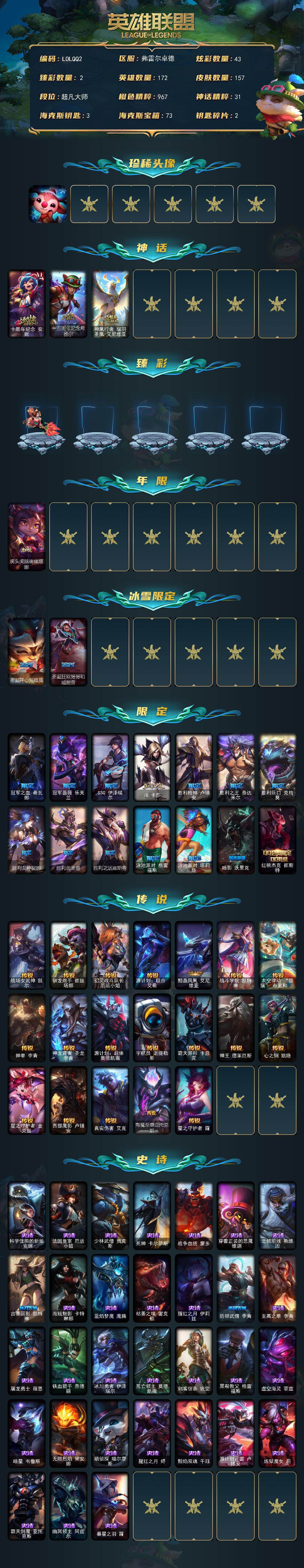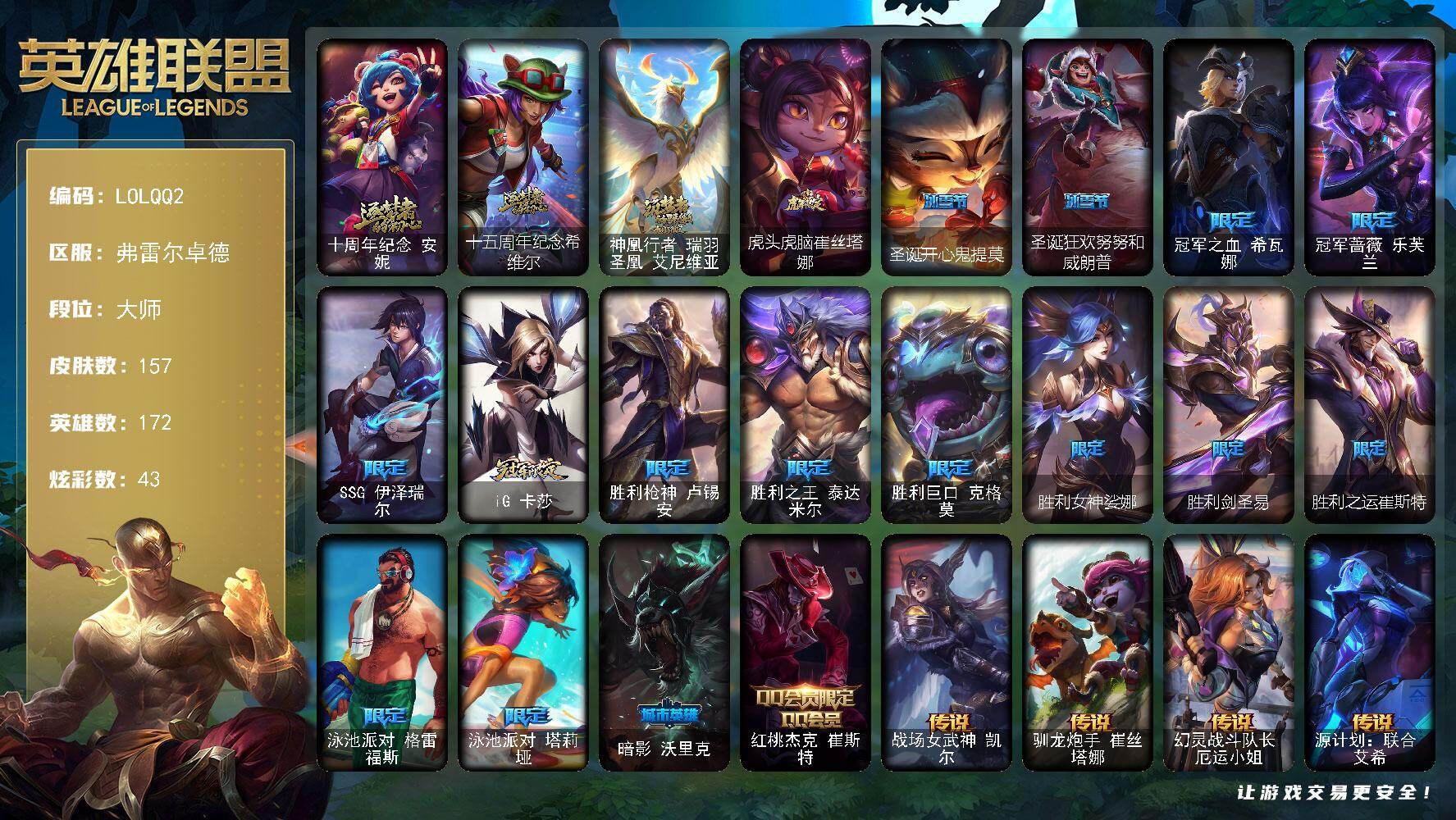 【685167】【LOLQQ2】172英雄/157皮肤/3神话/18限定/2臻彩/43炫彩/19传说/31史诗/大师/至爱的鹿/十周年纪念安妮/十五周年纪念希维尔/神凰行者瑞羽凤凰艾尼维亚/玉剑传说寒潭夭夭胭脂/魔女阿卡丽虚荣/虎头虎脑崔丝塔娜/圣诞开心鬼提莫/圣诞狂欢努努和威朗普/冠军之血希瓦娜/冠军蔷薇乐芙兰/SSG伊泽瑞尔/IG卡莎/胜利枪神卢锡安/胜利之王泰达米尔/胜利巨口克格莫/胜利女