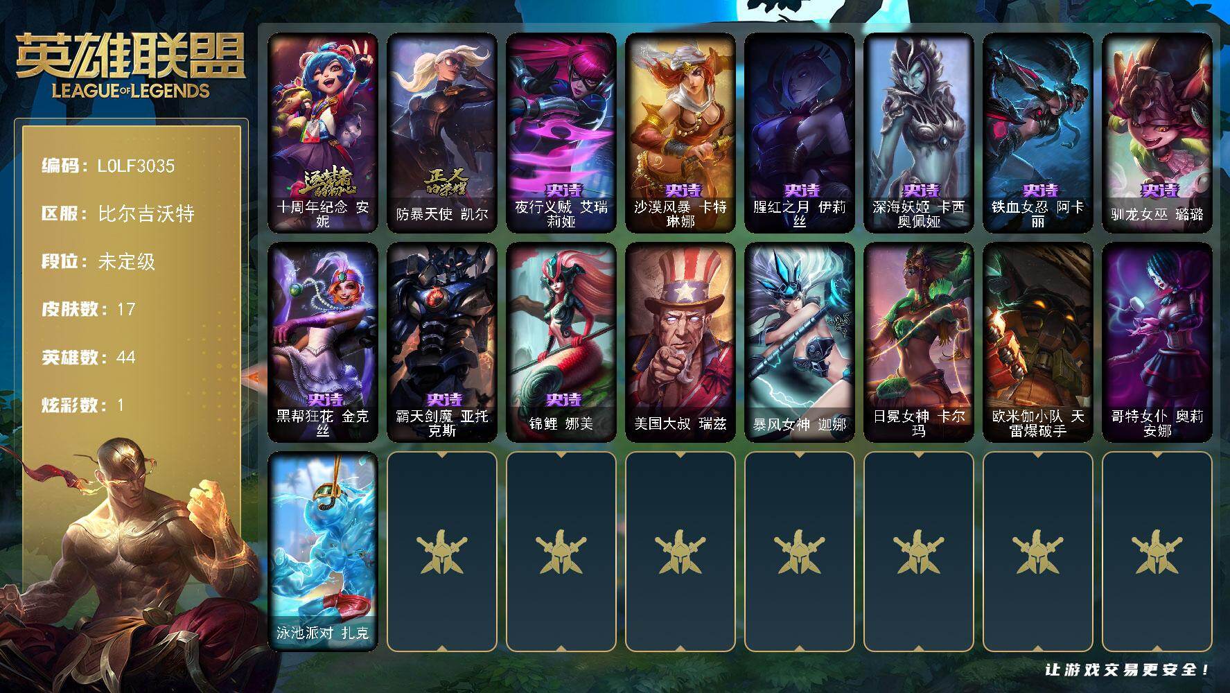 【686426】【LOLF3035】44英雄/17皮肤/1神话/1限定/1臻彩/1炫彩/9史诗/未定级/十周年纪念安妮/冠军之隐劫凯旋圣装/防暴天使凯尔/夜行义贼艾瑞莉娅/沙漠风暴卡特琳娜/腥红之月伊莉丝/深海妖姬卡西奥佩娅/铁血女忍阿卡丽/驯龙女巫璐璐/黑帮狂花金克丝/霸天剑魔亚托克斯/锦鲤娜美/美国大叔瑞兹/暴风女神迦娜/日冕女神卡尔玛/欧米伽小队天雷爆破手/哥特女仆奥莉安娜/泳池派对扎克