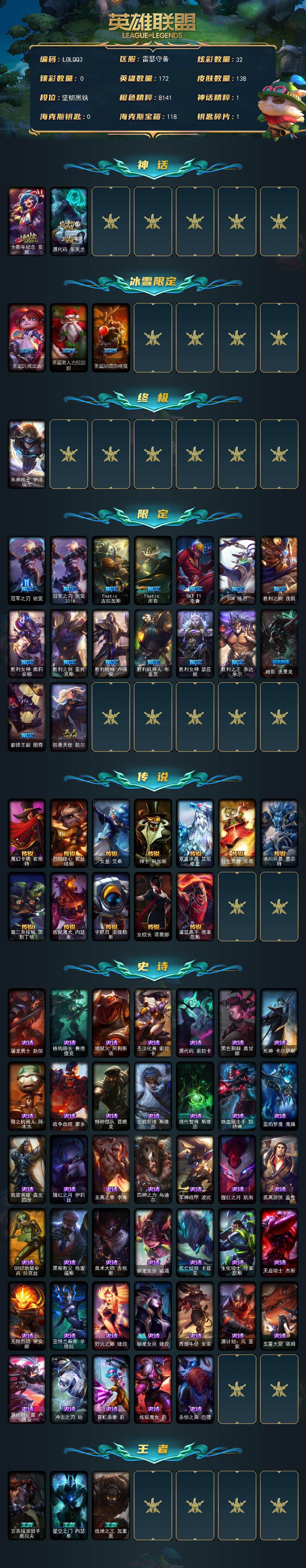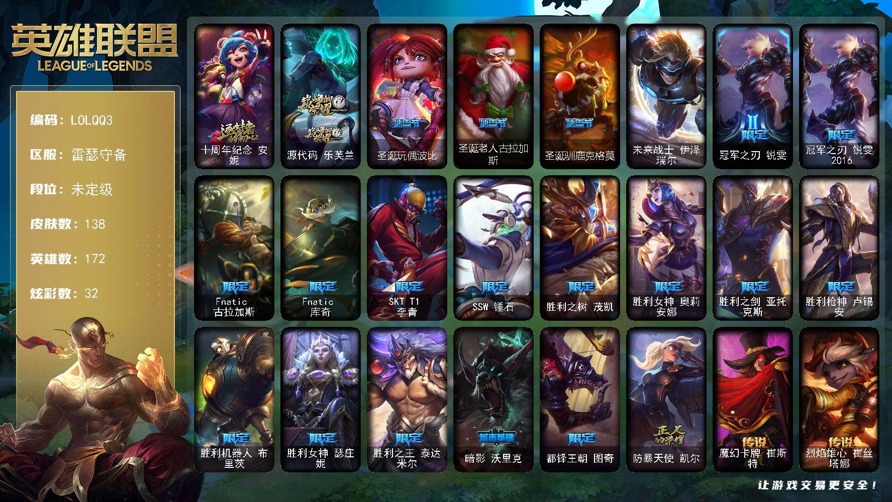 【686499】【LOLQQ3】172英雄/138皮肤/1终极/2神话/19限定/32炫彩/12传说/40史诗/未定级/十周年纪念安妮/源代码乐芙兰/圣诞玩偶波比/圣诞老人古拉加斯/圣诞驯鹿克格莫/未来战士伊泽瑞尔/冠军之刃锐雯/冠军之刃锐雯2018/Fnatic古拉加斯/Fnatic库奇/SKTT1李青/SSW锤石/胜利之树茂凯/胜利女神奥莉安娜/胜利之剑亚托克斯/胜利枪神卢锡安/胜利机器人布