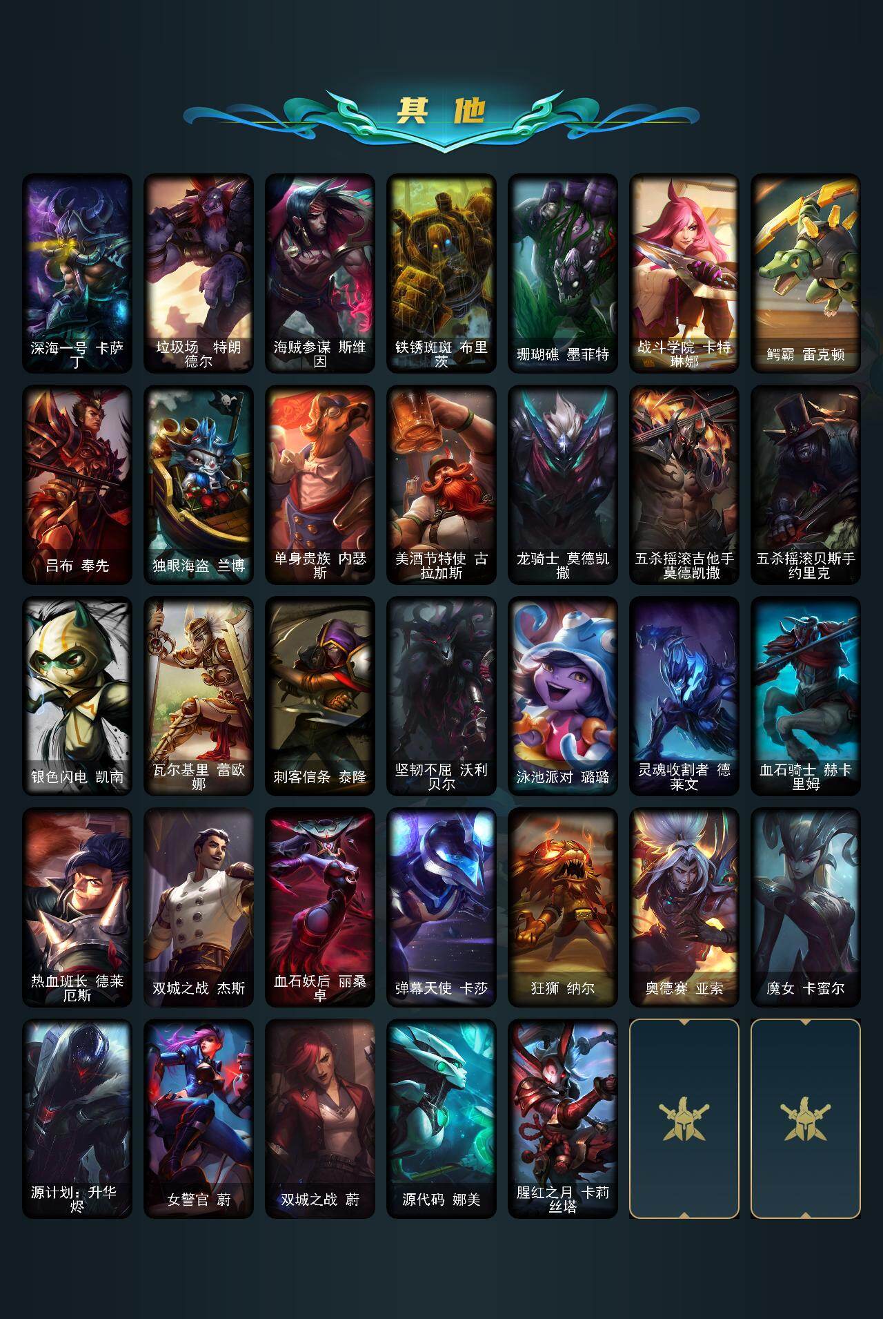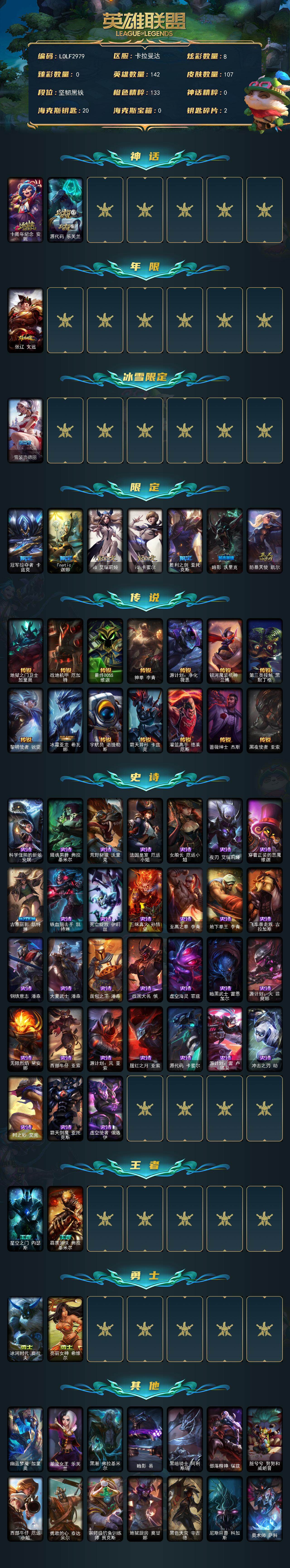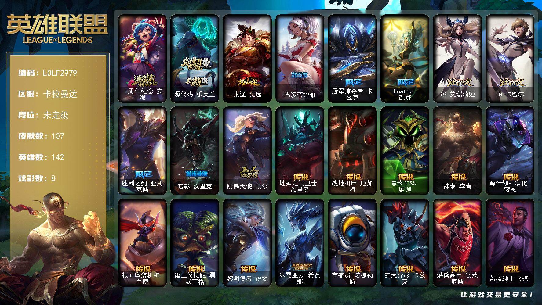 【686510】【LOLF2979】142英雄/107皮肤/2神话/9限定/8炫彩/14传说/31史诗/未定级/十周年纪念安妮/源代码乐芙兰/张辽文远/雪装奈德丽/冠军掠夺者卡兹克/Fnatic迦娜/IG艾瑞莉娅/IG卡密尔/胜利之剑亚托克斯/暗影妖狐阿狸/防暴天使凯尔/地狱之门卫士加里奥/战地机甲厄加特/最终BOSS维迦/神拳李青/源计划:净化薇恩/银河魔装机神兰博/第三类接触黑默丁格/黎明使