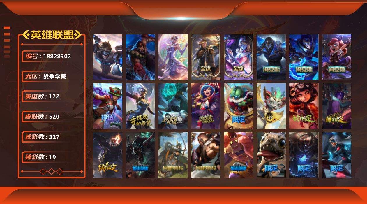 【689259】[18828302]【特价出售/店主推荐】未定级段位-172英雄-520皮肤-327炫彩-3终极-10神话-81限定-52传说-108史诗【热门头像】:爱意绵绵头像,银河魔装机神安妮头像【神话皮肤】:十周年纪念安妮,源代码乐芙兰,十五周年纪念希维尔,神凰行者瑞羽圣凰艾尼维亚,黎明使者卡尔玛【至臻皮肤】:至臻灵能特工伊泽瑞尔,至臻太空律动魔音海妖娜美【海克斯皮肤】:海克斯科技安妮,