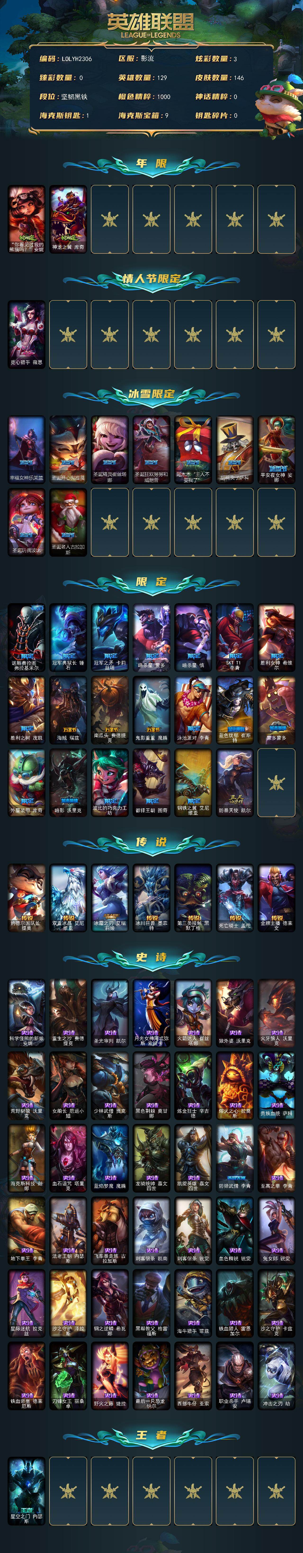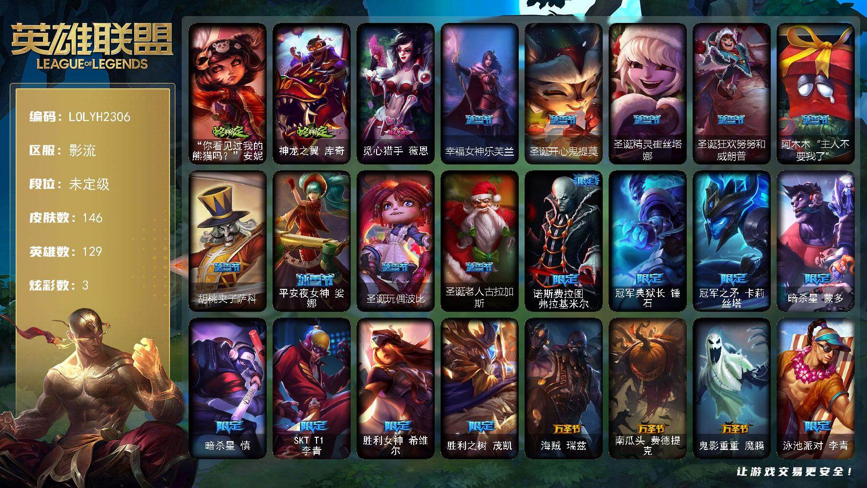 【689319】【LOLYH2306】129英雄/146皮肤/32限定/3炫彩/7传说/42史诗/未定级/“你看见过我的熊猫吗?”安妮/神龙之翼库奇/觅心猎手薇恩/幸福女神乐芙兰/圣诞开心鬼提莫/圣诞精灵崔丝塔娜/圣诞狂欢努努和威朗普/阿木木:“主人不要我了”/胡桃夹子萨科/平安夜女神娑娜/圣诞玩偶波比/圣诞老人古拉加斯/诺斯费拉图费拉基米尔/冠军典狱长锤石/冠军之矛卡莉斯塔/暗杀星蒙多/暗杀星