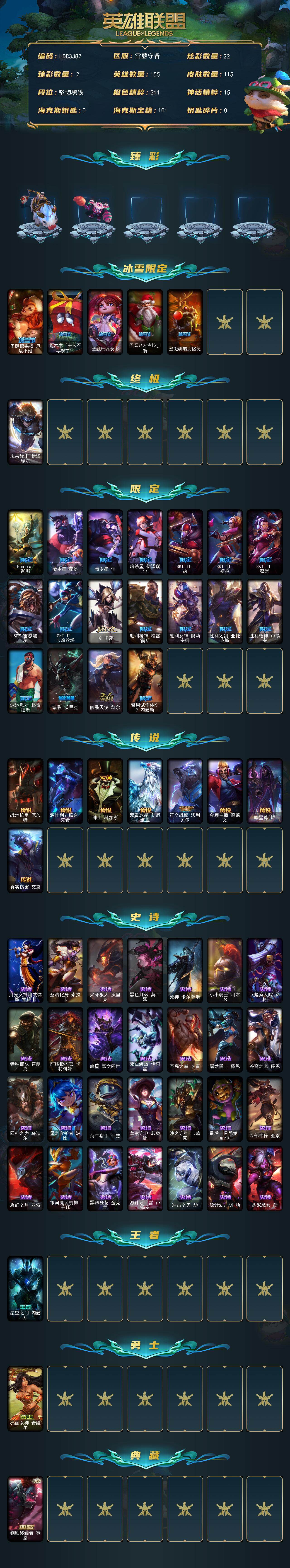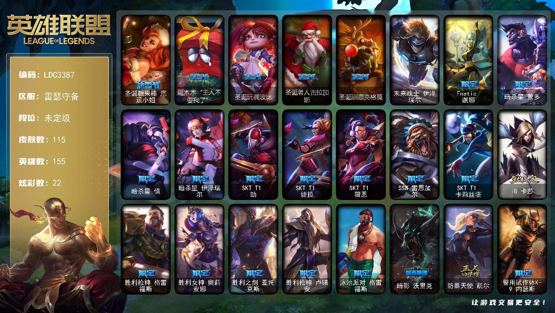 【690646】【LDC3387】155英雄/115皮肤/1终极/23限定/2臻彩/22炫彩/8传说/28史诗/未定级/无畏骑士瑟庄妮赤子初心/可爱可爱粉红红布里茨/圣诞糖果棒厄运小姐/阿木木:“主人不要我了”/圣诞玩偶波比/圣诞老人古拉加斯/圣诞驯鹿克格莫/未来战士伊泽瑞尔/Fnatic迦娜/暗杀星蒙多/暗杀星慎/暗杀星伊泽瑞尔/SKTT1劫/SKTT1婕拉/SKTT1薇恩/SSW雷恩加尔/S