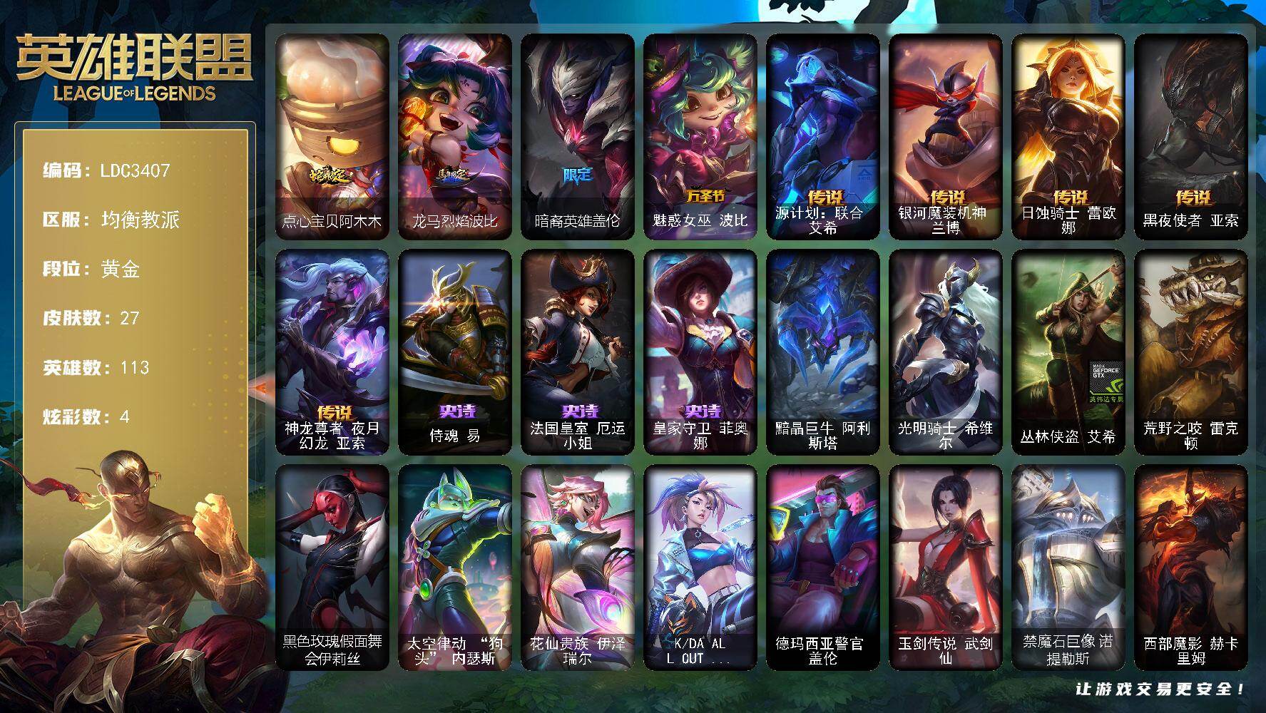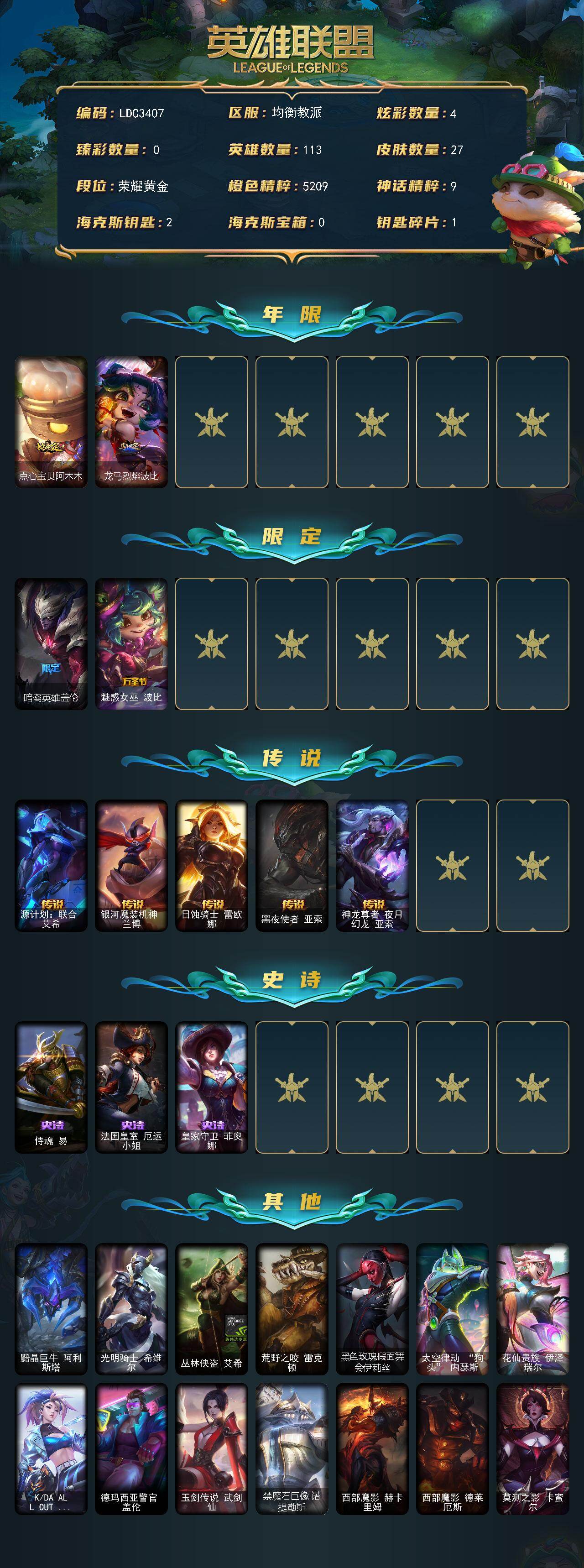 【691404】【LDC3407】113英雄/27皮肤/5限定/4炫彩/5传说/3史诗/黄金/点心宝贝阿木木/龙马烈焰波比/暗裔英雄盖伦/魅惑女巫波比/源计划:联合艾希/银河魔装机神兰博/日蚀骑士蕾欧娜/黑夜使者亚索/神龙尊者夜月幻龙亚索/侍魂易/法国皇室厄运小姐/皇家守卫菲奥娜/黯晶巨牛阿利斯塔/光明骑士希维尔/丛林侠盗艾希/荒野之咬雷克顿/黑色玫瑰假面舞会伊莉丝/太空律动狗头内瑟斯/花仙贵族