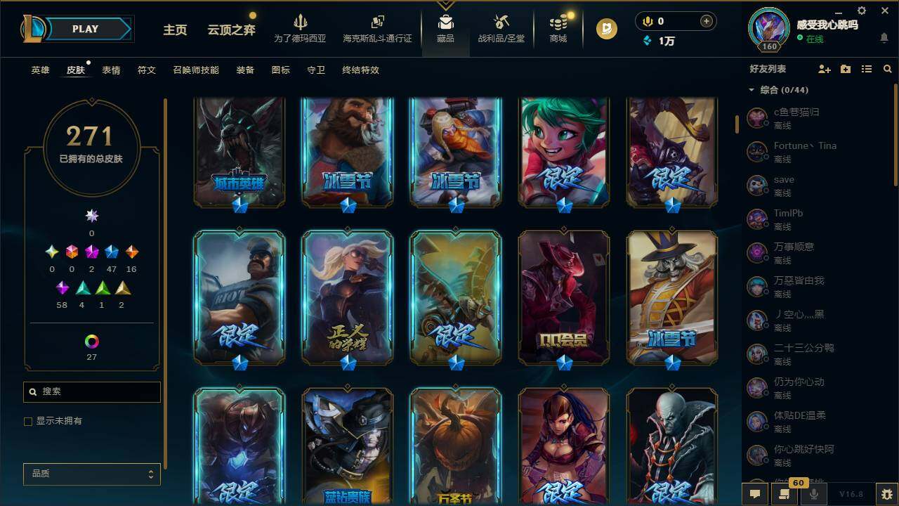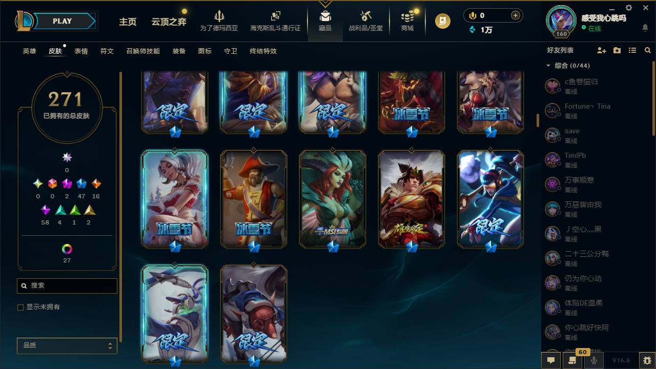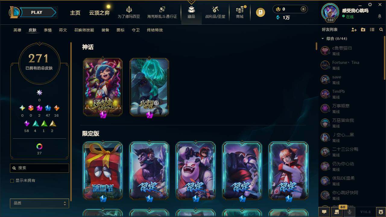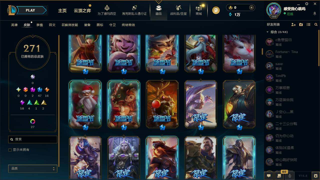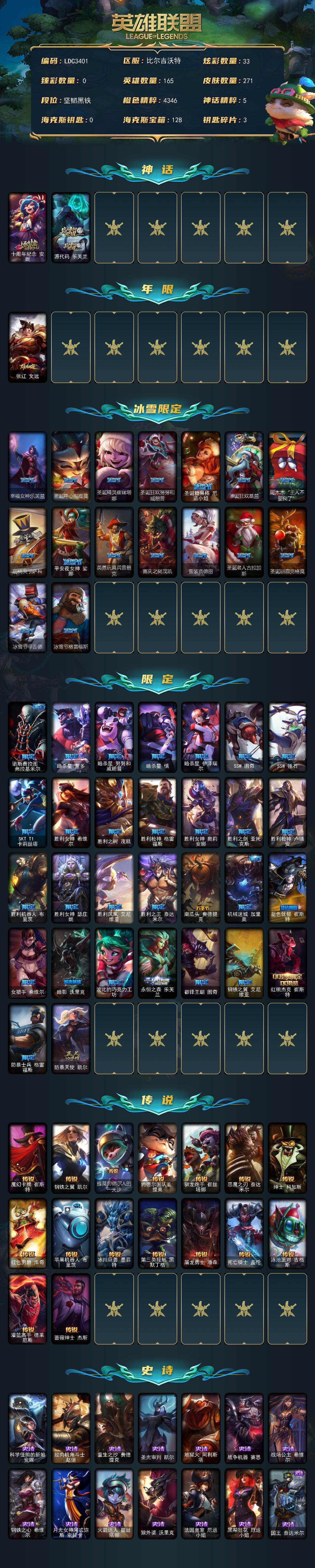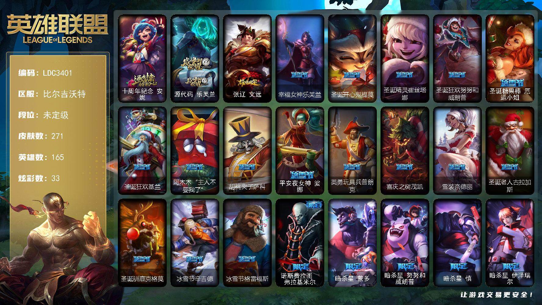 【691415】【LDC3401】165英雄/271皮肤/2神话/47限定/33炫彩/16传说/59史诗/未定级/十周年纪念安妮/源代码乐芙兰/张辽文远/幸福女神乐芙兰/圣诞开心鬼提莫/圣诞精灵崔丝塔娜/圣诞狂欢努努和威朗普/圣诞糖果棒厄运小姐/圣诞狂欢基兰/阿木木:“主人不要我了”/胡桃夹子萨科/平安夜女神娑娜/英勇玩具兵普朗克/喜庆之树茂凯/雪装奈德丽/圣诞老人古拉加斯/圣诞驯鹿克格莫/冰雪