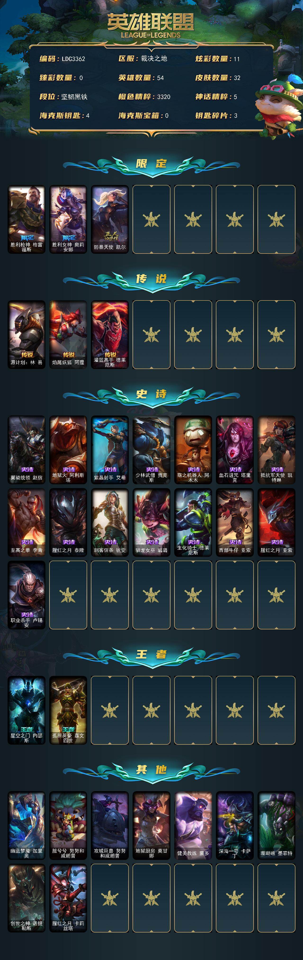 【691611】【LDC3362】54英雄/32皮肤/3限定/11炫彩/3传说/15史诗/未定级/胜利枪神格雷福斯/胜利女神奥莉安娜/防暴天使凯尔/源计划:林易/焰尾妖狐阿狸/灌篮高手德莱厄斯/翼装统领赵信/地狱火阿利斯塔/紫晶射手艾希/少林武僧贾克斯/殇之机器人阿木木/血石诅咒塔里克/抵抗军天使凯特琳/至高之拳李青/腥红之月泰隆/刺客信条锐雯/驯龙女巫璐璐/生化骑士德莱厄斯/西部牛仔亚索/腥红