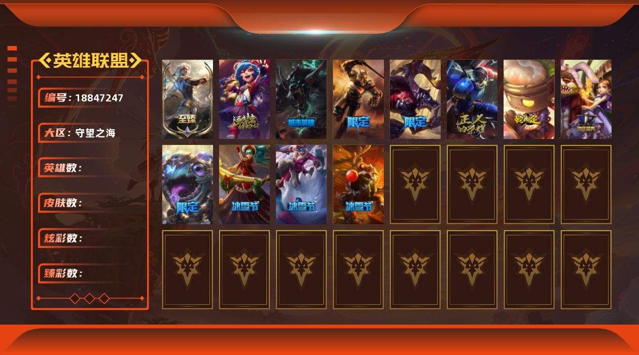 【692373】[18847247]A12941/守望之海/可二次/【224皮肤/82炫彩/3神话/21限定/24传说】【神凰行者瑞羽圣凰艾尼维亚/十周年纪念安妮/至臻黑夜使者凯隐】安妮梦游仙境/暗影沃里克/点心宝贝 阿木木/都铎王朝 图奇/防暴天使 凯尔/警用试作体K-9内瑟斯/南瓜头 费德提克/平安夜女神 娑娜/魄罗骑士 瑟庄妮/圣诞驯鹿 克格莫/胜利巨口 克格莫/胜利女神 菲奥娜/详情看图