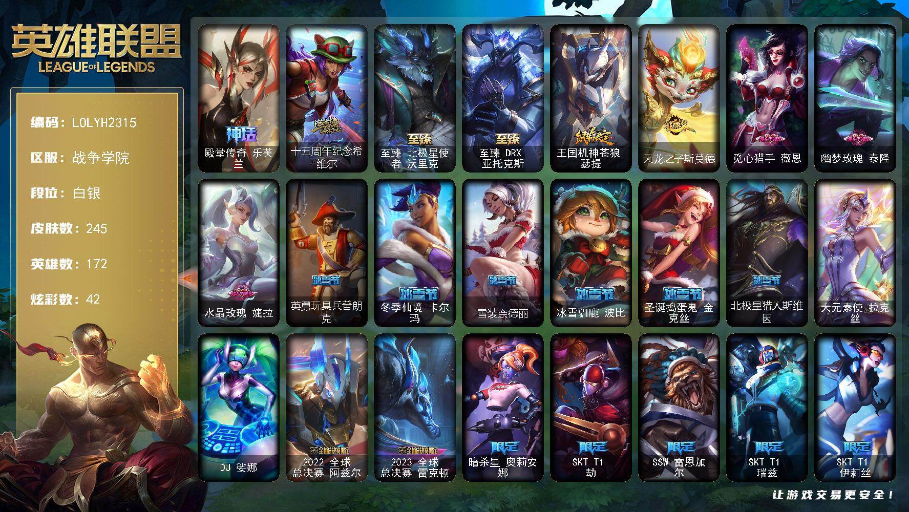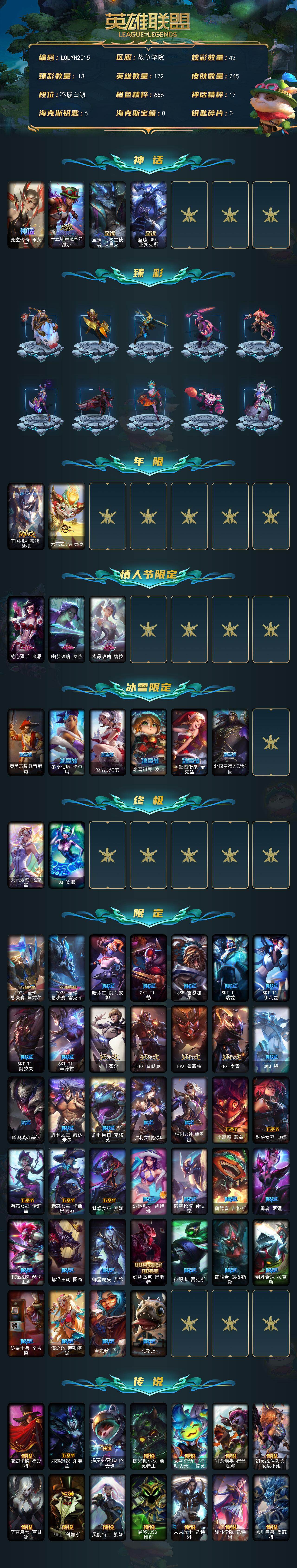 【692887】【LOLYH2315】172英雄/245皮肤/2终极/4神话/51限定/13臻彩/42炫彩/32传说/27史诗/白银/殿堂传奇乐芙兰/十五周年纪念希维尔/至臻北极星使者沃里克/至臻DRX亚托克斯/无畏骑士瑟庄妮赤子初心/征服者韦鲁斯炫金/冠军之矛卡莉丝塔凯旋圣装/源计划毁灭派克幻灭/女帝卡特琳娜纹章之刻印英勇/星之守护者金克丝黑洞/西部天使赛娜贝利尔之怠/灵魂莲华锐雯流火/可爱可