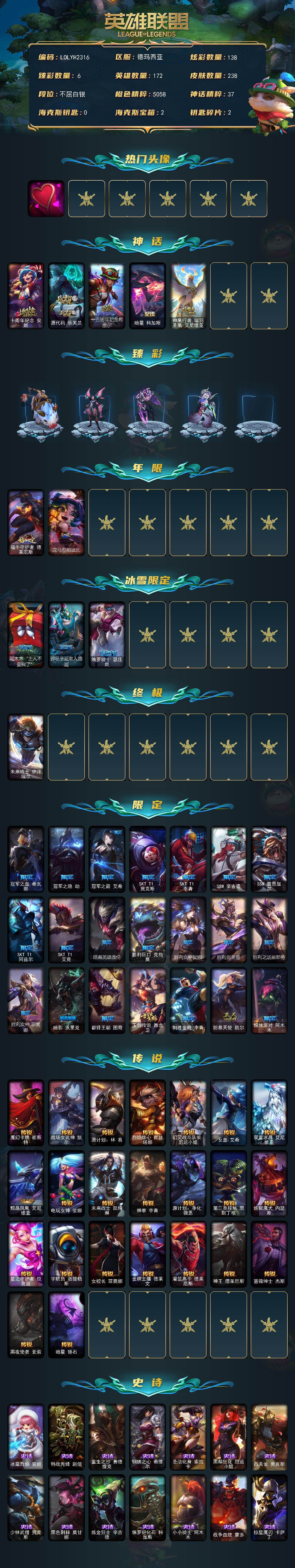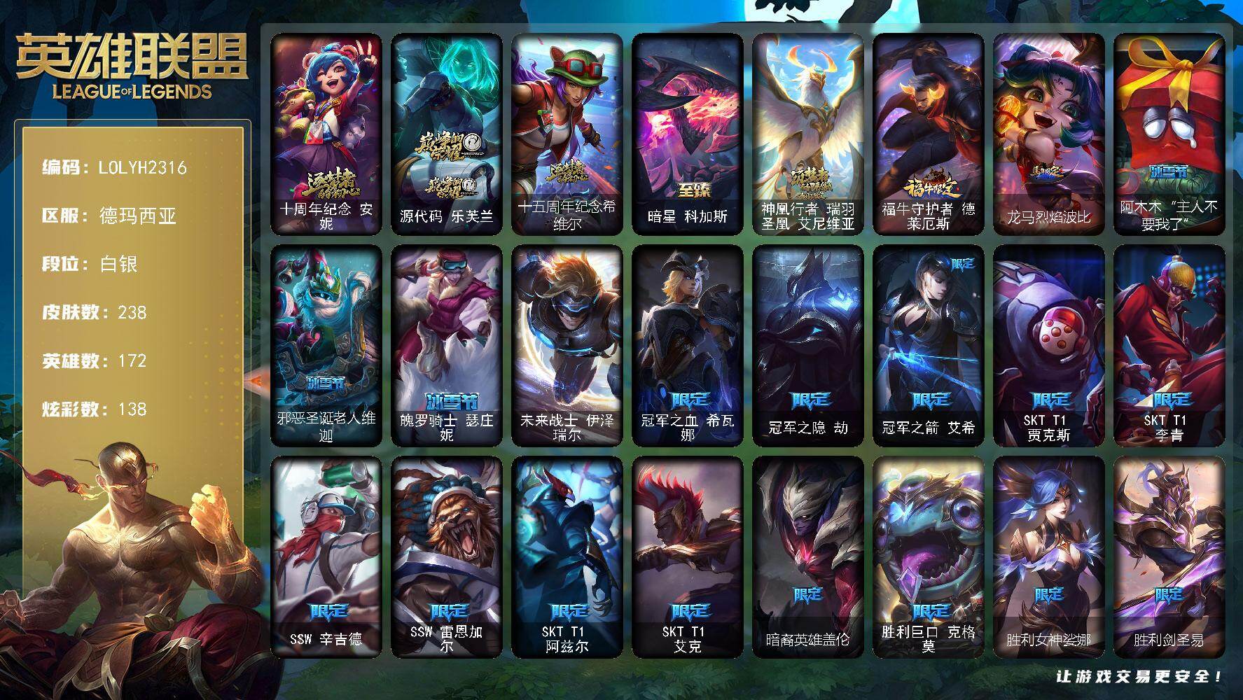 【692922】【LOLYH2316】172英雄/238皮肤/1终极/5神话/27限定/6臻彩/138炫彩/23传说/59史诗/白银/爱意绵绵/十周年纪念安妮/源代码乐芙兰/十五周年纪念希维尔/暗星科加斯/神凰行者瑞羽凤凰艾尼维亚/无畏骑士瑟庄妮赤子初心/弹幕天使卡莎炽天使勇敢/天煞劫恒星游历者/魔女阿卡丽虚荣/净雪之月莫甘娜冬虹/福牛守护者德莱厄斯/龙马烈焰波比/阿木木:“主人不要我了”/邪恶