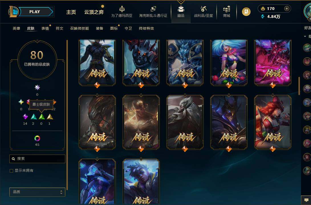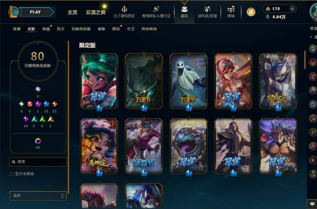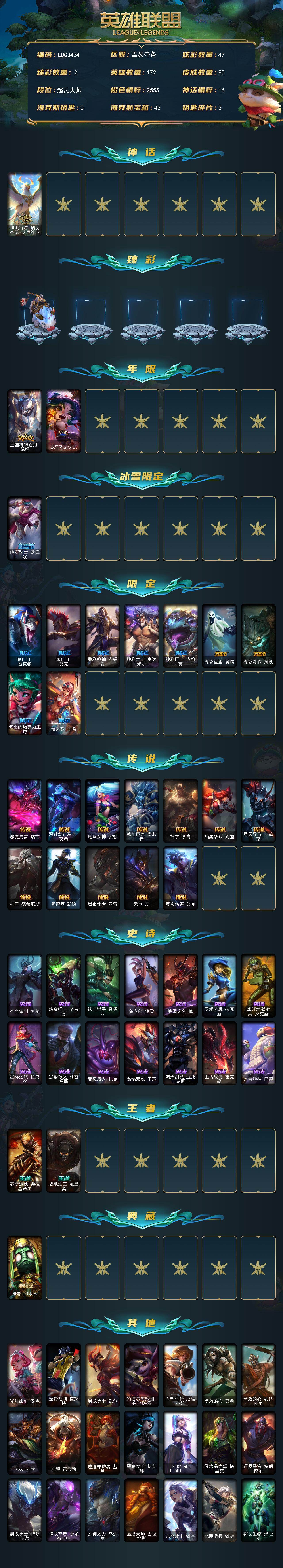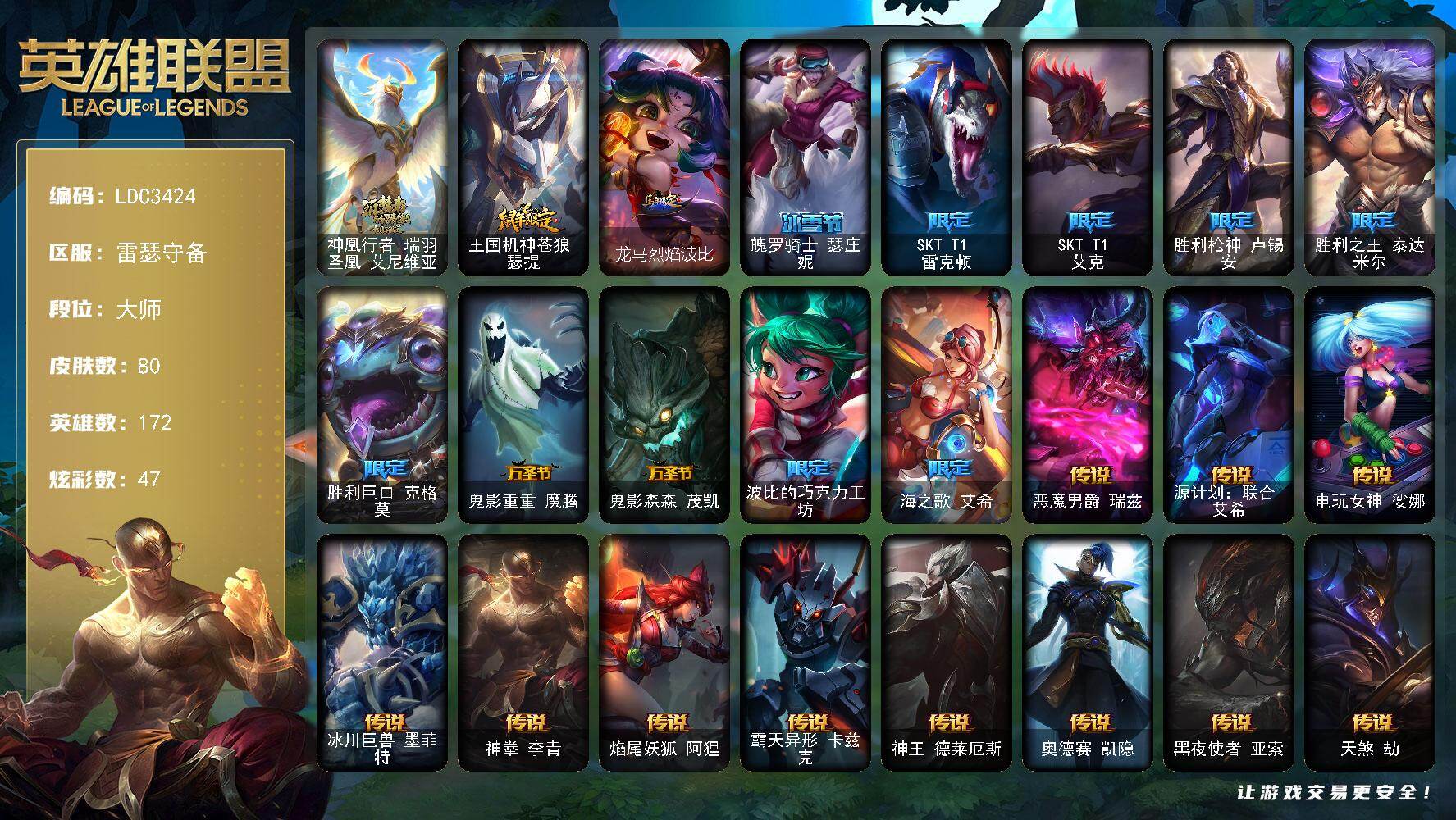 【692964】【LDC3424】172英雄/80皮肤/1神话/12限定/2臻彩/47炫彩/12传说/14史诗/大师账号等级:476/神凰行者瑞羽凤凰艾尼维亚/无畏骑士瑟庄妮赤子初心/王国机神苍狼瑟提/龙马烈焰波比/魄罗骑士瑟庄妮/SKTT1雷克顿/SKTT1艾克/胜利枪神卢锡安/胜利之王泰达米尔/胜利巨口克格莫/鬼影重重魔腾/鬼影森森茂凯/波比的巧克力工坊/海之歌艾希/恶魔男爵瑞兹/源计划:联