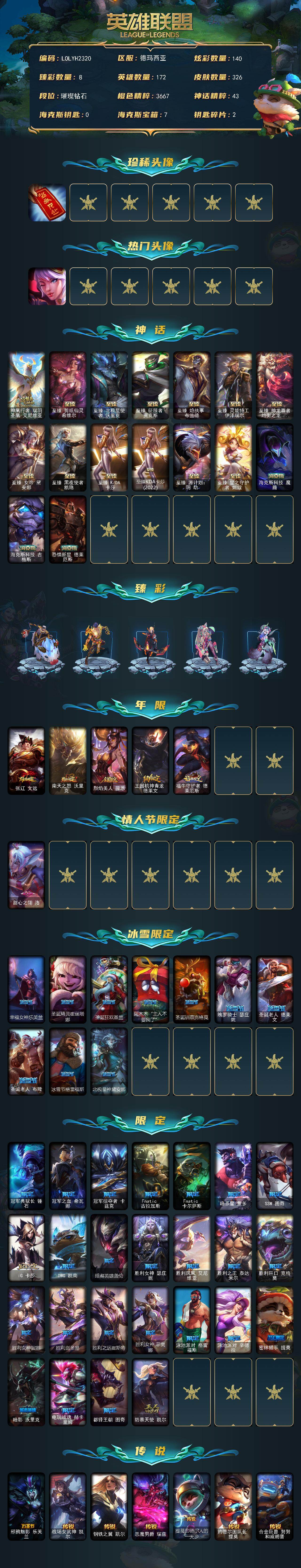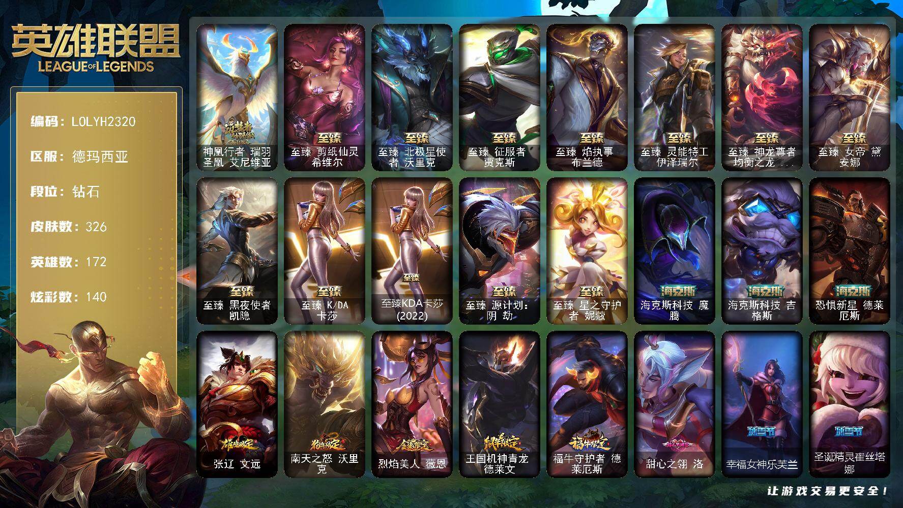 【693085】【LOLYH2320】172英雄/326皮肤/16神话/42限定/8臻彩/140炫彩/39传说/62史诗/钻石/红包/觅心之翼奎因/神凰行者瑞羽凤凰艾尼维亚/至臻剪纸仙灵希维尔/至臻北极星使者沃里克/至臻征服者贾克斯/至臻焰执事布兰德/至臻灵能特工伊泽瑞尔/至臻神龙尊者均衡之龙沃利贝尔/至臻女帝黛安娜/至臻黑夜使者凯隐/至臻K/DA卡莎/至臻KDA卡莎(2022)/至臻源计划:阴