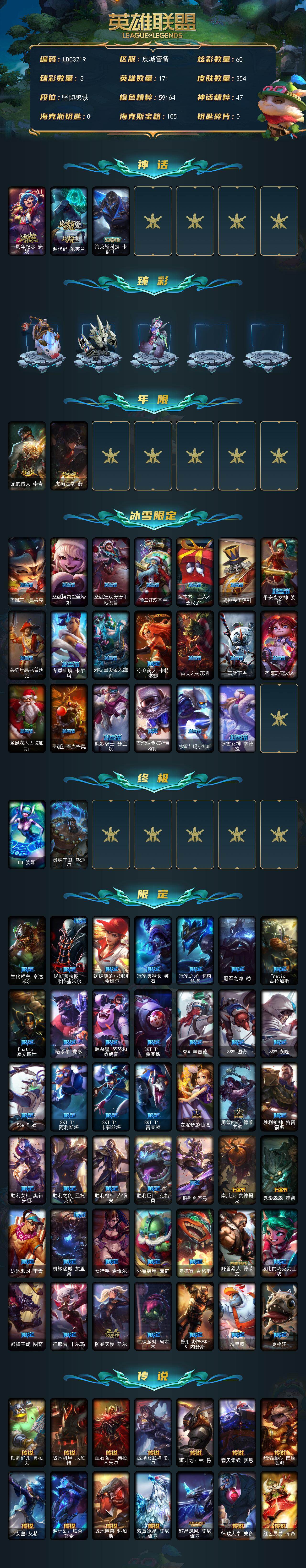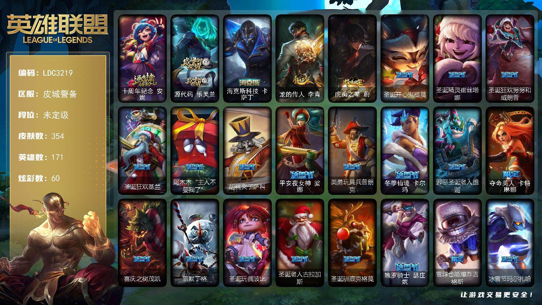 【693266】【LDC3219】171英雄/354皮肤/2终极/3神话/64限定/5臻彩/60炫彩/35传说/84史诗/未定级/十周年纪念安妮/源代码乐芙兰/海克斯科技卡萨丁/天龙之子卡莎飞龙乘云/无畏骑士瑟庄妮赤子初心/霸天巨兽雪崩墨菲特/魔女阿卡丽虚荣/净雪之月莫甘娜冬虹/龙的传人李青/虎痴之拳蔚/圣诞开心鬼提莫/圣诞精灵崔丝塔娜/圣诞狂欢努努和威朗普/圣诞狂欢基兰/阿木木:“主人不要我了