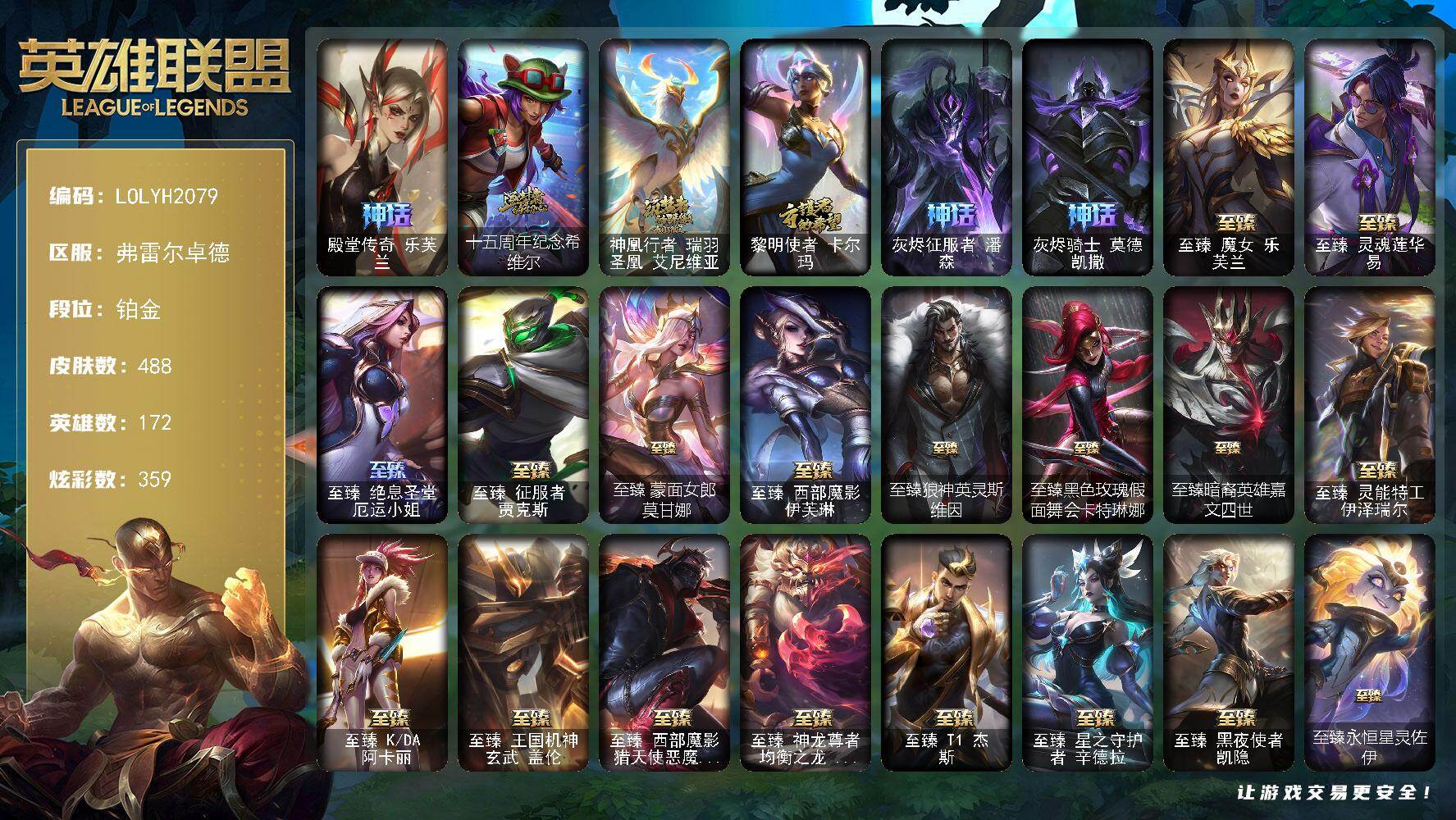 【693375】【LOLYH2079】172英雄/488皮肤/3终极/36神话/77限定/16臻彩/359炫彩/41传说/91史诗/铂金账号等级:629/觅心之翼奎因/殿堂传奇乐芙兰/十五周年纪念希维尔/神凰行者瑞羽凤凰艾尼维亚/黎明使者卡尔玛/灰烬征服者潘森/灰烬骑士莫德凯撒/至臻魔女乐芙兰/至臻灵魂莲华易/至臻绝息圣堂厄运小姐/至臻征服者贾克斯/至臻蒙面女郎莫甘娜/至臻西部魔影伊芙琳/至臻狼