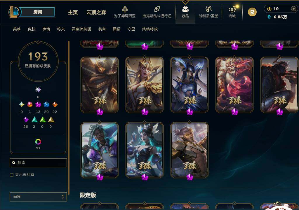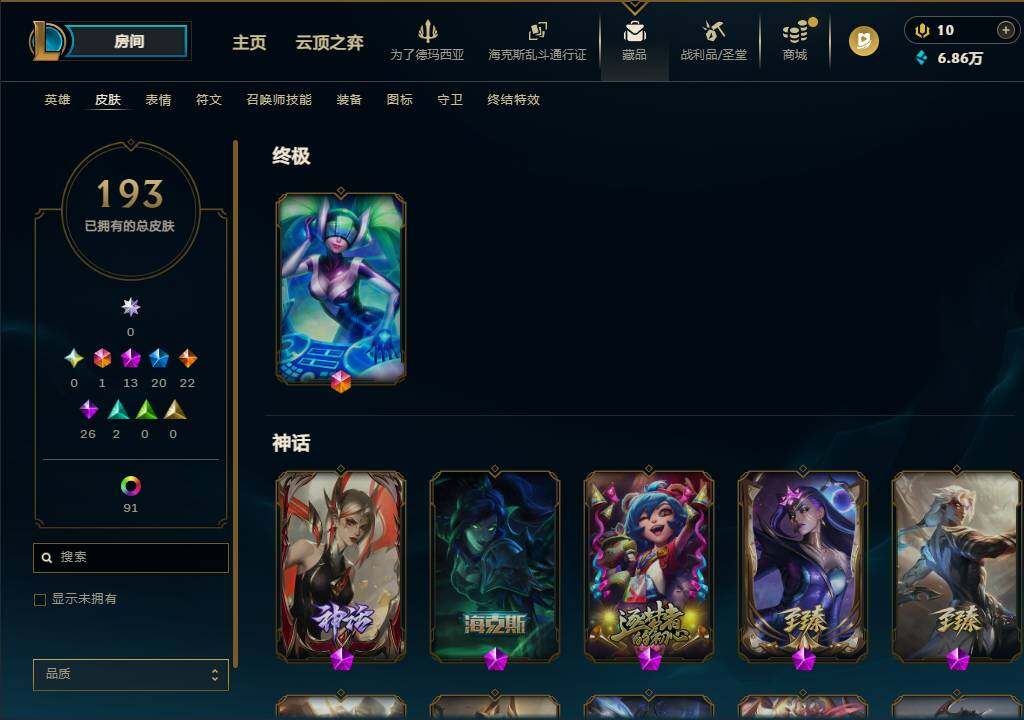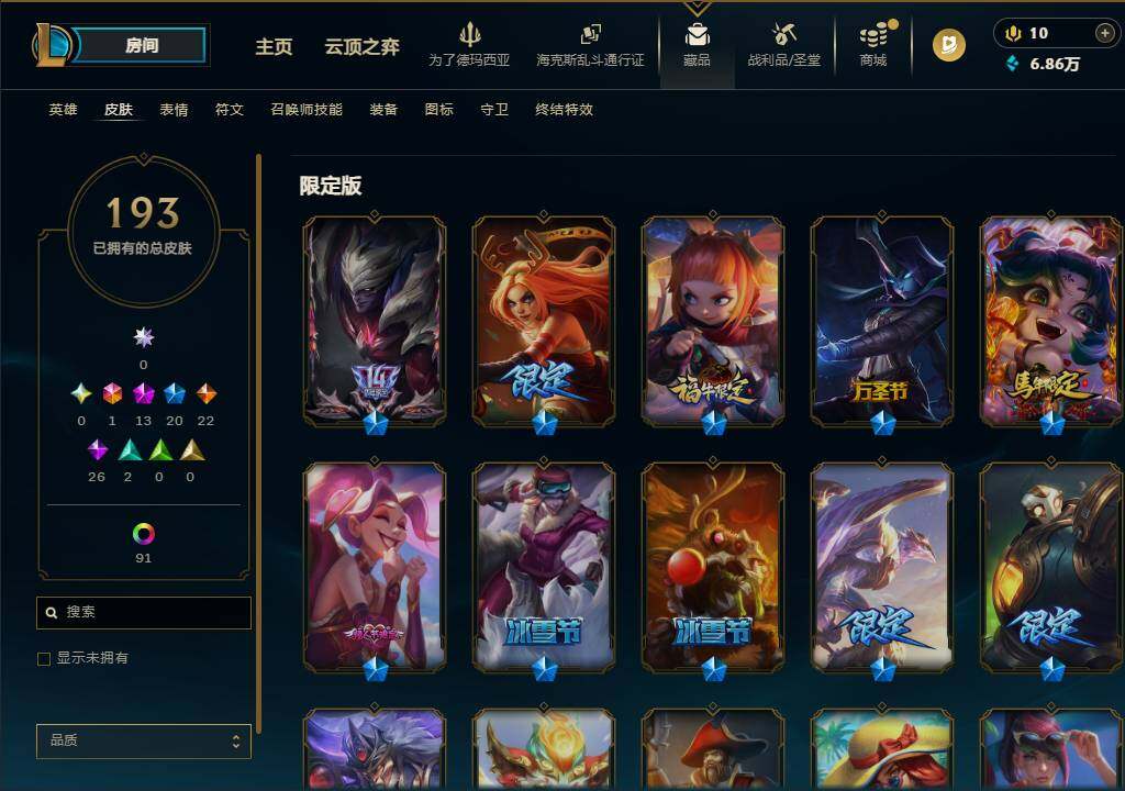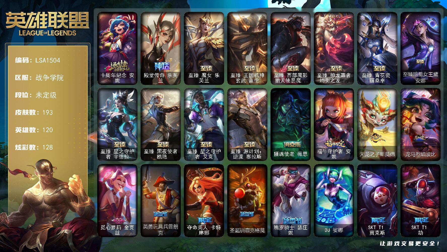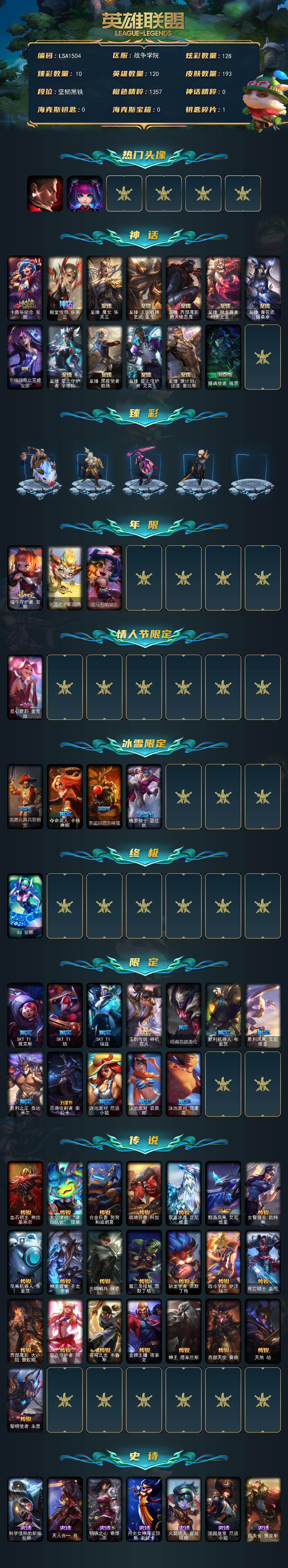 【693585】【LSA1504】120英雄/193皮肤/1终极/13神话/20限定/10臻彩/128炫彩/22传说/26史诗/未定级账号等级:308/觅心游侠卢锡安/银河魔装机神安妮/十周年纪念安妮/殿堂传奇乐芙兰/至臻魔女乐芙兰/至臻王者机甲玄武盖伦/至臻西部魔影猎天使恶魔泰隆/至臻神龙尊者均衡之龙沃利贝尔/至臻青花瓷丽桑卓/至臻暗星女王黛安娜/至臻星之守护者辛德拉/至臻黑夜使者凯隐/至臻星
